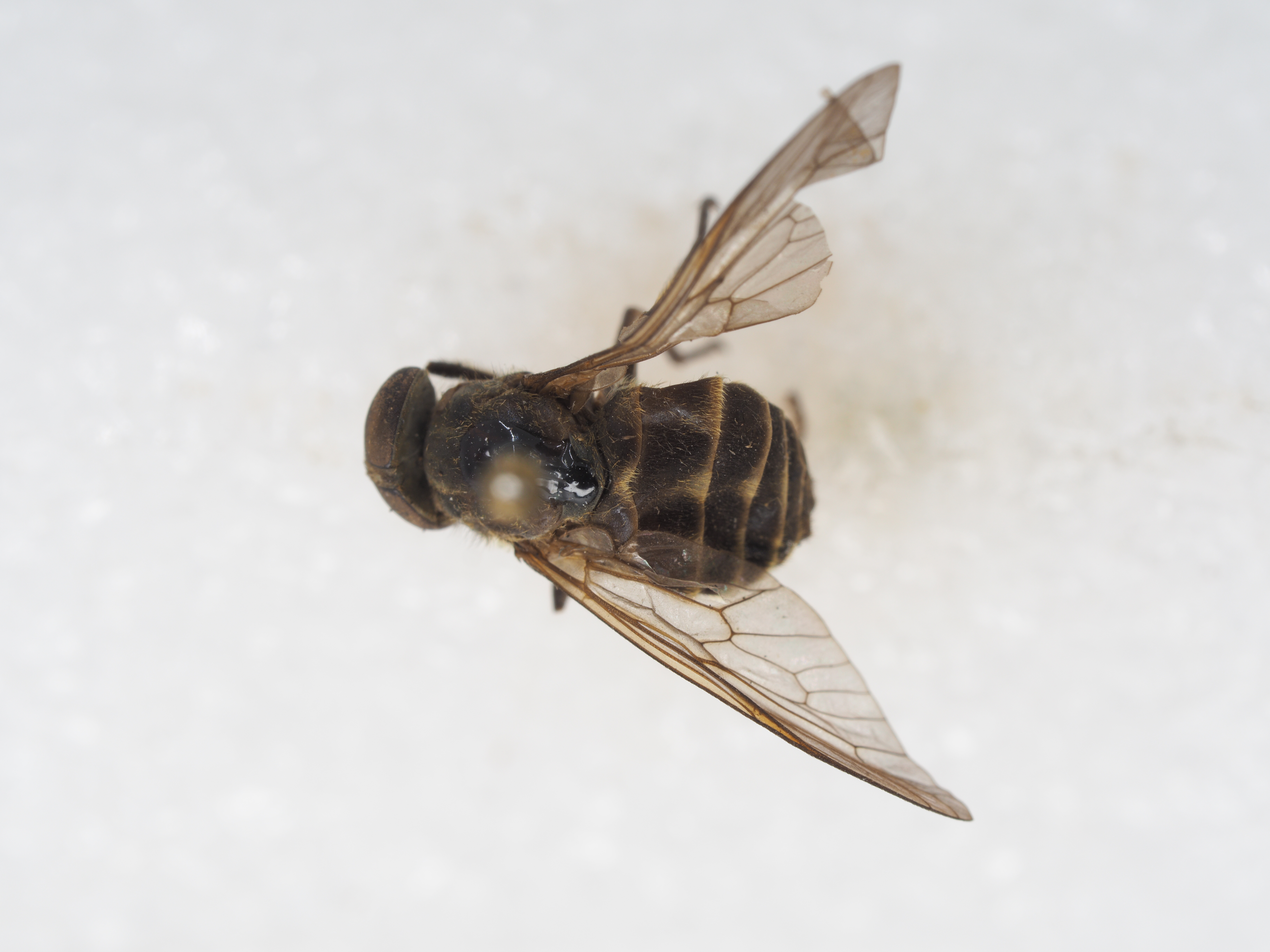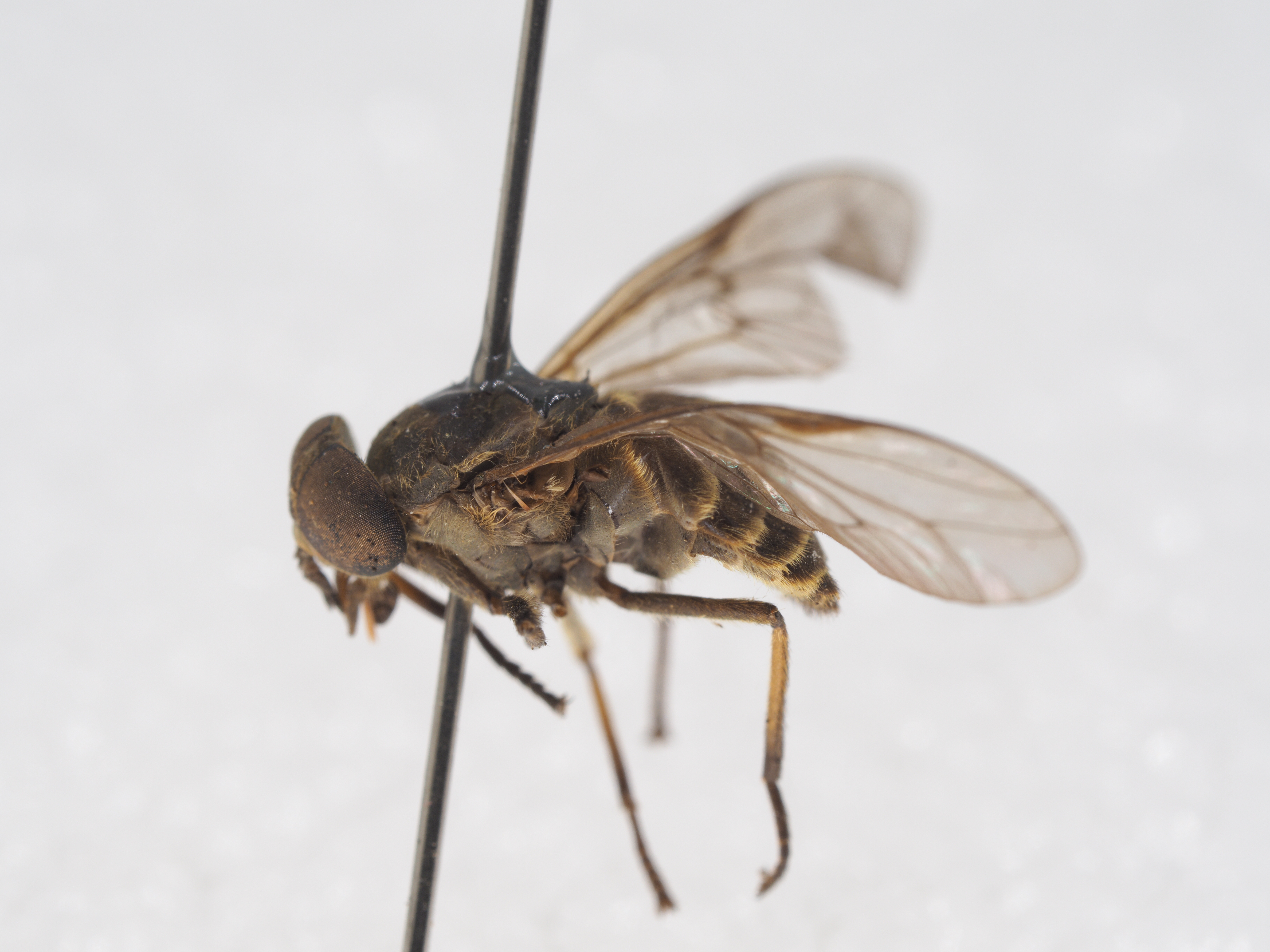 胸部:盾片和小盾片黑色,着生金黄毛夹杂黑毛,无明显纵条。侧板灰黑色,着生浅黄毛。足基节和股节色同侧板,着生浅黄毛,胫节棕色,着生黄毛夹杂黑毛,胫节端部及跗节黑色,着生黑毛。翅透明,r4脉无附脉,第一后室宽开放;平衡棒棕黑色。
