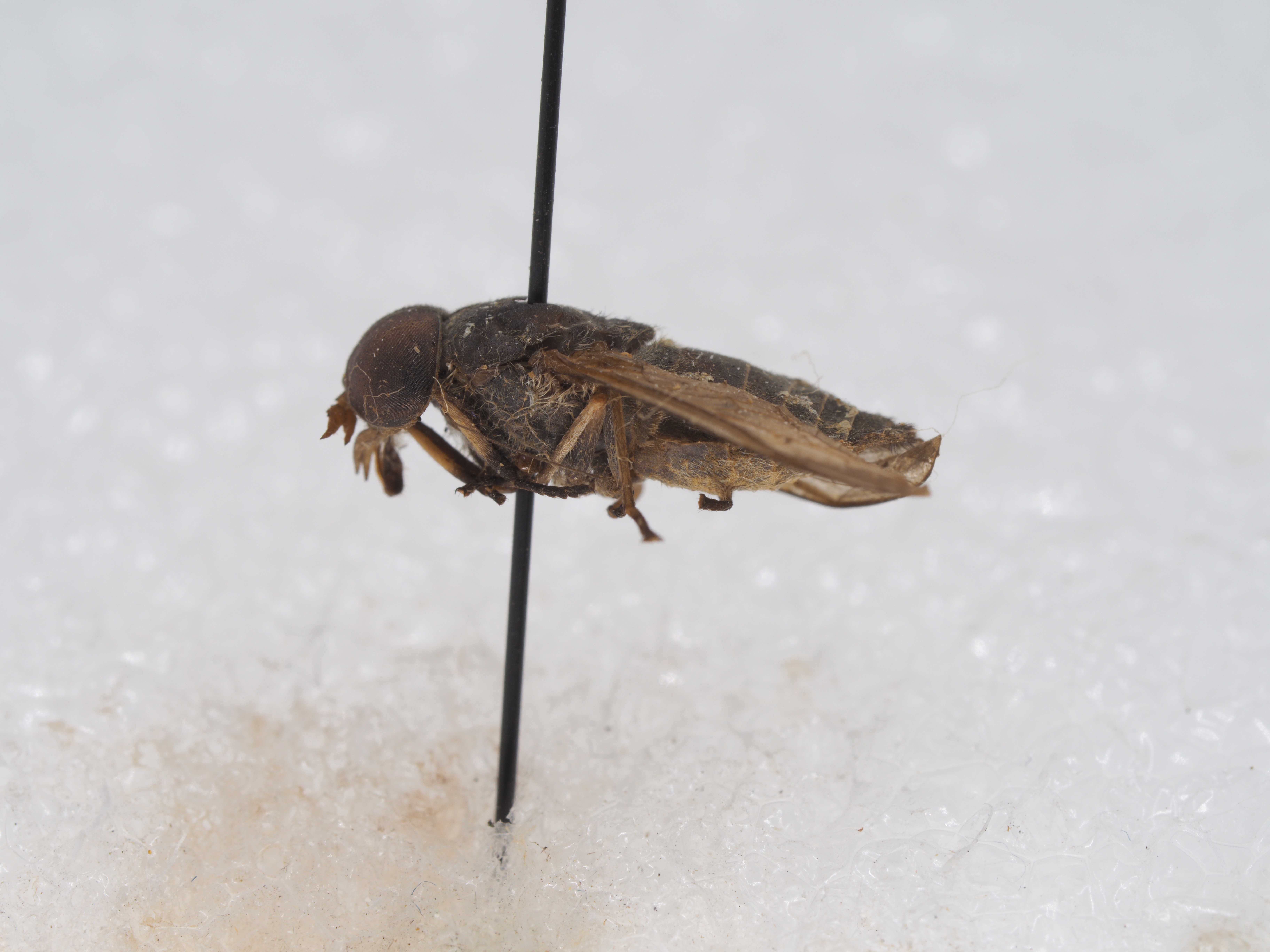 胸部:盾片和小盾片黑褐色,着生黑毛夹杂黄毛,无浅色纵条。侧板灰黑色,着生黄毛夹杂黑毛,足基节色同侧板;前足股节棕黑色着生黑毛,中、后足股节基半部色同基节,端半部浅棕色,着生浅色毛;前足胫节大部和中、后足胫节棕色,着生浅色毛夹杂黑毛;前足胫节端部和跗节棕黑色,着生黑毛夹杂浅色毛。翅透明,r4脉无付脉,第一后室开放。平衡棒棕色。