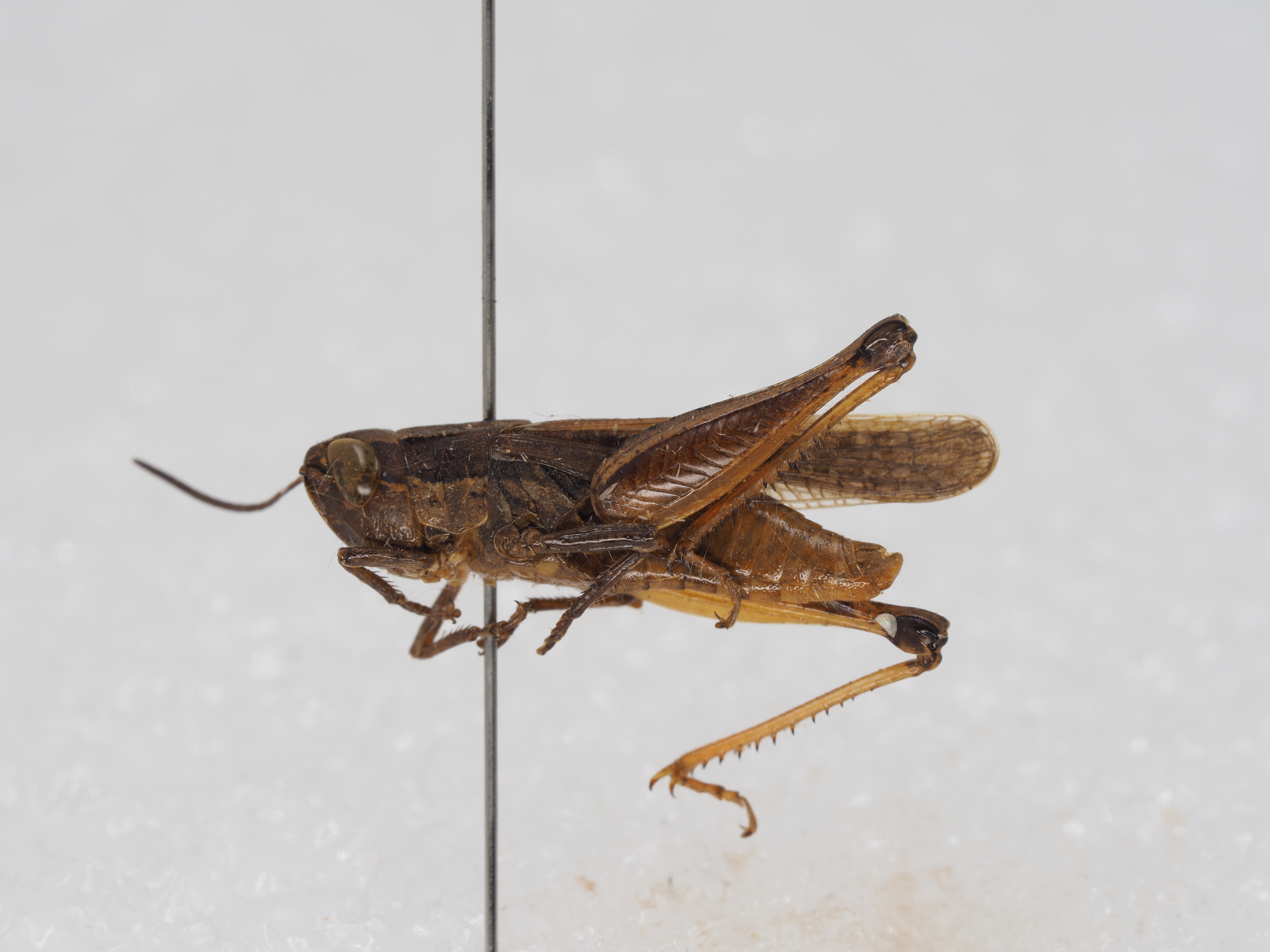 描述:雄性 体小型。头顶宽短,在复眼前缘之宽大于长,侧缘明显隆起,顶端狭圆形,背面具中隆线。头侧窝为长方形,其长为宽的2倍,背面可见。颜面向后倾斜与头顶形成圆角形;颜面隆起宽平,两侧缘在中央单眼之下近平行,中央具粗刻点。触角粗短,仅达前胸背板后缘,中段一节的长约为宽的1.3倍。复眼较大,卵形,其纵径约为横径的1.3倍,为眼下沟长的2.4倍。前胸背板前缘较平,后缘为钝角形突出;中隆线较明显,侧隆线在沟前区近平行,在沟后区略扩大,侧隆线间最狭处小于最宽处的1.5倍;三条横沟均切断侧隆线,仅后横沟切断中隆线;后横沟位于近中部,沟前区的长度略短于沟后区。中胸腹板侧叶间之中隔为梯形;后胸腹板侧叶在后端相互毗连。前、后翅均发达,其长略超过后足股节的顶端,端部圆形;缘前脉域不超过前翅中部,肘脉域较狭,其宽度略宽于或等于中脉域;缘前脉域、中脉域及肘脉域均具闰脉。后足股节较粗短,长为宽的3.5倍,上侧中隆线平滑,下膝侧片顶端圆形。后足胫节内侧具刺12个,外侧11个,缺外端刺;胫节内侧距之下距略长于上距。跗节爪间中垫略大,略超过爪之中部。鼓膜器发达,孔卵圆形。肛上板长三角形,端部较狭长,近顶端处收缩,二侧形成不明显的齿。尾须圆锥形,其长度略超过肛上板。下生殖板短锥形,顶端钝圆形。阳具基背片前后冠突相连。