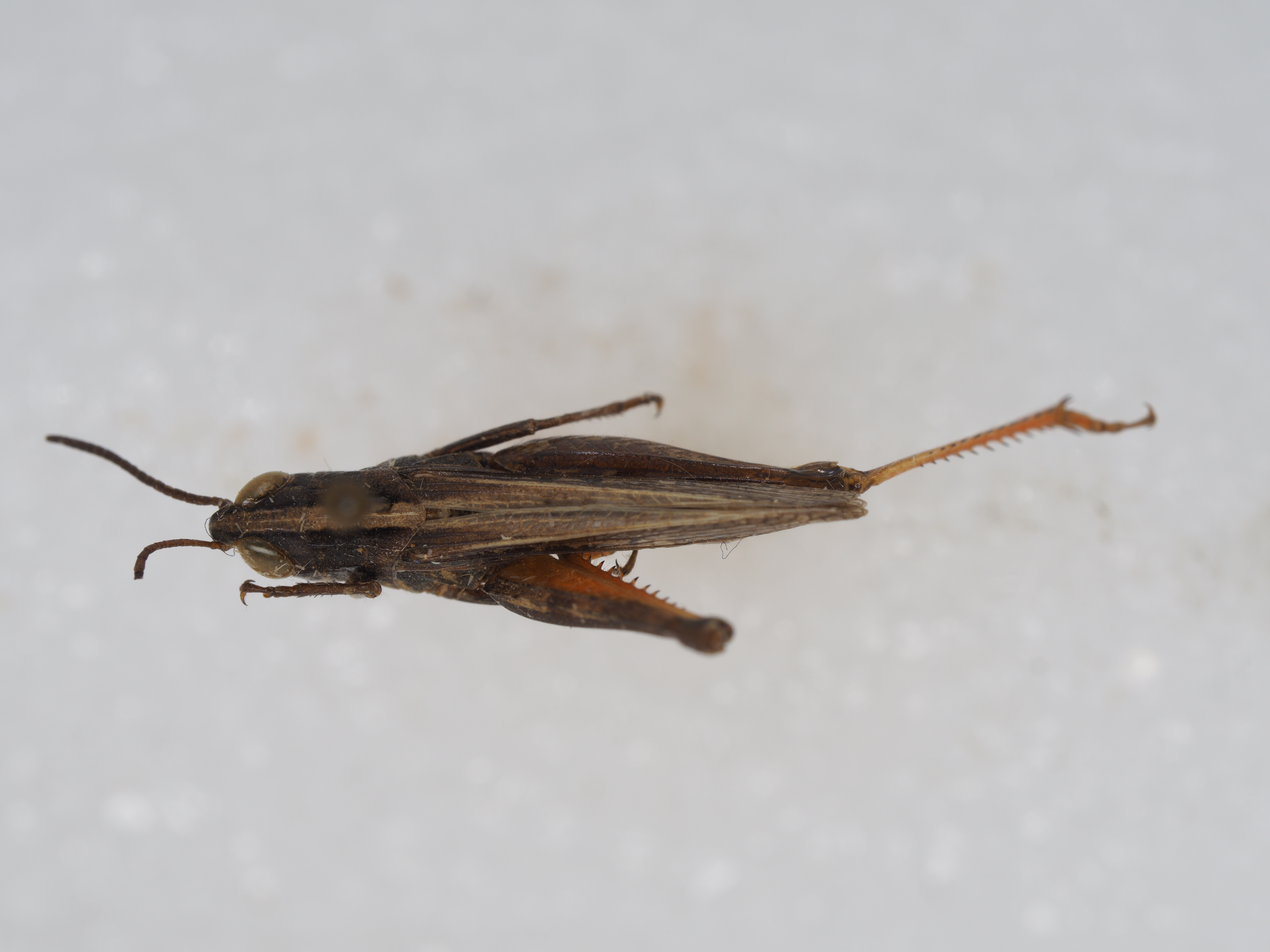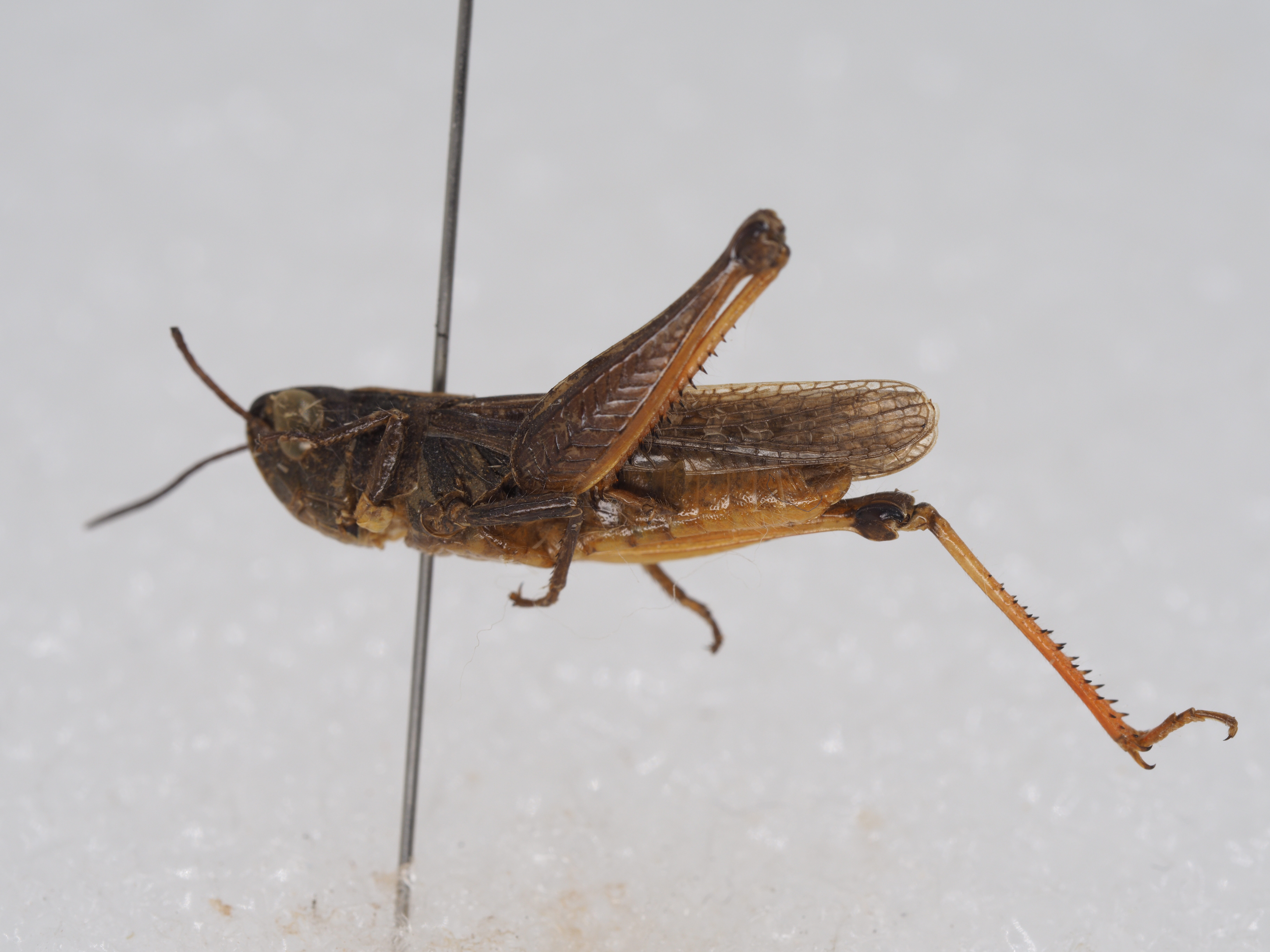 体色 褐色,眼后带黑褐色,直延伸到前翅的顶端。后翅透明,其端部为淡烟色。后足股节淡褐色,有时外侧较暗,上侧在基部和中部各具一条黑色横纹,内侧基部之半及近端部各具一个黑色斑纹,膝部黑褐色;后足胫节基部黑色,其余部分为橙黄色。腹部淡黄色。