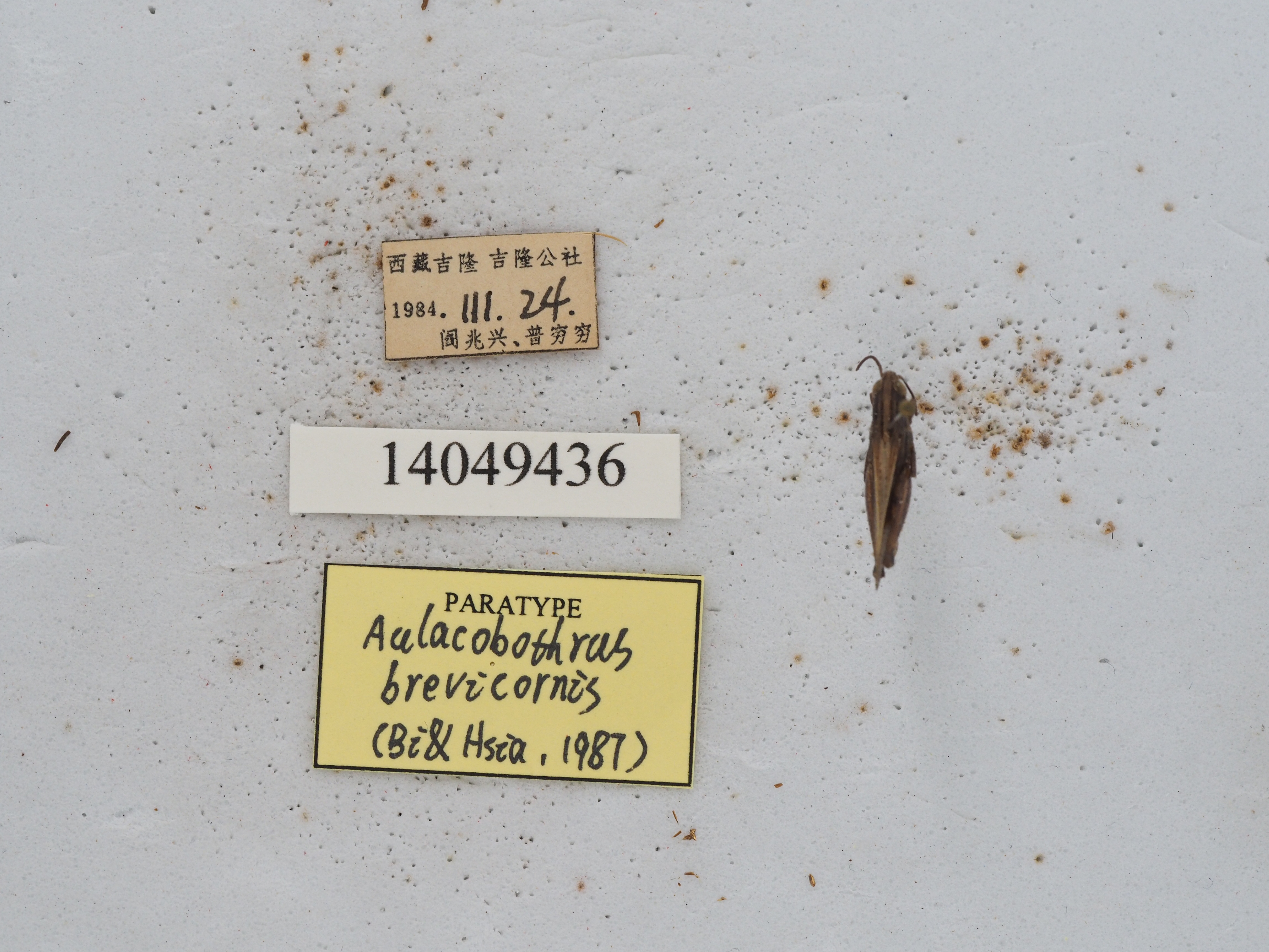 描述:雄性 体小型。头顶宽短,在复眼前缘之宽大于长,侧缘明显隆起,顶端狭圆形,背面具中隆线。头侧窝为长方形,其长为宽的2倍,背面可见。颜面向后倾斜与头顶形成圆角形;颜面隆起宽平,两侧缘在中央单眼之下近平行,中央具粗刻点。触角粗短,仅达前胸背板后缘,中段一节的长约为宽的1.3倍。复眼较大,卵形,其纵径约为横径的1.3倍,为眼下沟长的2.4倍。前胸背板前缘较平,后缘为钝角形突出;中隆线较明显,侧隆线在沟前区近平行,在沟后区略扩大,侧隆线间最狭处小于最宽处的1.5倍;三条横沟均切断侧隆线,仅后横沟切断中隆线;后横沟位于近中部,沟前区的长度略短于沟后区。中胸腹板侧叶间之中隔为梯形;后胸腹板侧叶在后端相互毗连。前、后翅均发达,其长略超过后足股节的顶端,端部圆形;缘前脉域不超过前翅中部,肘脉域较狭,其宽度略宽于或等于中脉域;缘前脉域、中脉域及肘脉域均具闰脉。后足股节较粗短,长为宽的3.5倍,上侧中隆线平滑,下膝侧片顶端圆形。后足胫节内侧具刺12个,外侧11个,缺外端刺;胫节内侧距之下距略长于上距。跗节爪间中垫略大,略超过爪之中部。鼓膜器发达,孔卵圆形。肛上板长三角形,端部较狭长,近顶端处收缩,二侧形成不明显的齿。尾须圆锥形,其长度略超过肛上板。下生殖板短锥形,顶端钝圆形。阳具基背片前后冠突相连。