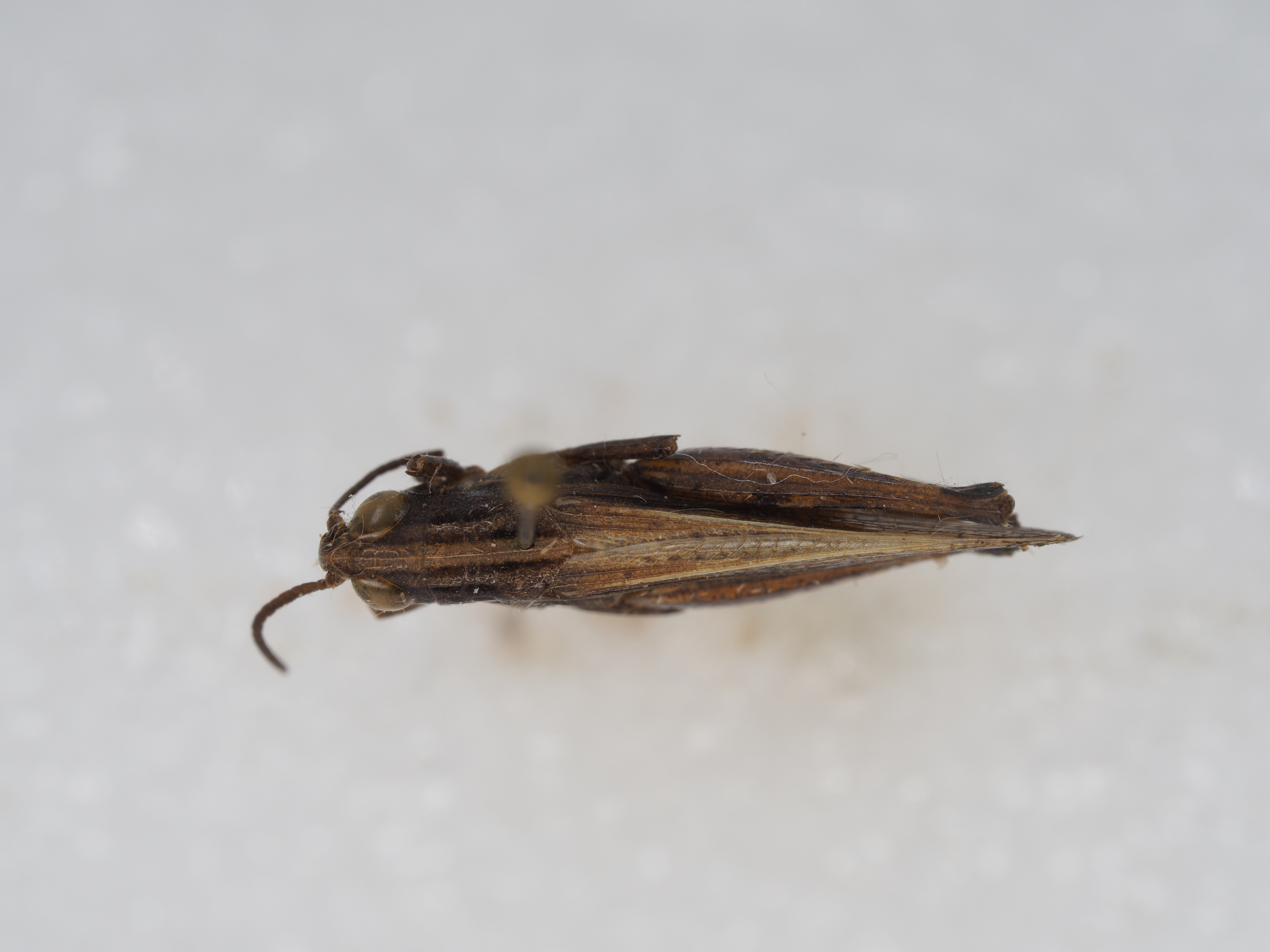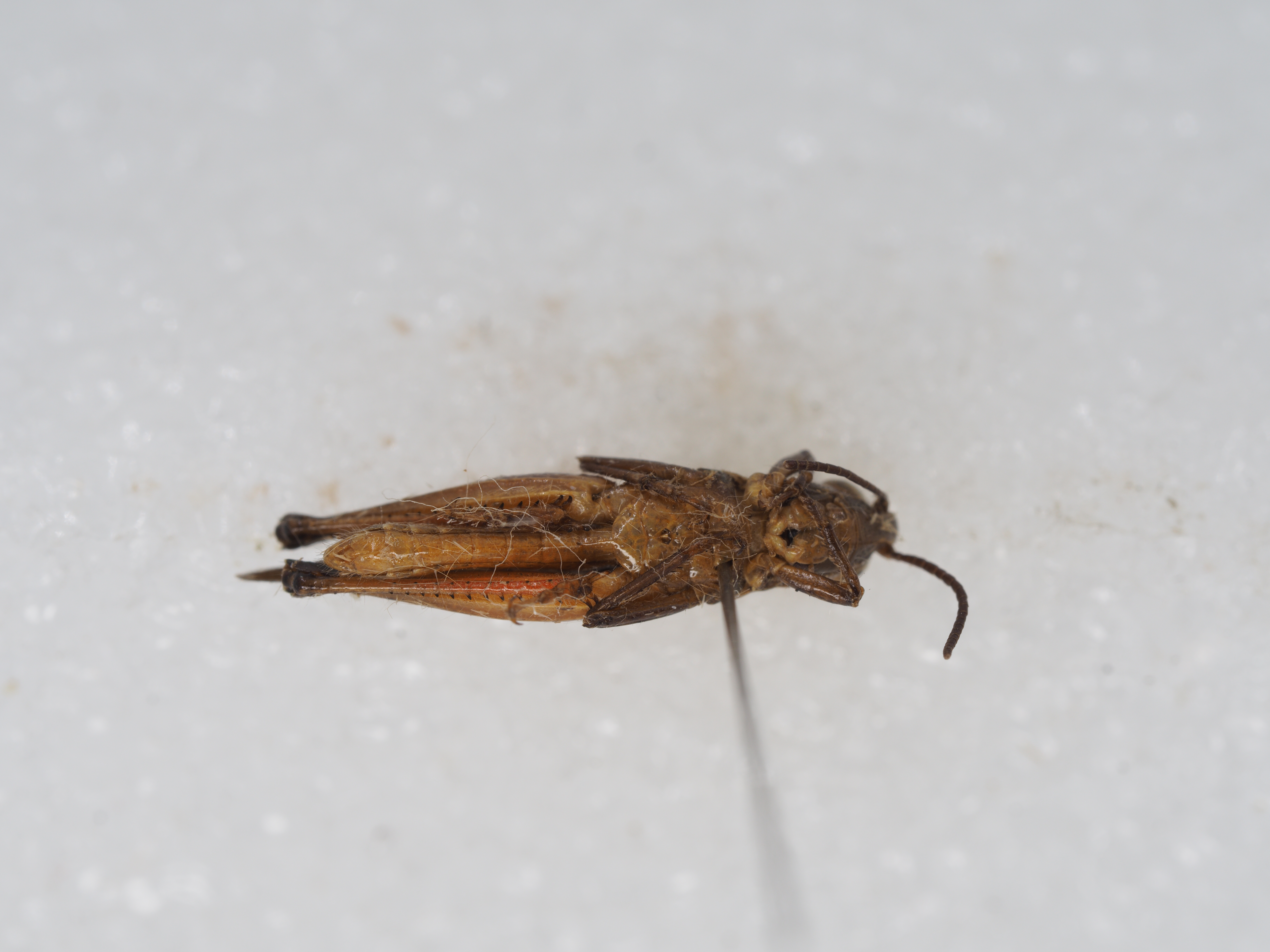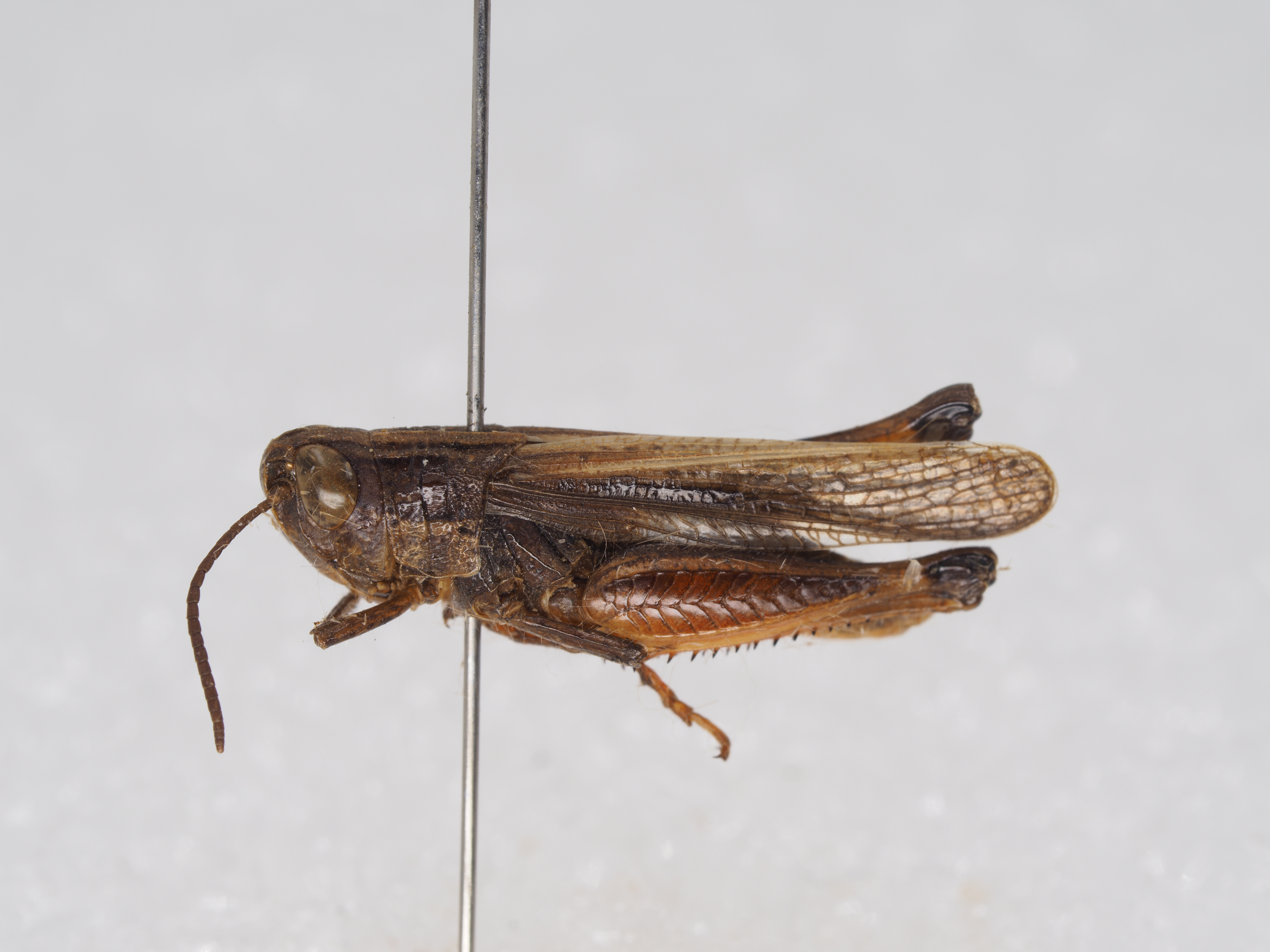 体色 褐色,眼后带黑褐色,直延伸到前翅的顶端。后翅透明,其端部为淡烟色。后足股节淡褐色,有时外侧较暗,上侧在基部和中部各具一条黑色横纹,内侧基部之半及近端部各具一个黑色斑纹,膝部黑褐色;后足胫节基部黑色,其余部分为橙黄色。腹部淡黄色。