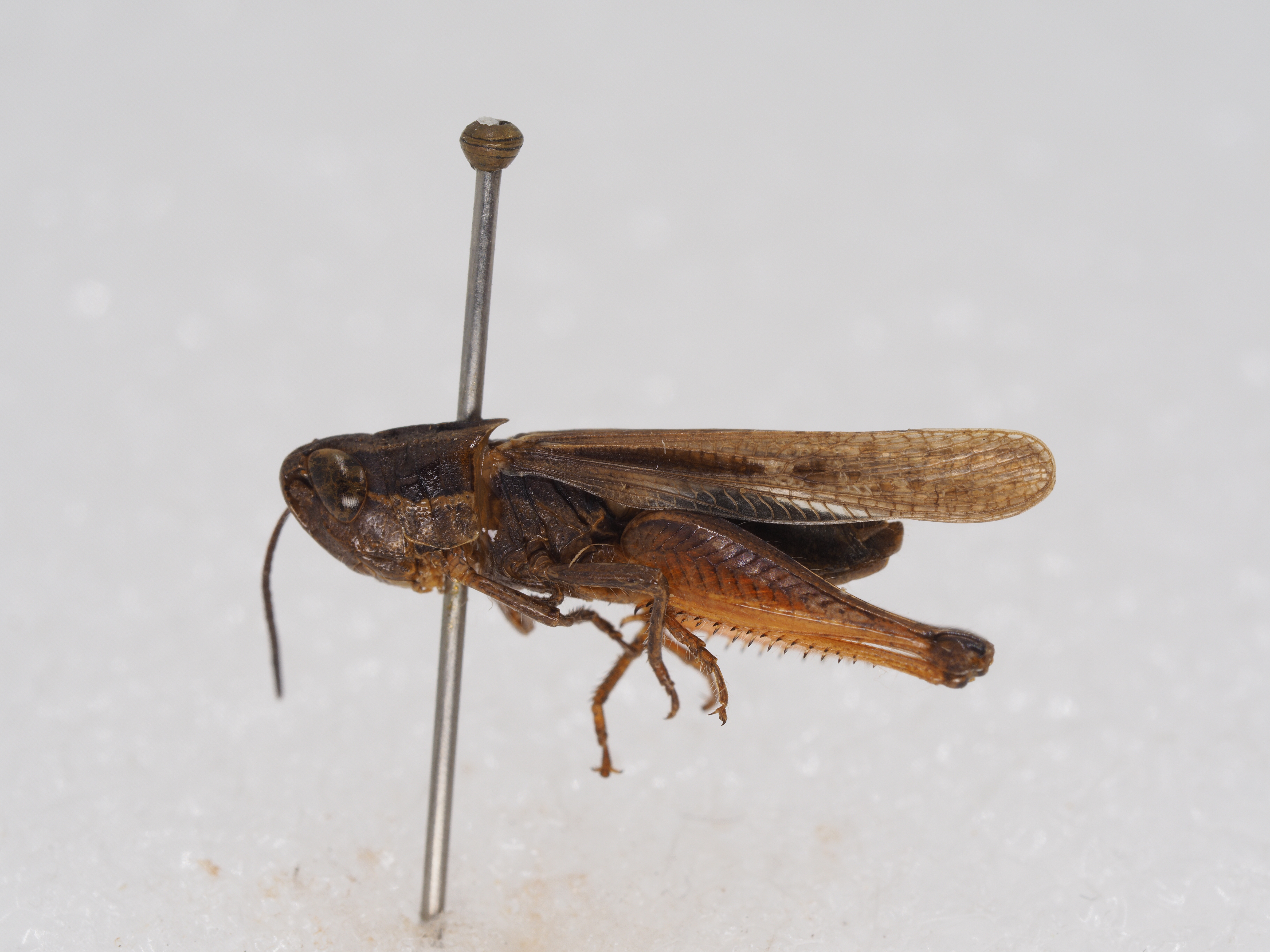 描述:雄性 体小型。头顶宽短,在复眼前缘之宽大于长,侧缘明显隆起,顶端狭圆形,背面具中隆线。头侧窝为长方形,其长为宽的2倍,背面可见。颜面向后倾斜与头顶形成圆角形;颜面隆起宽平,两侧缘在中央单眼之下近平行,中央具粗刻点。触角粗短,仅达前胸背板后缘,中段一节的长约为宽的1.3倍。复眼较大,卵形,其纵径约为横径的1.3倍,为眼下沟长的2.4倍。前胸背板前缘较平,后缘为钝角形突出;中隆线较明显,侧隆线在沟前区近平行,在沟后区略扩大,侧隆线间最狭处小于最宽处的1.5倍;三条横沟均切断侧隆线,仅后横沟切断中隆线;后横沟位于近中部,沟前区的长度略短于沟后区。中胸腹板侧叶间之中隔为梯形;后胸腹板侧叶在后端相互毗连。前、后翅均发达,其长略超过后足股节的顶端,端部圆形;缘前脉域不超过前翅中部,肘脉域较狭,其宽度略宽于或等于中脉域;缘前脉域、中脉域及肘脉域均具闰脉。后足股节较粗短,长为宽的3.5倍,上侧中隆线平滑,下膝侧片顶端圆形。后足胫节内侧具刺12个,外侧11个,缺外端刺;胫节内侧距之下距略长于上距。跗节爪间中垫略大,略超过爪之中部。鼓膜器发达,孔卵圆形。肛上板长三角形,端部较狭长,近顶端处收缩,二侧形成不明显的齿。尾须圆锥形,其长度略超过肛上板。下生殖板短锥形,顶端钝圆形。阳具基背片前后冠突相连。
