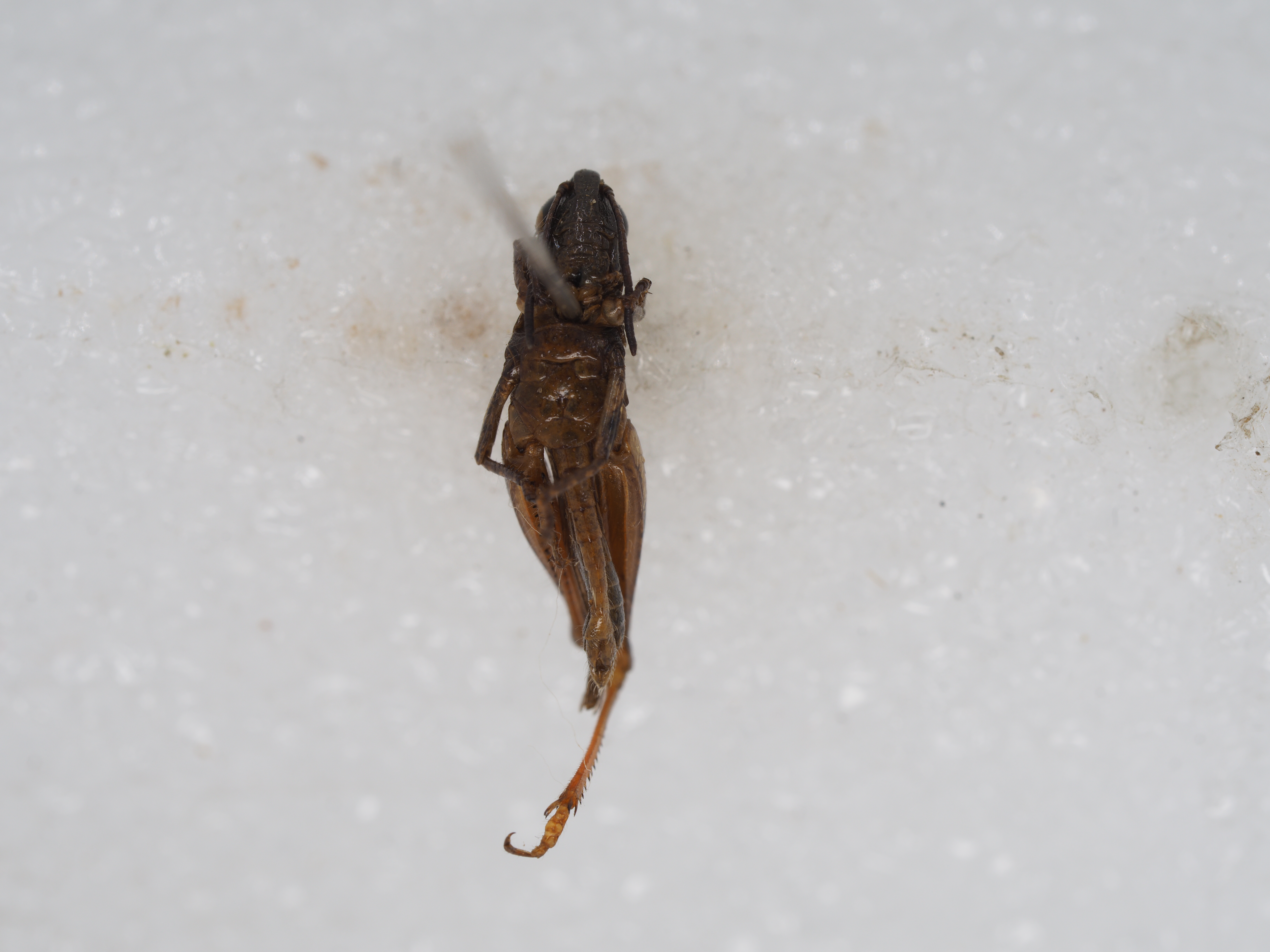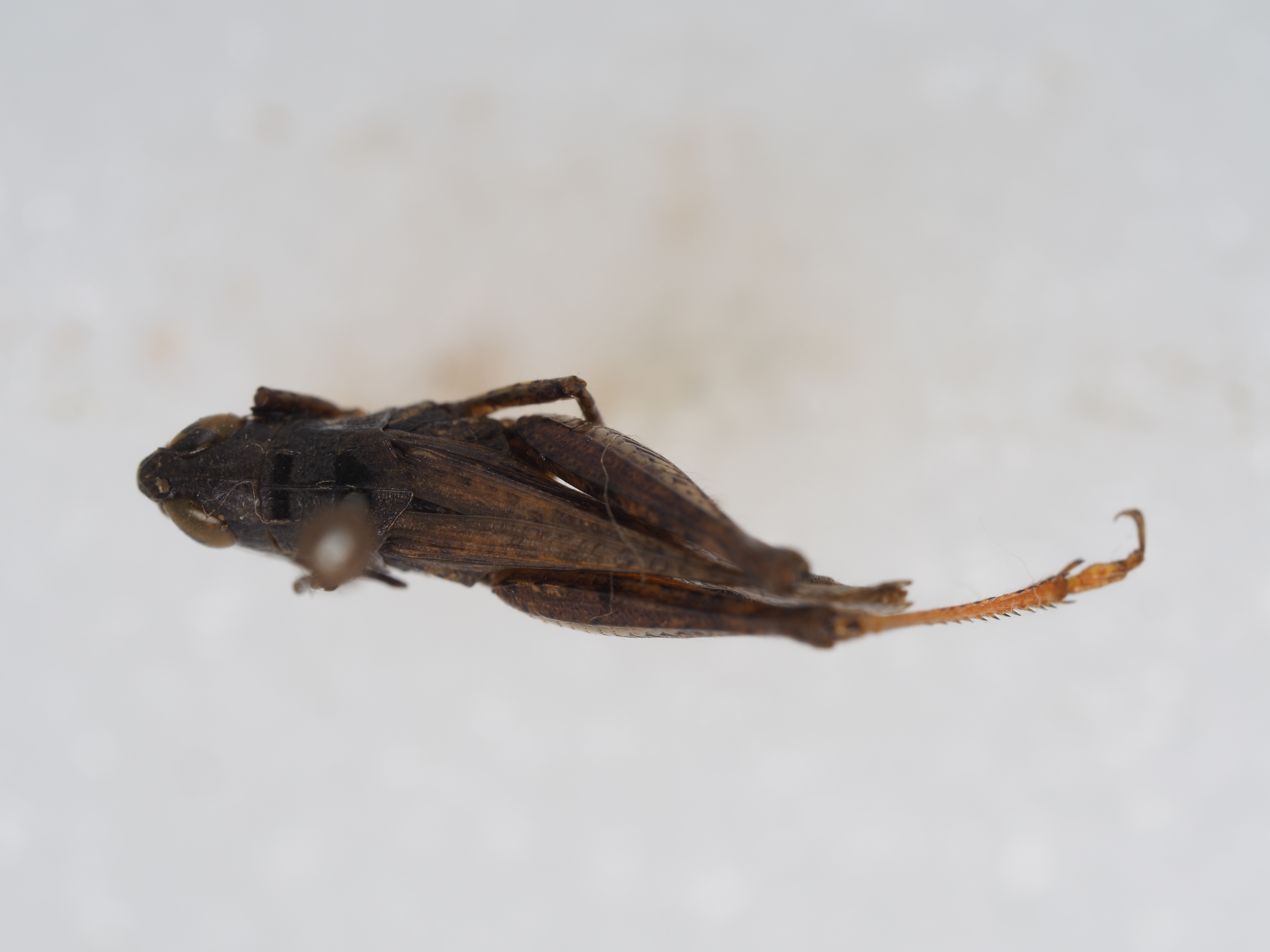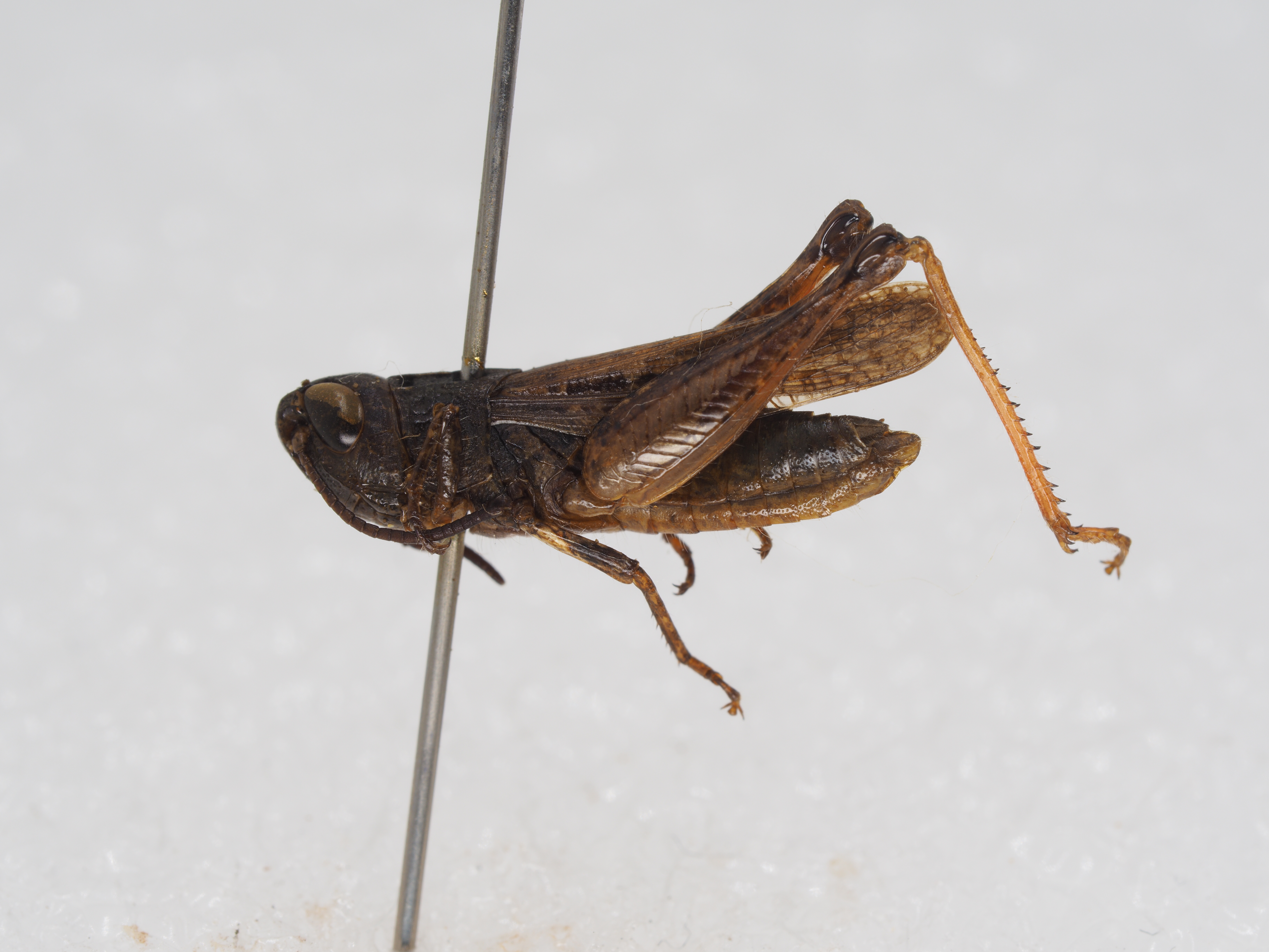 体色 褐色,眼后带黑褐色,直延伸到前翅的顶端。后翅透明,其端部为淡烟色。后足股节淡褐色,有时外侧较暗,上侧在基部和中部各具一条黑色横纹,内侧基部之半及近端部各具一个黑色斑纹,膝部黑褐色;后足胫节基部黑色,其余部分为橙黄色。腹部淡黄色。