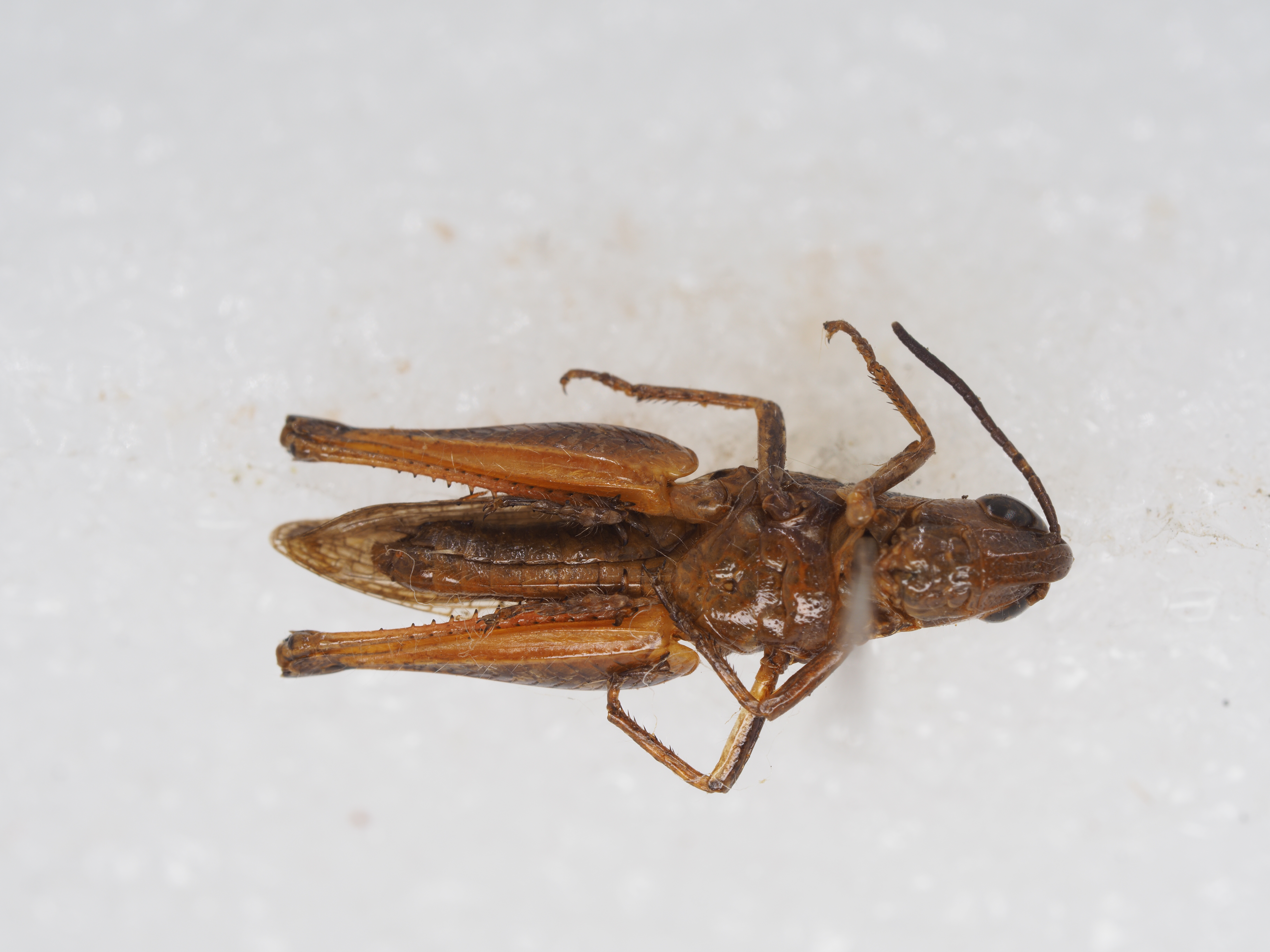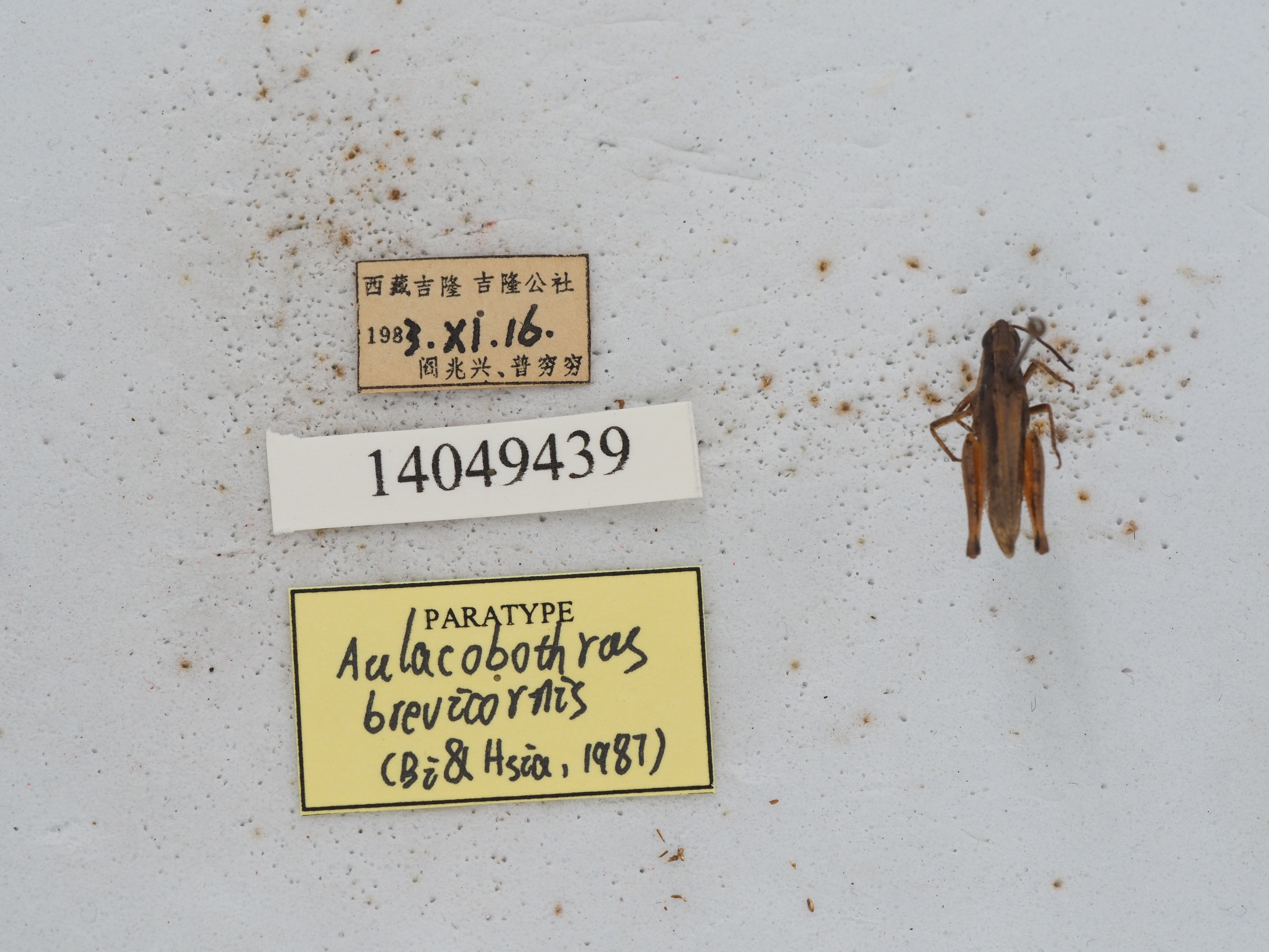 描述:雄性 体小型。头顶宽短,在复眼前缘之宽大于长,侧缘明显隆起,顶端狭圆形,背面具中隆线。头侧窝为长方形,其长为宽的2倍,背面可见。颜面向后倾斜与头顶形成圆角形;颜面隆起宽平,两侧缘在中央单眼之下近平行,中央具粗刻点。触角粗短,仅达前胸背板后缘,中段一节的长约为宽的1.3倍。复眼较大,卵形,其纵径约为横径的1.3倍,为眼下沟长的2.4倍。前胸背板前缘较平,后缘为钝角形突出;中隆线较明显,侧隆线在沟前区近平行,在沟后区略扩大,侧隆线间最狭处小于最宽处的1.5倍;三条横沟均切断侧隆线,仅后横沟切断中隆线;后横沟位于近中部,沟前区的长度略短于沟后区。中胸腹板侧叶间之中隔为梯形;后胸腹板侧叶在后端相互毗连。前、后翅均发达,其长略超过后足股节的顶端,端部圆形;缘前脉域不超过前翅中部,肘脉域较狭,其宽度略宽于或等于中脉域;缘前脉域、中脉域及肘脉域均具闰脉。后足股节较粗短,长为宽的3.5倍,上侧中隆线平滑,下膝侧片顶端圆形。后足胫节内侧具刺12个,外侧11个,缺外端刺;胫节内侧距之下距略长于上距。跗节爪间中垫略大,略超过爪之中部。鼓膜器发达,孔卵圆形。肛上板长三角形,端部较狭长,近顶端处收缩,二侧形成不明显的齿。尾须圆锥形,其长度略超过肛上板。下生殖板短锥形,顶端钝圆形。阳具基背片前后冠突相连。