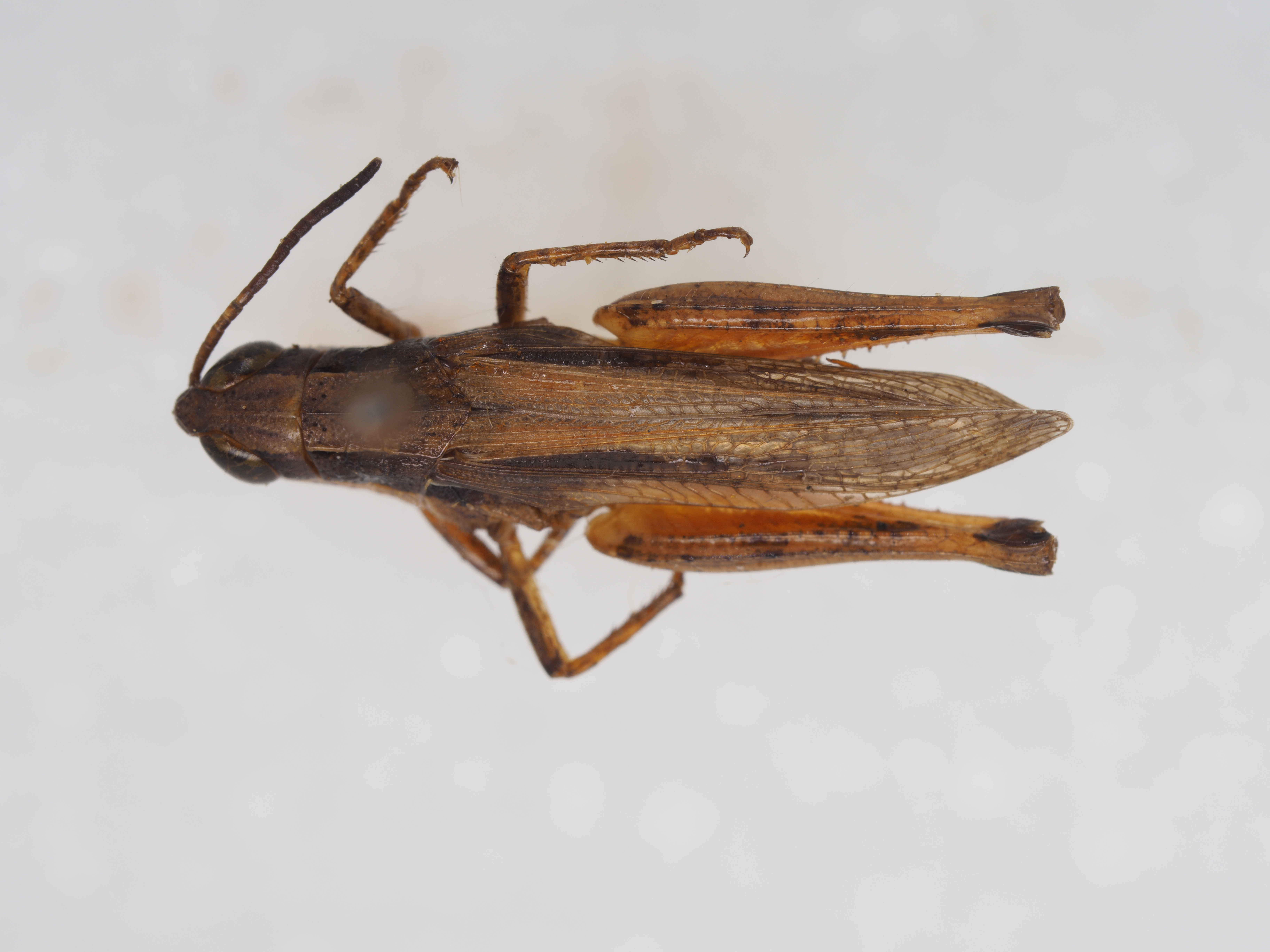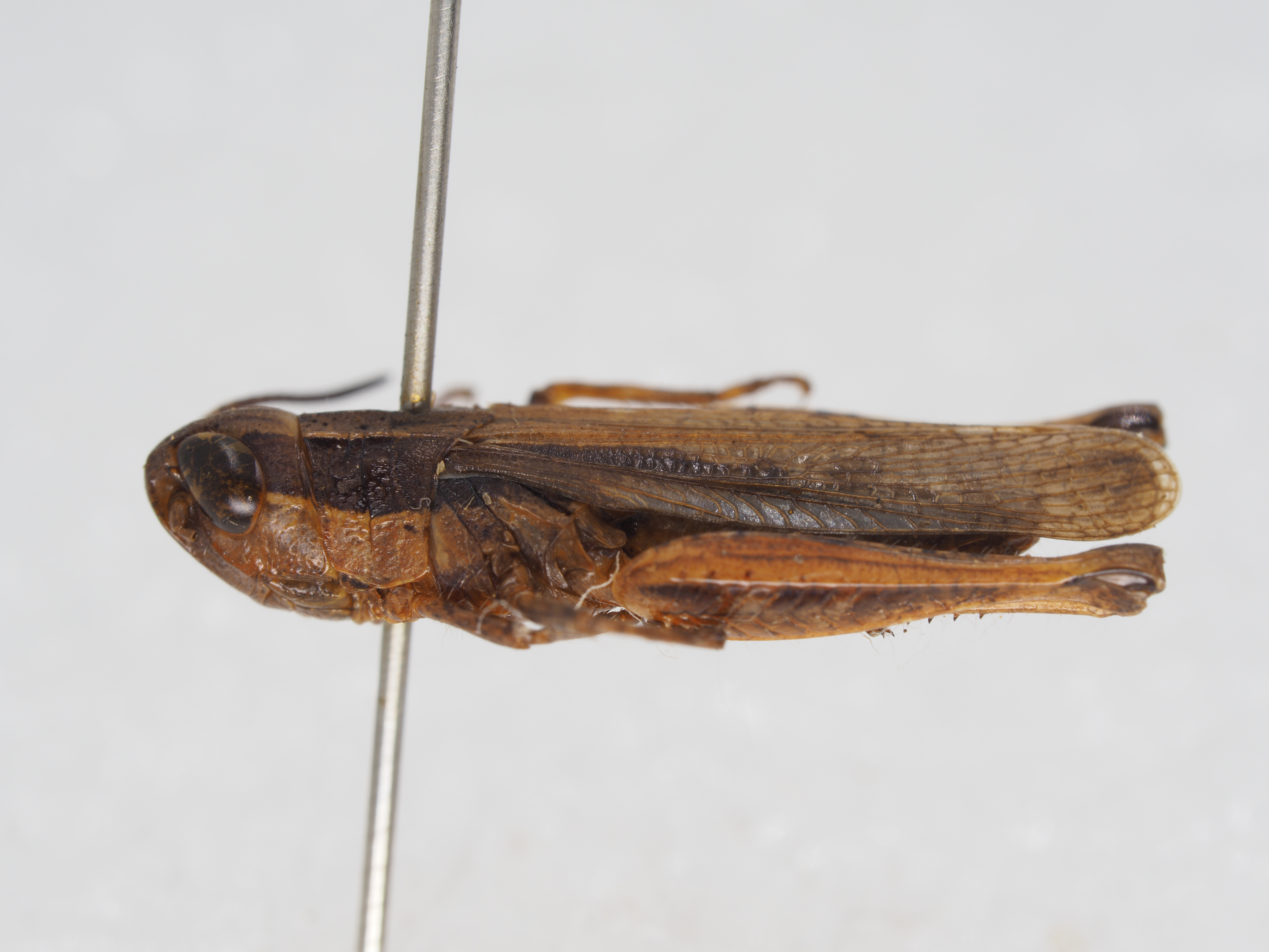 体色 褐色,眼后带黑褐色,直延伸到前翅的顶端。后翅透明,其端部为淡烟色。后足股节淡褐色,有时外侧较暗,上侧在基部和中部各具一条黑色横纹,内侧基部之半及近端部各具一个黑色斑纹,膝部黑褐色;后足胫节基部黑色,其余部分为橙黄色。腹部淡黄色。