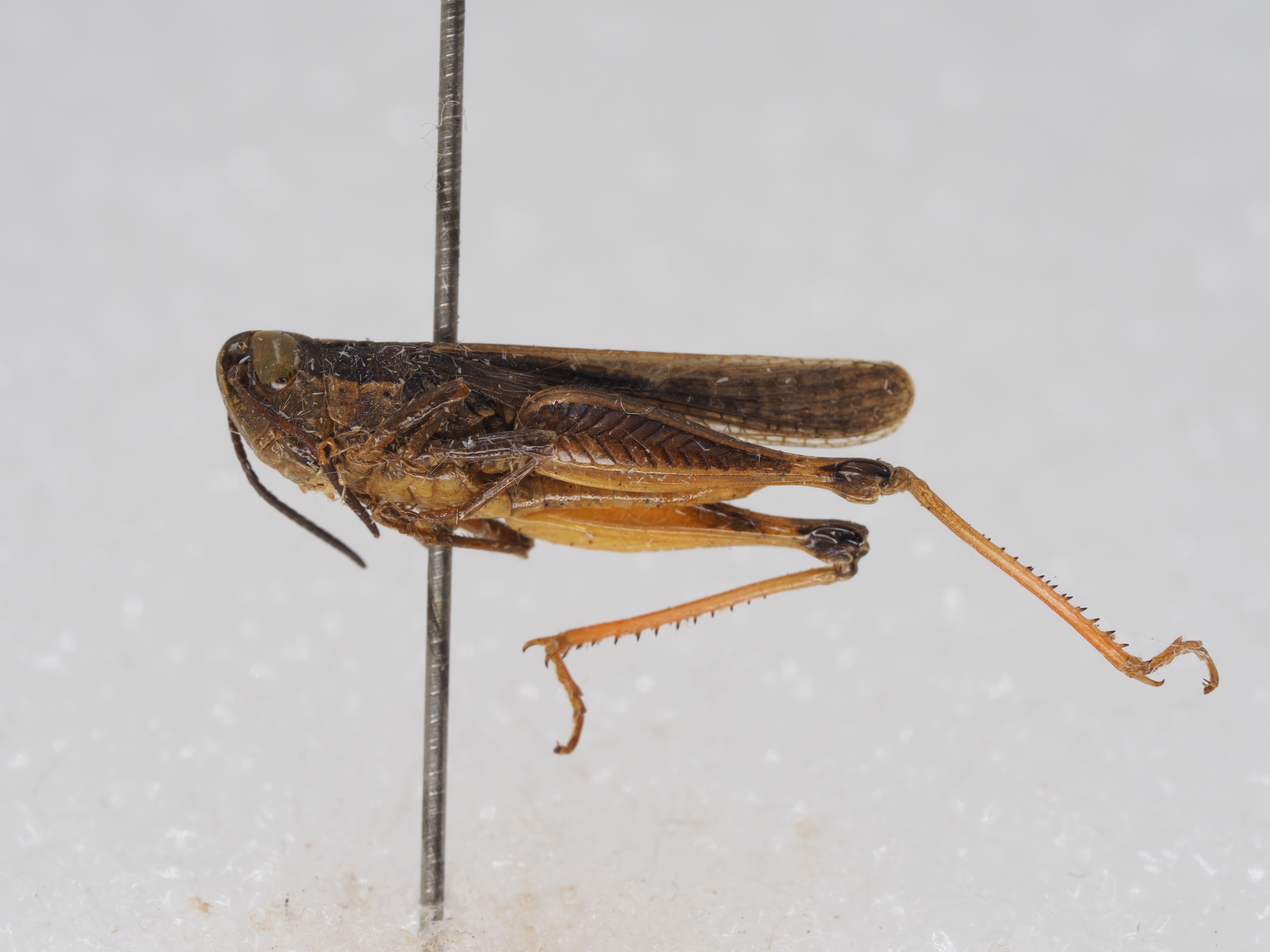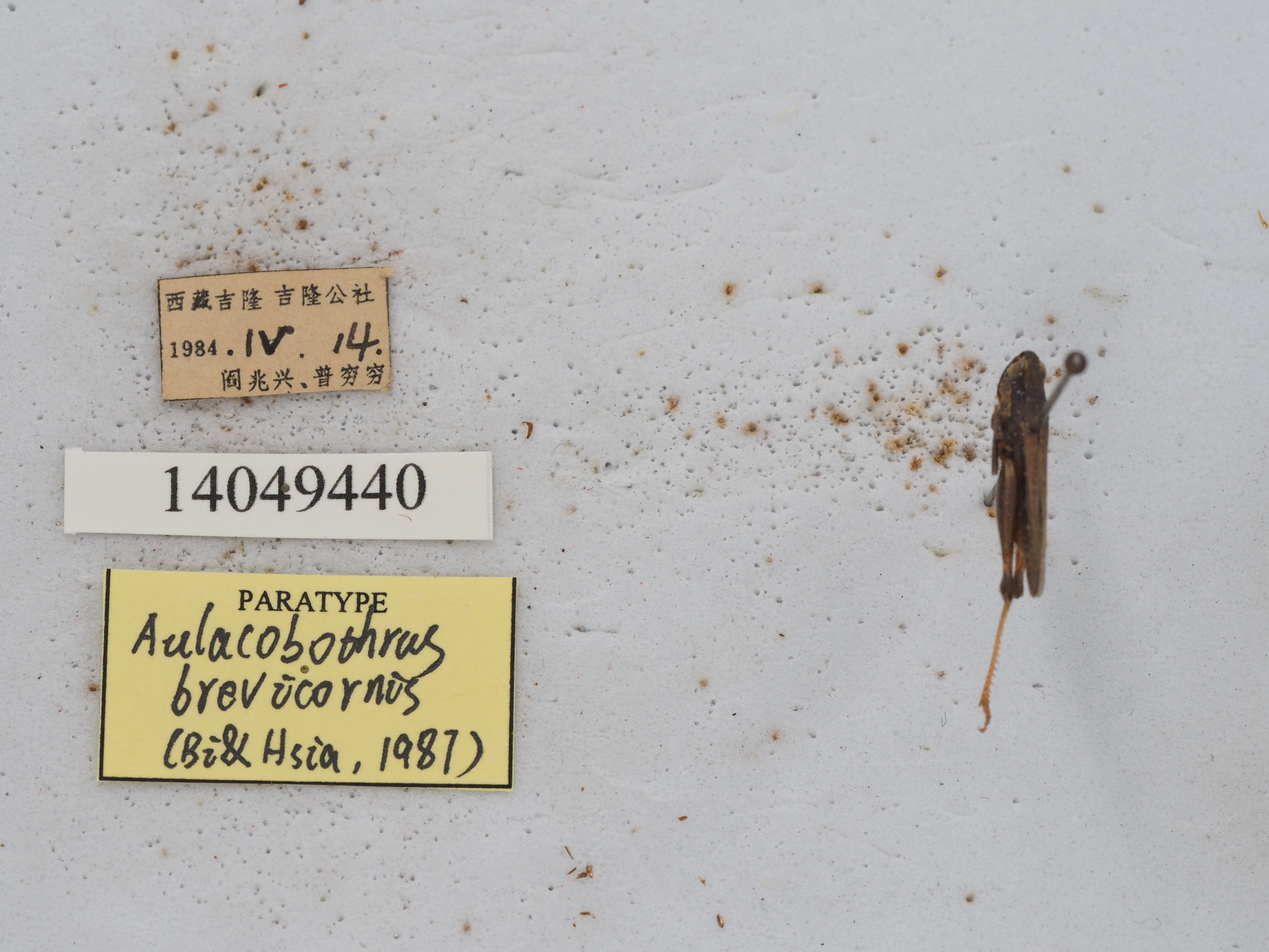 描述:雄性 体小型。头顶宽短,在复眼前缘之宽大于长,侧缘明显隆起,顶端狭圆形,背面具中隆线。头侧窝为长方形,其长为宽的2倍,背面可见。颜面向后倾斜与头顶形成圆角形;颜面隆起宽平,两侧缘在中央单眼之下近平行,中央具粗刻点。触角粗短,仅达前胸背板后缘,中段一节的长约为宽的1.3倍。复眼较大,卵形,其纵径约为横径的1.3倍,为眼下沟长的2.4倍。前胸背板前缘较平,后缘为钝角形突出;中隆线较明显,侧隆线在沟前区近平行,在沟后区略扩大,侧隆线间最狭处小于最宽处的1.5倍;三条横沟均切断侧隆线,仅后横沟切断中隆线;后横沟位于近中部,沟前区的长度略短于沟后区。中胸腹板侧叶间之中隔为梯形;后胸腹板侧叶在后端相互毗连。前、后翅均发达,其长略超过后足股节的顶端,端部圆形;缘前脉域不超过前翅中部,肘脉域较狭,其宽度略宽于或等于中脉域;缘前脉域、中脉域及肘脉域均具闰脉。后足股节较粗短,长为宽的3.5倍,上侧中隆线平滑,下膝侧片顶端圆形。后足胫节内侧具刺12个,外侧11个,缺外端刺;胫节内侧距之下距略长于上距。跗节爪间中垫略大,略超过爪之中部。鼓膜器发达,孔卵圆形。肛上板长三角形,端部较狭长,近顶端处收缩,二侧形成不明显的齿。尾须圆锥形,其长度略超过肛上板。下生殖板短锥形,顶端钝圆形。阳具基背片前后冠突相连。