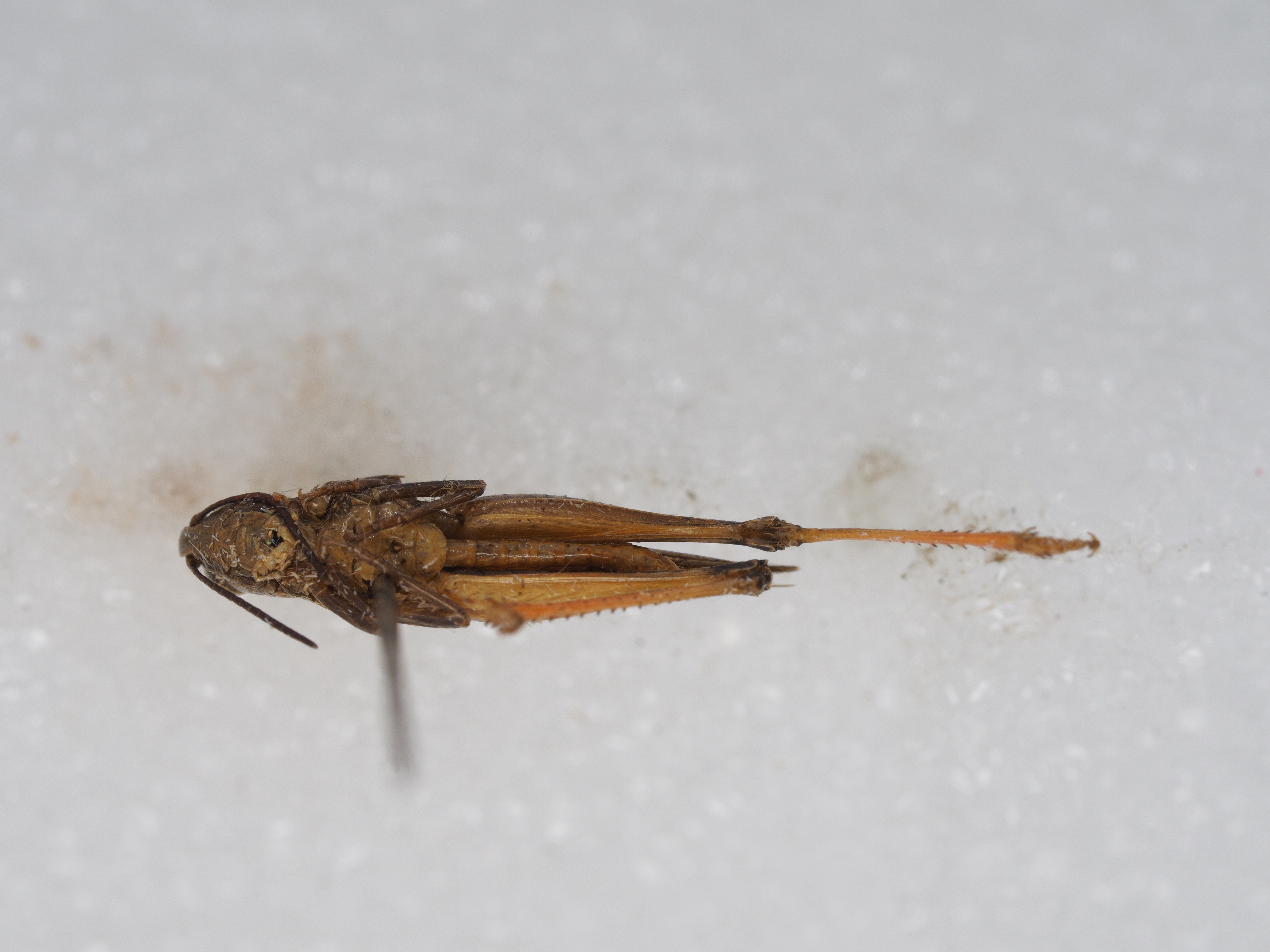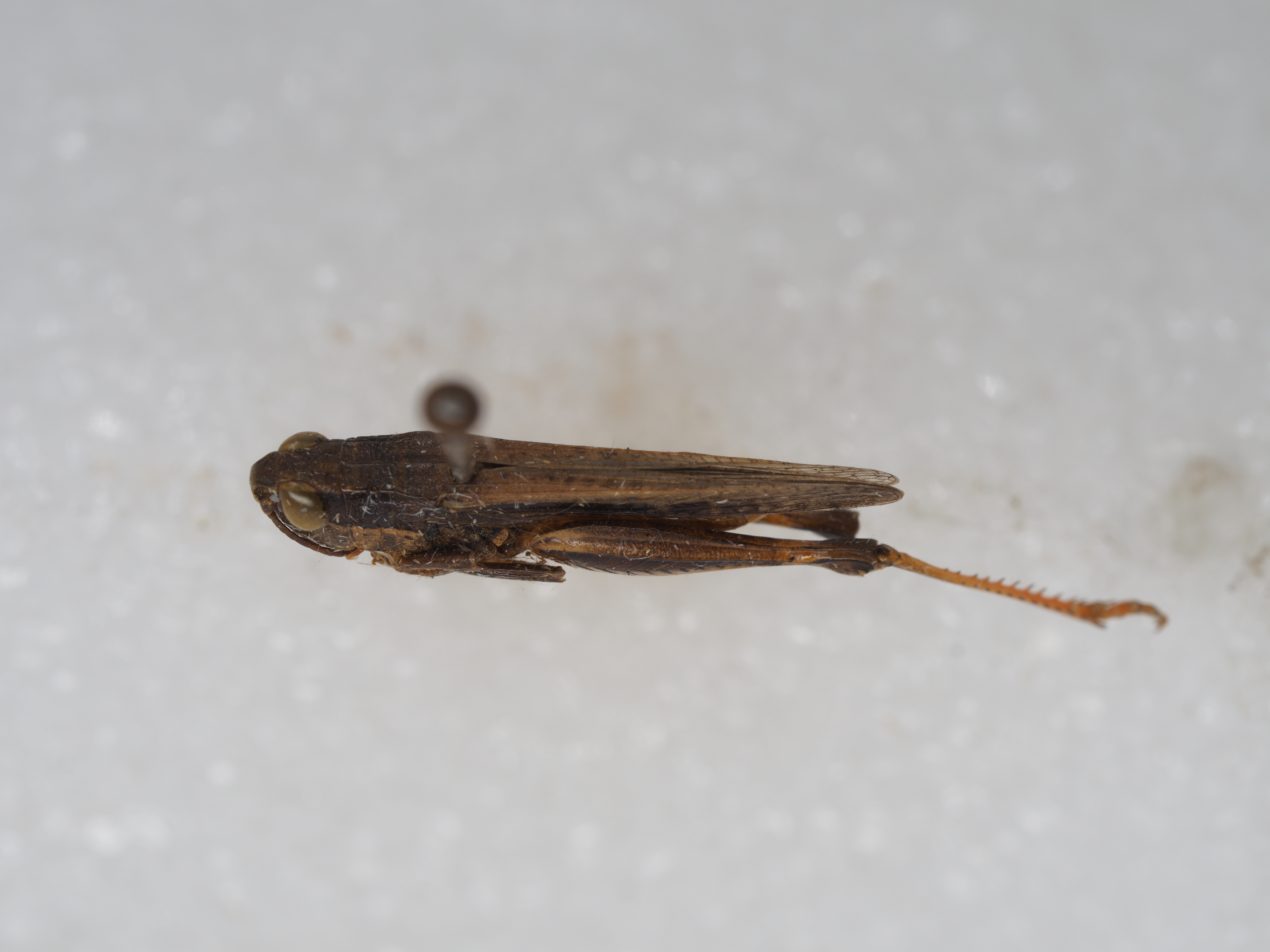 体色 褐色,眼后带黑褐色,直延伸到前翅的顶端。后翅透明,其端部为淡烟色。后足股节淡褐色,有时外侧较暗,上侧在基部和中部各具一条黑色横纹,内侧基部之半及近端部各具一个黑色斑纹,膝部黑褐色;后足胫节基部黑色,其余部分为橙黄色。腹部淡黄色。