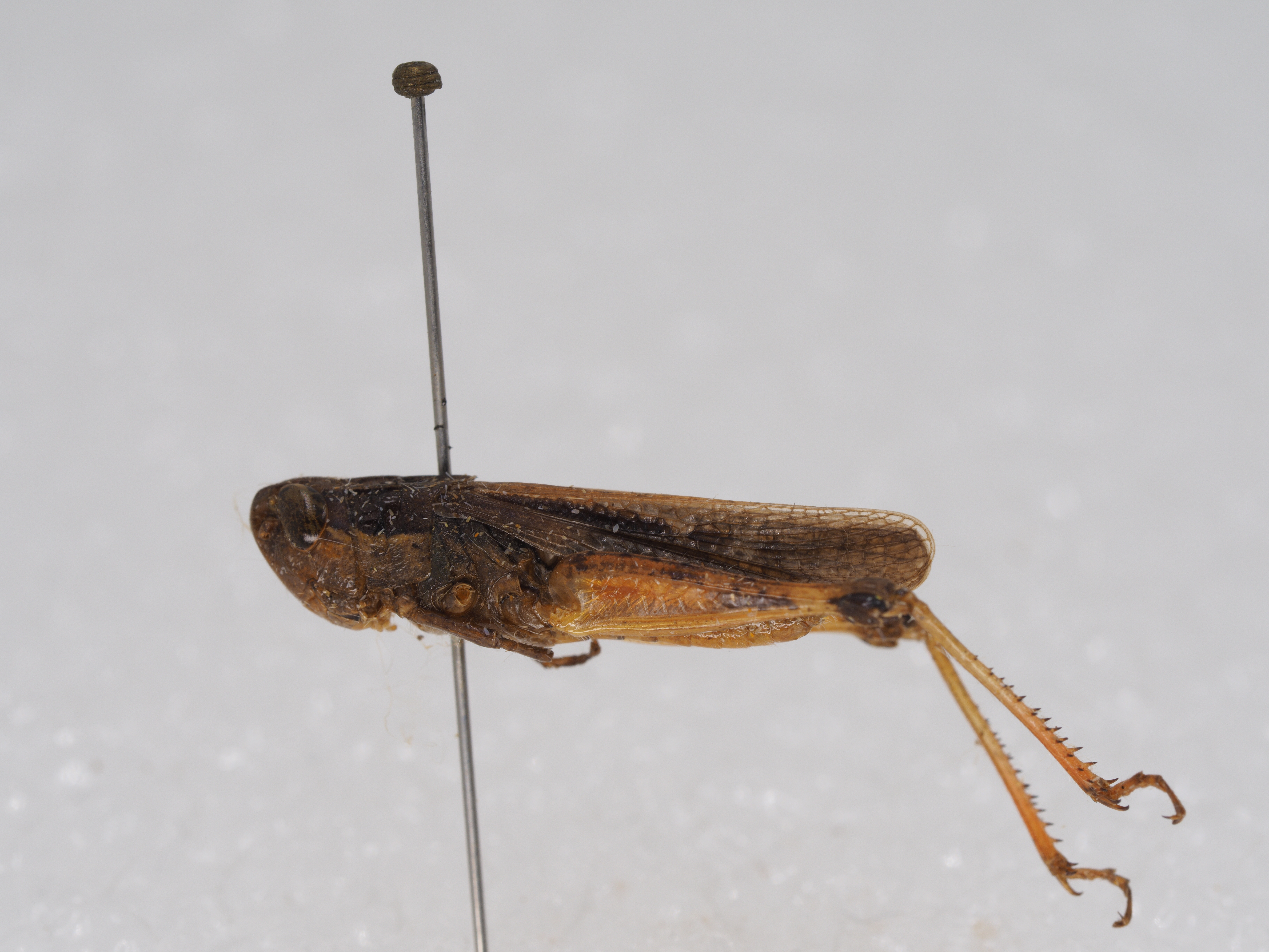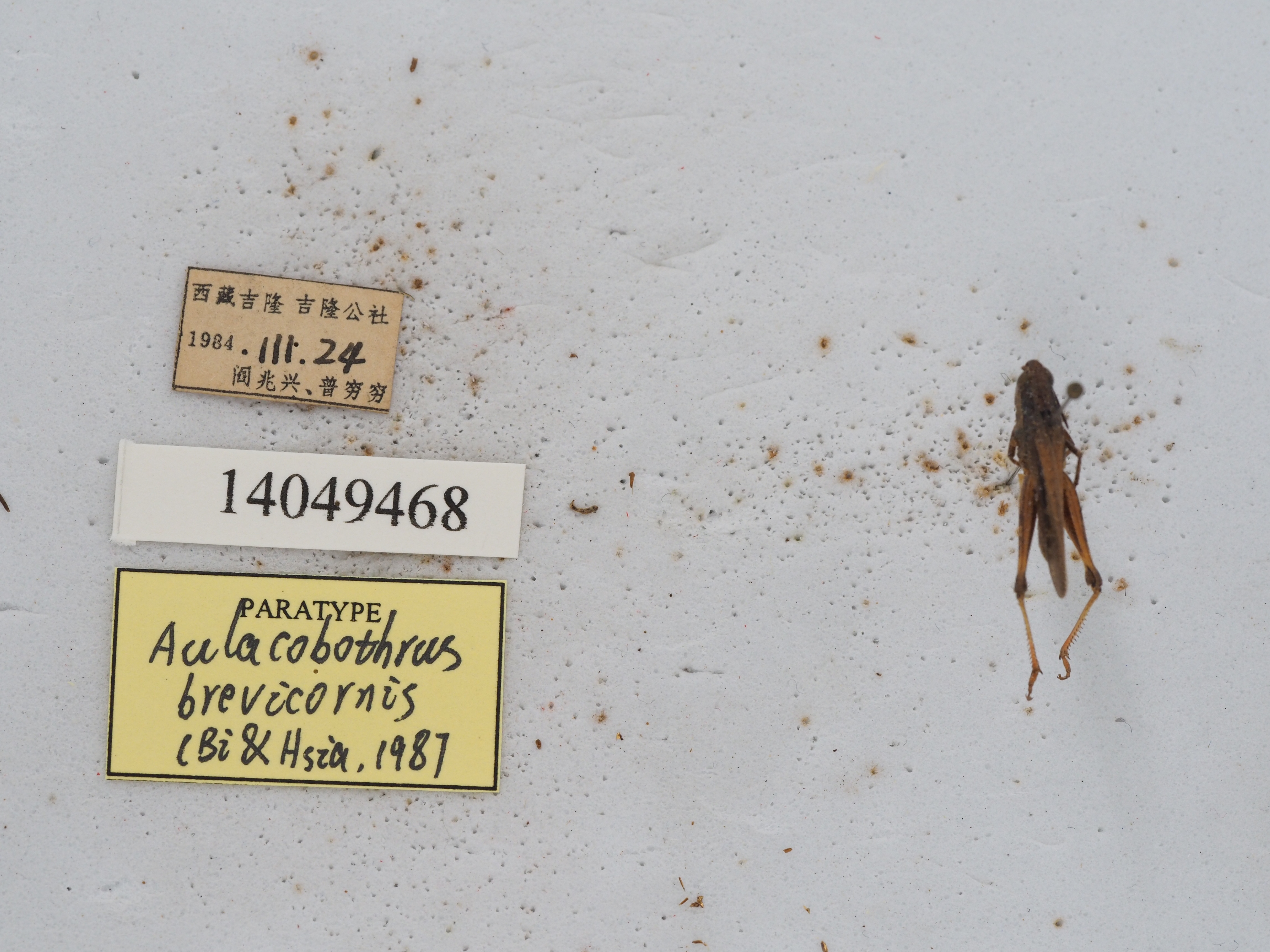 描述:雄性 体小型。头顶宽短,在复眼前缘之宽大于长,侧缘明显隆起,顶端狭圆形,背面具中隆线。头侧窝为长方形,其长为宽的2倍,背面可见。颜面向后倾斜与头顶形成圆角形;颜面隆起宽平,两侧缘在中央单眼之下近平行,中央具粗刻点。触角粗短,仅达前胸背板后缘,中段一节的长约为宽的1.3倍。复眼较大,卵形,其纵径约为横径的1.3倍,为眼下沟长的2.4倍。前胸背板前缘较平,后缘为钝角形突出;中隆线较明显,侧隆线在沟前区近平行,在沟后区略扩大,侧隆线间最狭处小于最宽处的1.5倍;三条横沟均切断侧隆线,仅后横沟切断中隆线;后横沟位于近中部,沟前区的长度略短于沟后区。中胸腹板侧叶间之中隔为梯形;后胸腹板侧叶在后端相互毗连。前、后翅均发达,其长略超过后足股节的顶端,端部圆形;缘前脉域不超过前翅中部,肘脉域较狭,其宽度略宽于或等于中脉域;缘前脉域、中脉域及肘脉域均具闰脉。后足股节较粗短,长为宽的3.5倍,上侧中隆线平滑,下膝侧片顶端圆形。后足胫节内侧具刺12个,外侧11个,缺外端刺;胫节内侧距之下距略长于上距。跗节爪间中垫略大,略超过爪之中部。鼓膜器发达,孔卵圆形。肛上板长三角形,端部较狭长,近顶端处收缩,二侧形成不明显的齿。尾须圆锥形,其长度略超过肛上板。下生殖板短锥形,顶端钝圆形。阳具基背片前后冠突相连。