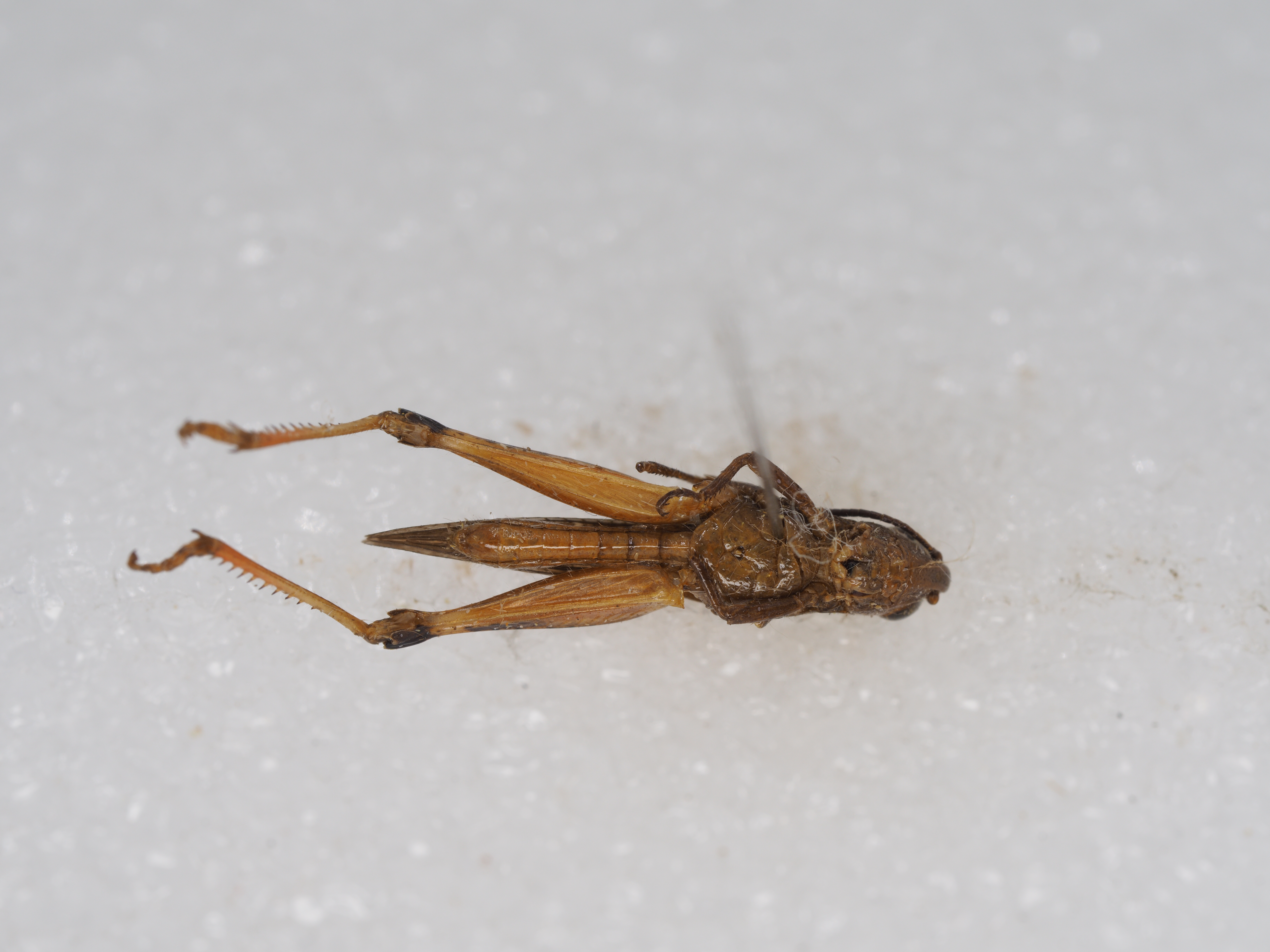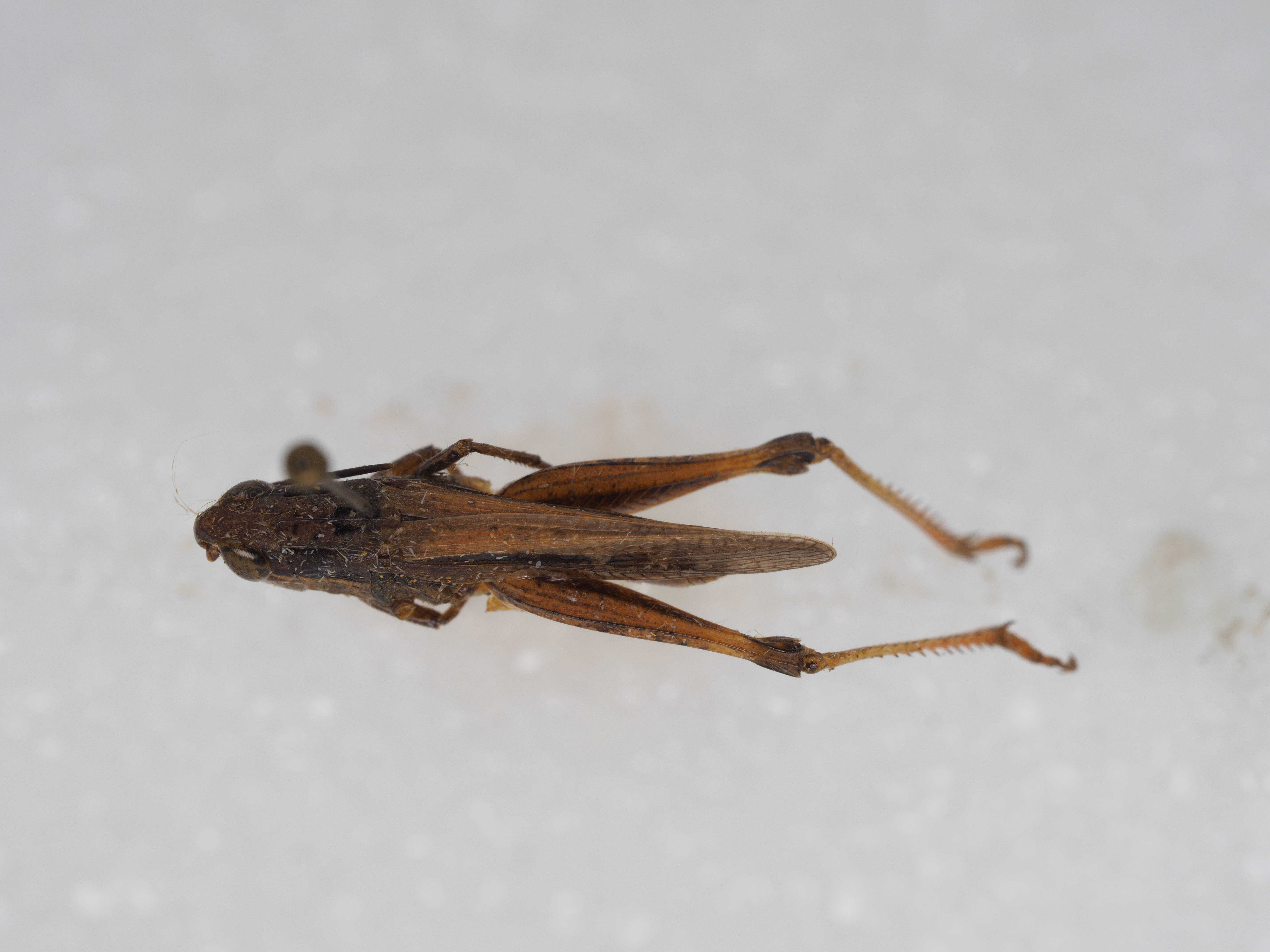 体色 褐色,眼后带黑褐色,直延伸到前翅的顶端。后翅透明,其端部为淡烟色。后足股节淡褐色,有时外侧较暗,上侧在基部和中部各具一条黑色横纹,内侧基部之半及近端部各具一个黑色斑纹,膝部黑褐色;后足胫节基部黑色,其余部分为橙黄色。腹部淡黄色。