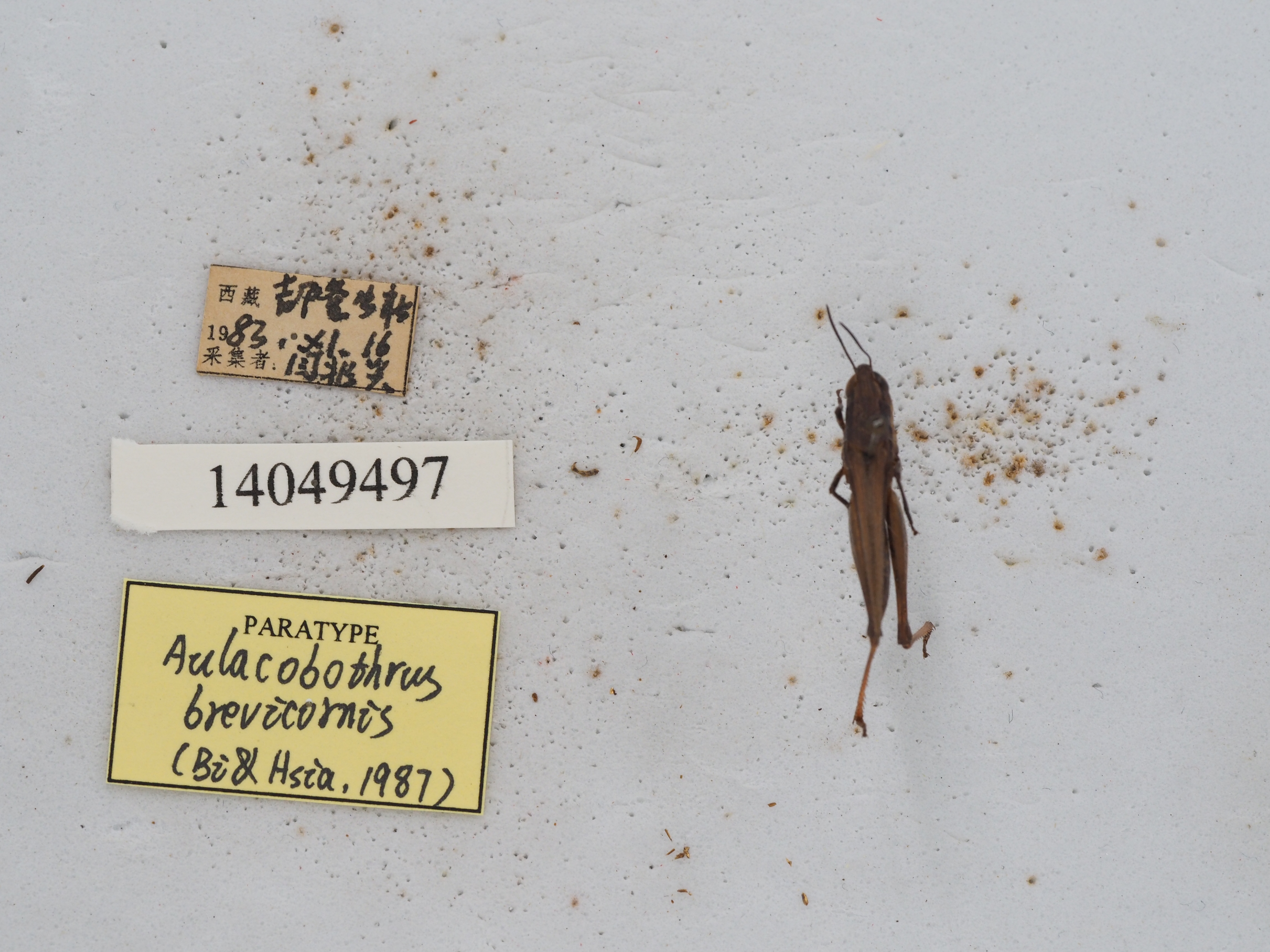 描述:雄性 体小型。头顶宽短,在复眼前缘之宽大于长,侧缘明显隆起,顶端狭圆形,背面具中隆线。头侧窝为长方形,其长为宽的2倍,背面可见。颜面向后倾斜与头顶形成圆角形;颜面隆起宽平,两侧缘在中央单眼之下近平行,中央具粗刻点。触角粗短,仅达前胸背板后缘,中段一节的长约为宽的1.3倍。复眼较大,卵形,其纵径约为横径的1.3倍,为眼下沟长的2.4倍。前胸背板前缘较平,后缘为钝角形突出;中隆线较明显,侧隆线在沟前区近平行,在沟后区略扩大,侧隆线间最狭处小于最宽处的1.5倍;三条横沟均切断侧隆线,仅后横沟切断中隆线;后横沟位于近中部,沟前区的长度略短于沟后区。中胸腹板侧叶间之中隔为梯形;后胸腹板侧叶在后端相互毗连。前、后翅均发达,其长略超过后足股节的顶端,端部圆形;缘前脉域不超过前翅中部,肘脉域较狭,其宽度略宽于或等于中脉域;缘前脉域、中脉域及肘脉域均具闰脉。后足股节较粗短,长为宽的3.5倍,上侧中隆线平滑,下膝侧片顶端圆形。后足胫节内侧具刺12个,外侧11个,缺外端刺;胫节内侧距之下距略长于上距。跗节爪间中垫略大,略超过爪之中部。鼓膜器发达,孔卵圆形。肛上板长三角形,端部较狭长,近顶端处收缩,二侧形成不明显的齿。尾须圆锥形,其长度略超过肛上板。下生殖板短锥形,顶端钝圆形。阳具基背片前后冠突相连。