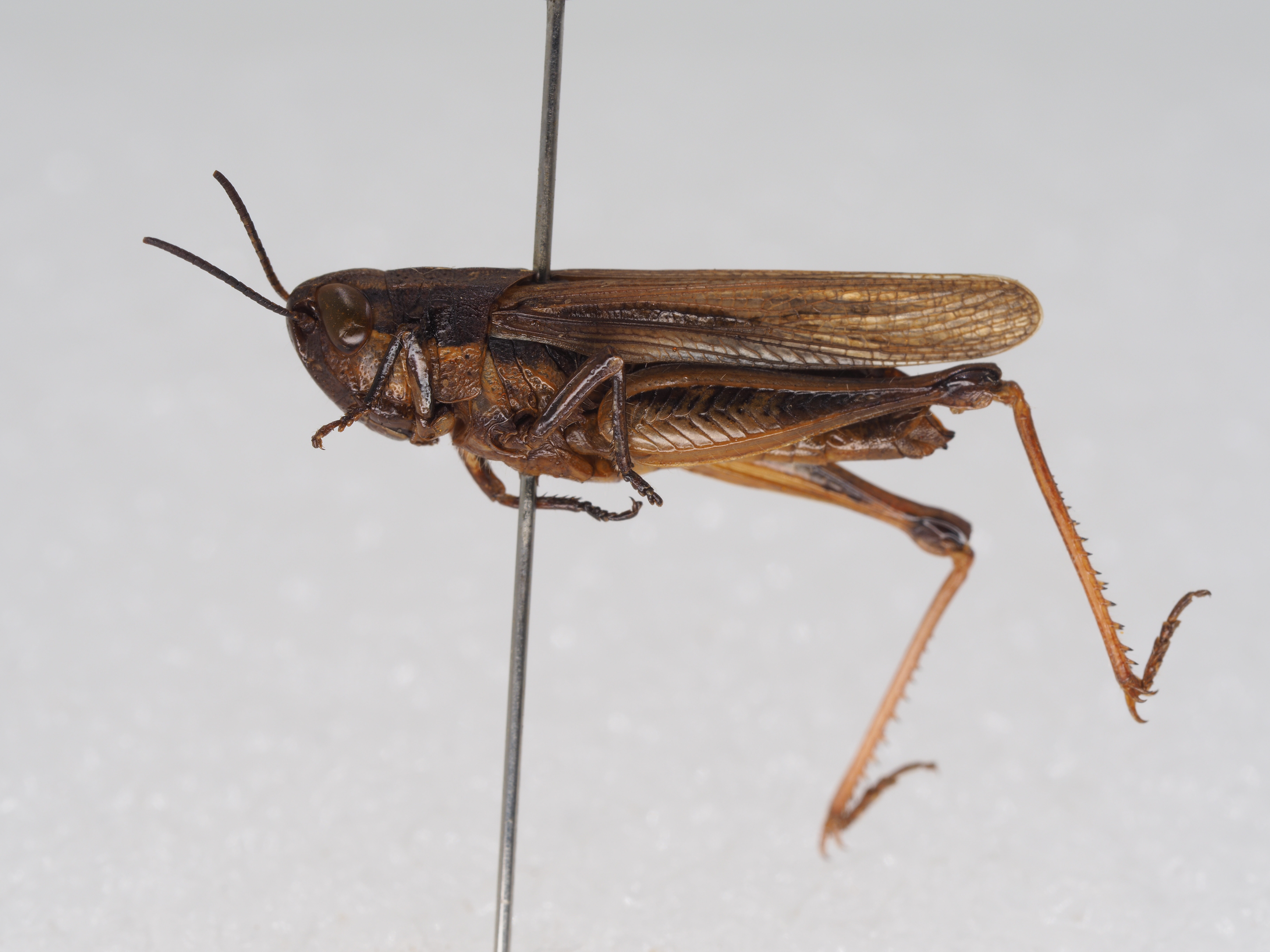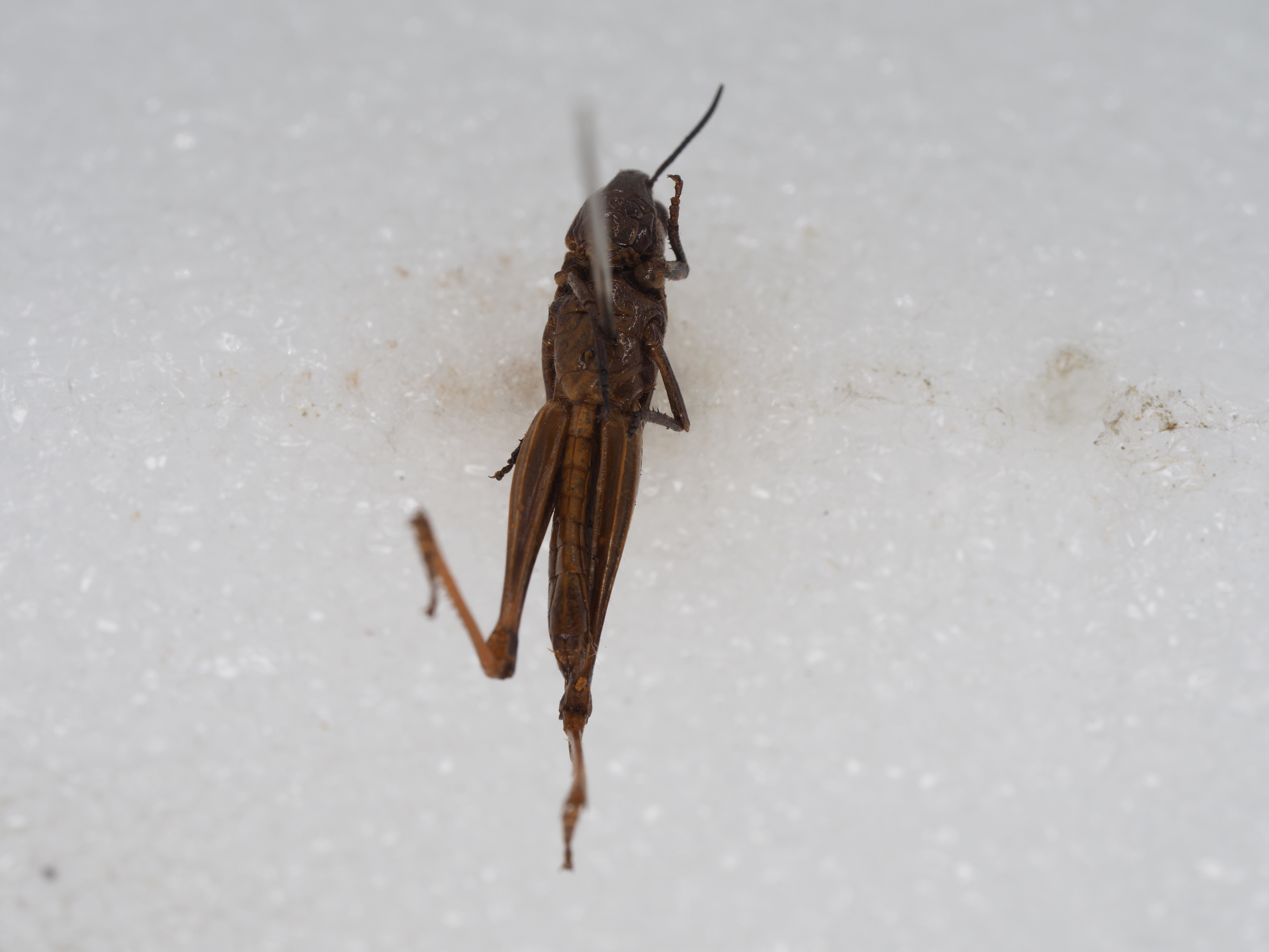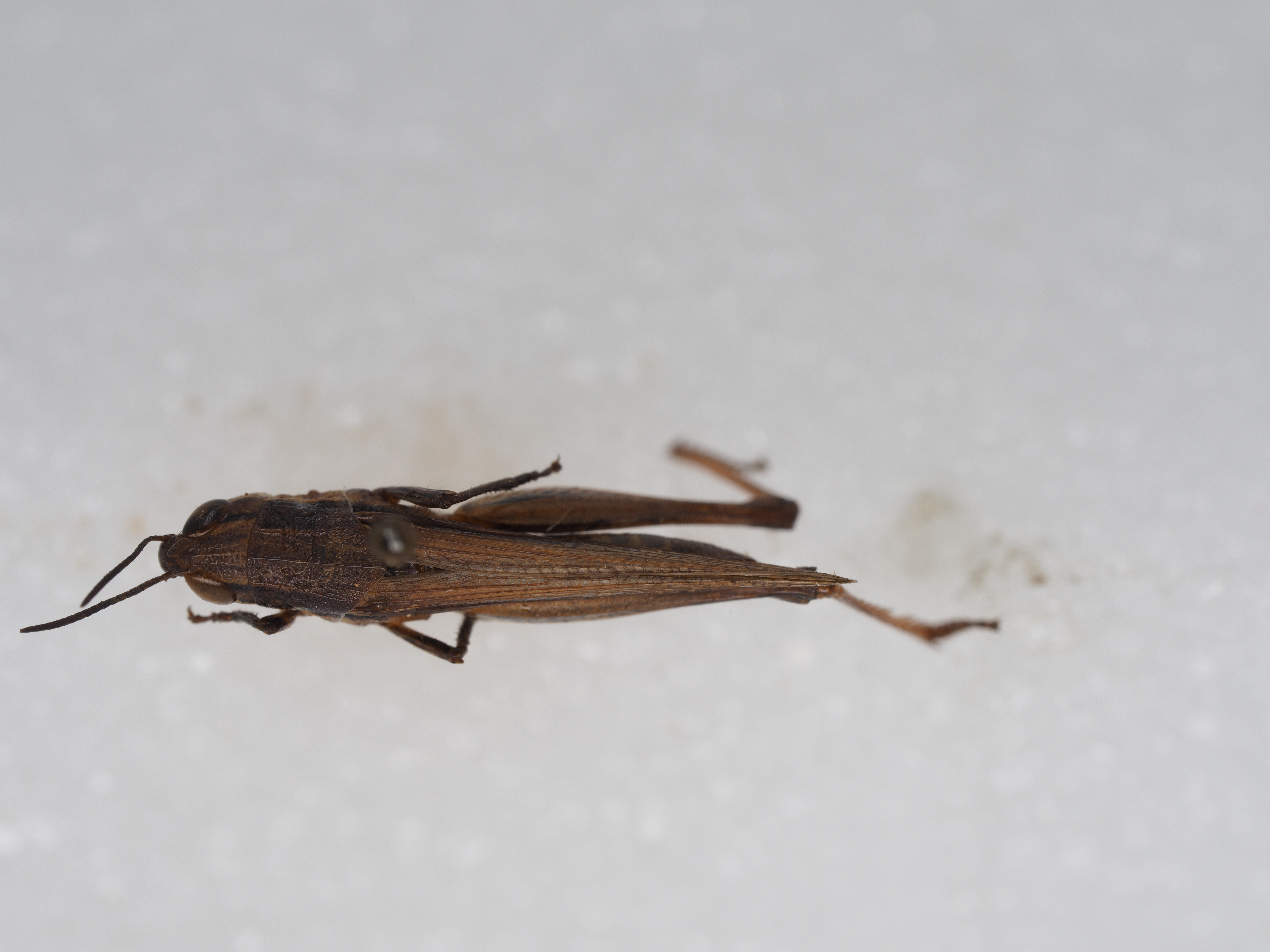 体色 褐色,眼后带黑褐色,直延伸到前翅的顶端。后翅透明,其端部为淡烟色。后足股节淡褐色,有时外侧较暗,上侧在基部和中部各具一条黑色横纹,内侧基部之半及近端部各具一个黑色斑纹,膝部黑褐色;后足胫节基部黑色,其余部分为橙黄色。腹部淡黄色。