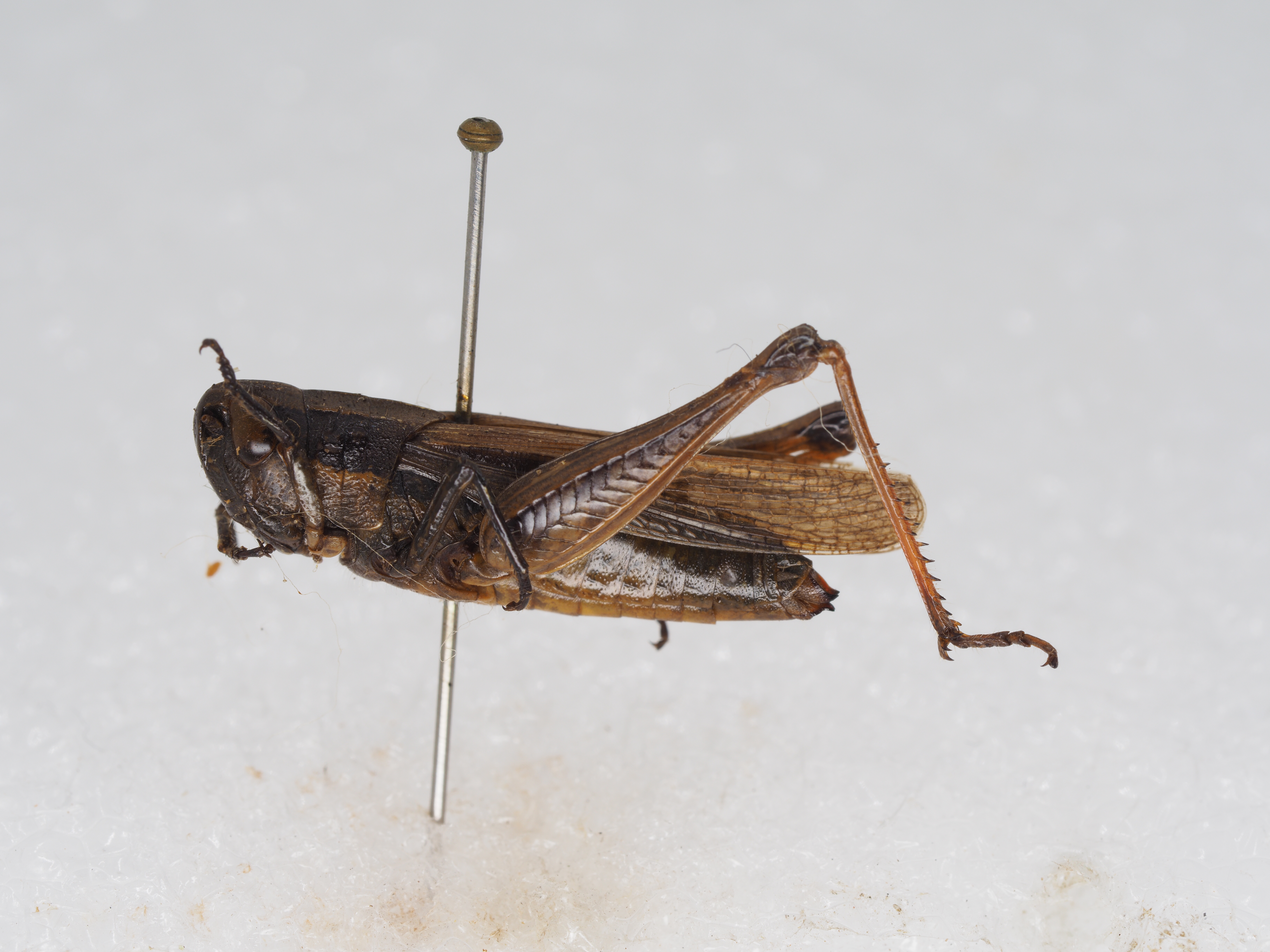 体色 褐色,眼后带黑褐色,直延伸到前翅的顶端。后翅透明,其端部为淡烟色。后足股节淡褐色,有时外侧较暗,上侧在基部和中部各具一条黑色横纹,内侧基部之半及近端部各具一个黑色斑纹,膝部黑褐色;后足胫节基部黑色,其余部分为橙黄色。腹部淡黄色。