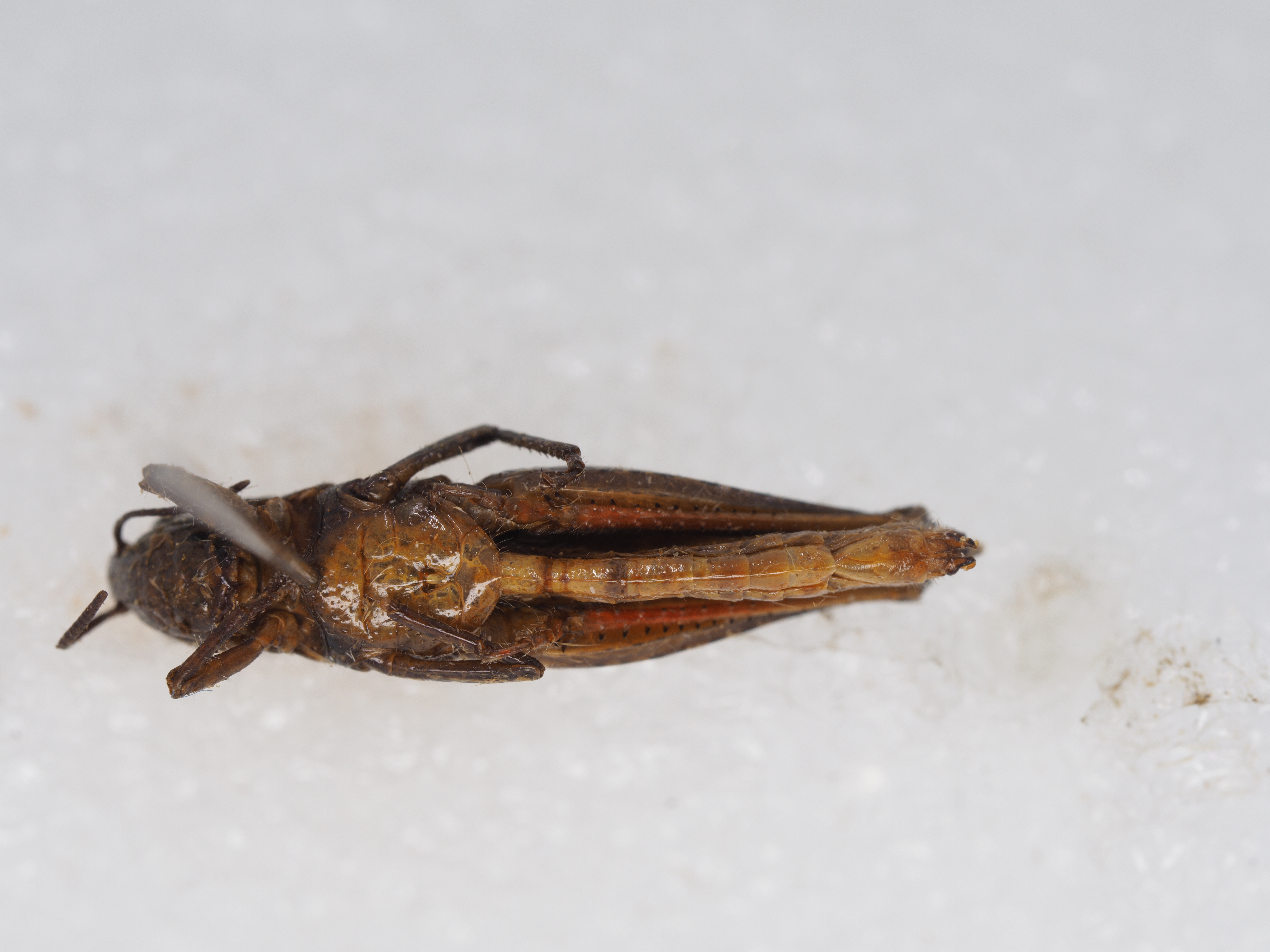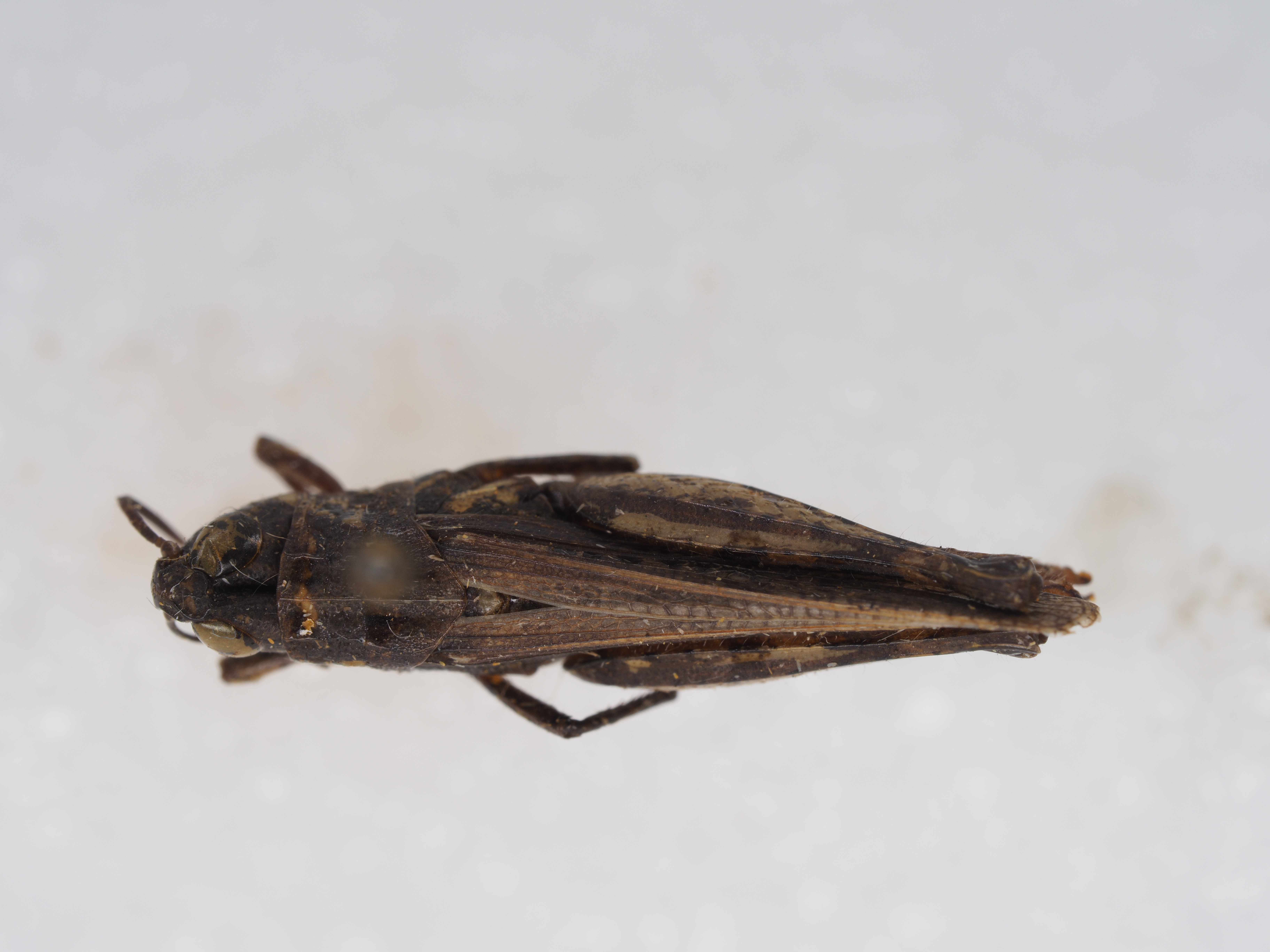 体色 褐色,眼后带黑褐色,直延伸到前翅的顶端。后翅透明,其端部为淡烟色。后足股节淡褐色,有时外侧较暗,上侧在基部和中部各具一条黑色横纹,内侧基部之半及近端部各具一个黑色斑纹,膝部黑褐色;后足胫节基部黑色,其余部分为橙黄色。腹部淡黄色。