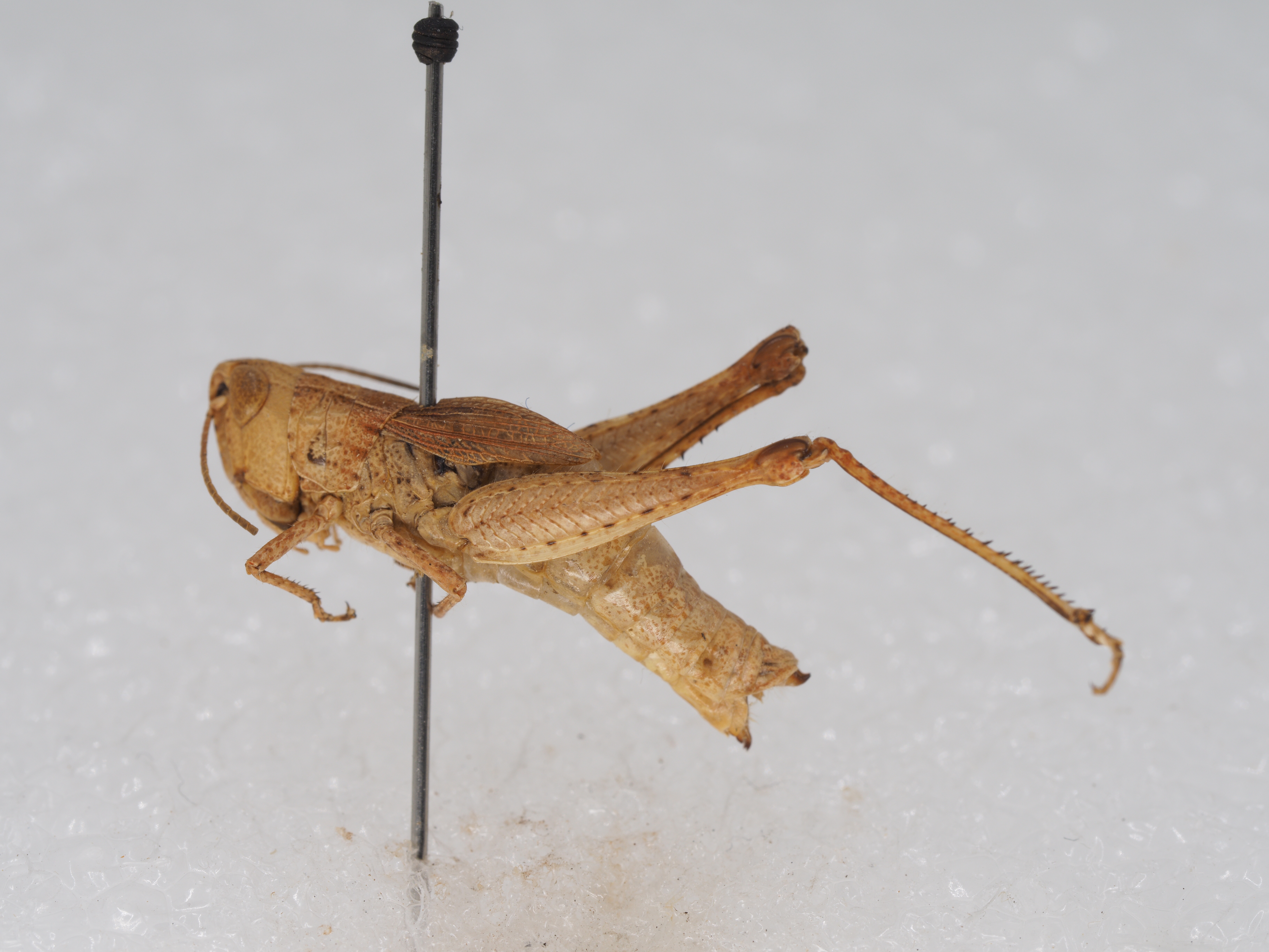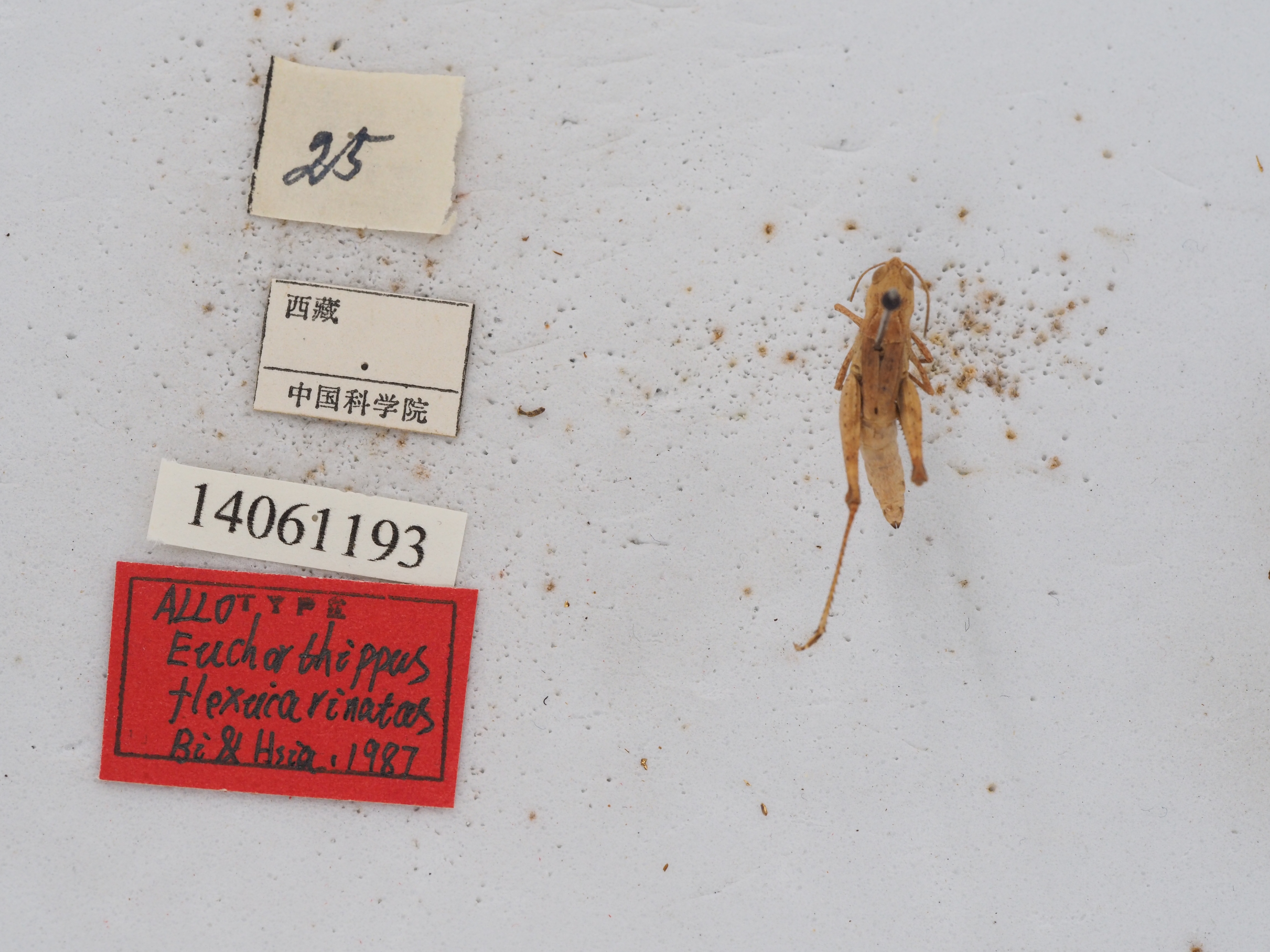 描述:雄性 体小型。头顶呈锐角形,较狭锐。头侧窝明显,长方形,其长为宽的2倍以上。颜面倾斜,颜面隆起较狭,两侧缘明显隆起,上端近平行,近唇基较扩展,中央具纵沟;颜面侧隆线略弯。触角丝状,到达或超过前胸背板后缘,中段一节的长度为宽度的2倍。复眼卵圆形,其纵径为横径的1.4倍,为眼下沟长度的1.6倍。前胸背板前缘平直,后缘呈弧形突出;侧隆线在沟前区明显弯曲,在沟后区较扩展,后横沟位近于中部,切断中、侧隆线,前横沟切断侧隆线,中横沟在背面不明显。中胸腹板侧叶间中隔宽大于长,其宽为长度的1.5倍;后胸腹板侧叶明显分开。前翅不发达,较宽短,顶端为圆形,到达腹部第5节中部;前翅的缘前脉域近基部较扩大,其顶端约到达前翅的中部。后翅退化,到达腹部第1节后缘。后足股节匀称,其长为宽的4倍;内侧音齿列在基部之半排列整齐。后足胫节外侧具刺11个,内侧12个,缺外端刺。爪间中垫略宽大,其长度不到达或到达爪之中部。鼓膜孔长卵形。肛上板三角形,顶端较锐,基部具纵沟。两侧缘至中段较隆起。尾须略扁锥形,超过肛上板端部,具细毛。下生殖板短锥形。阳具基背片内冠突的前叶甚大,与后叶毗连,桥较平。