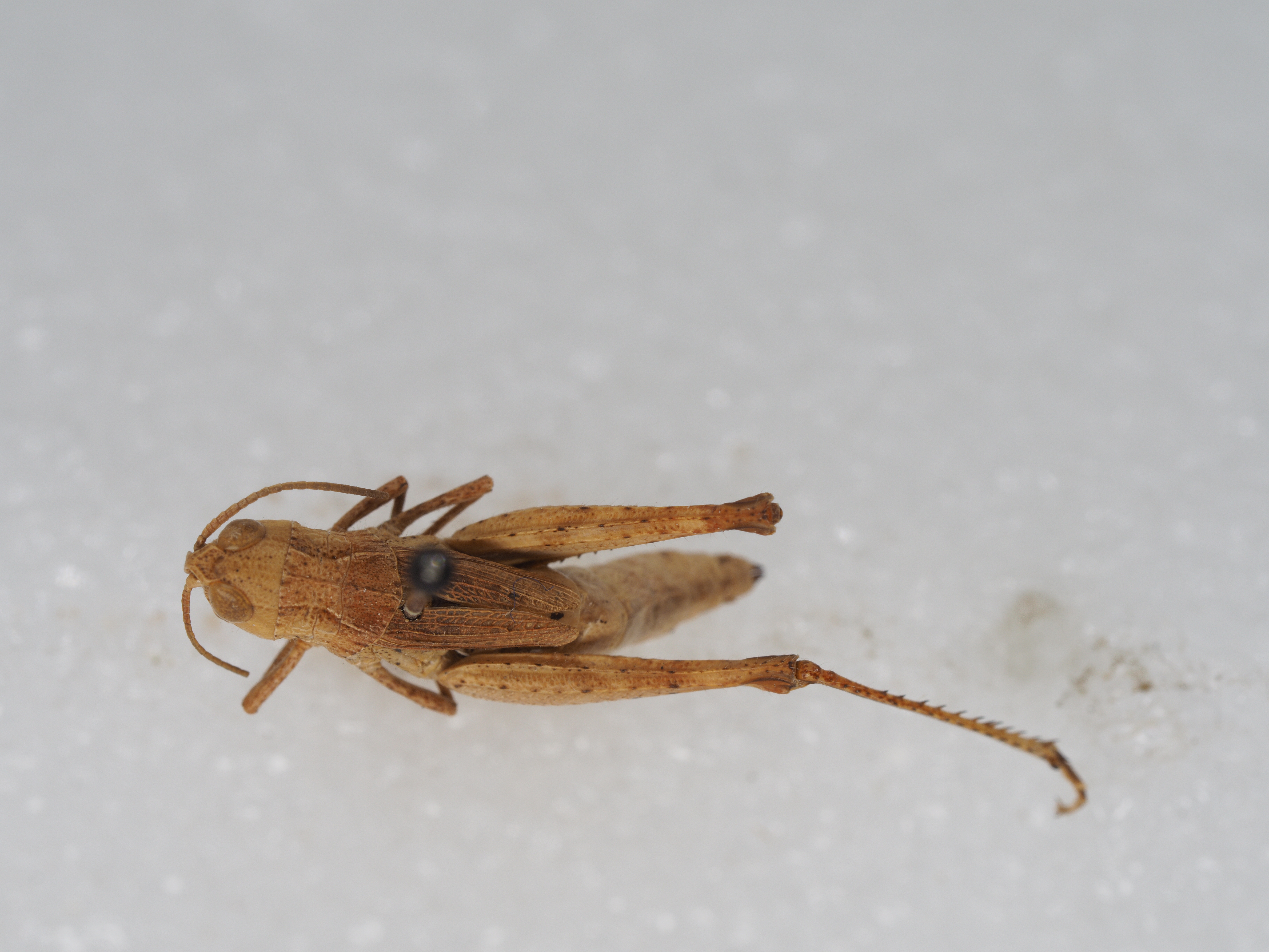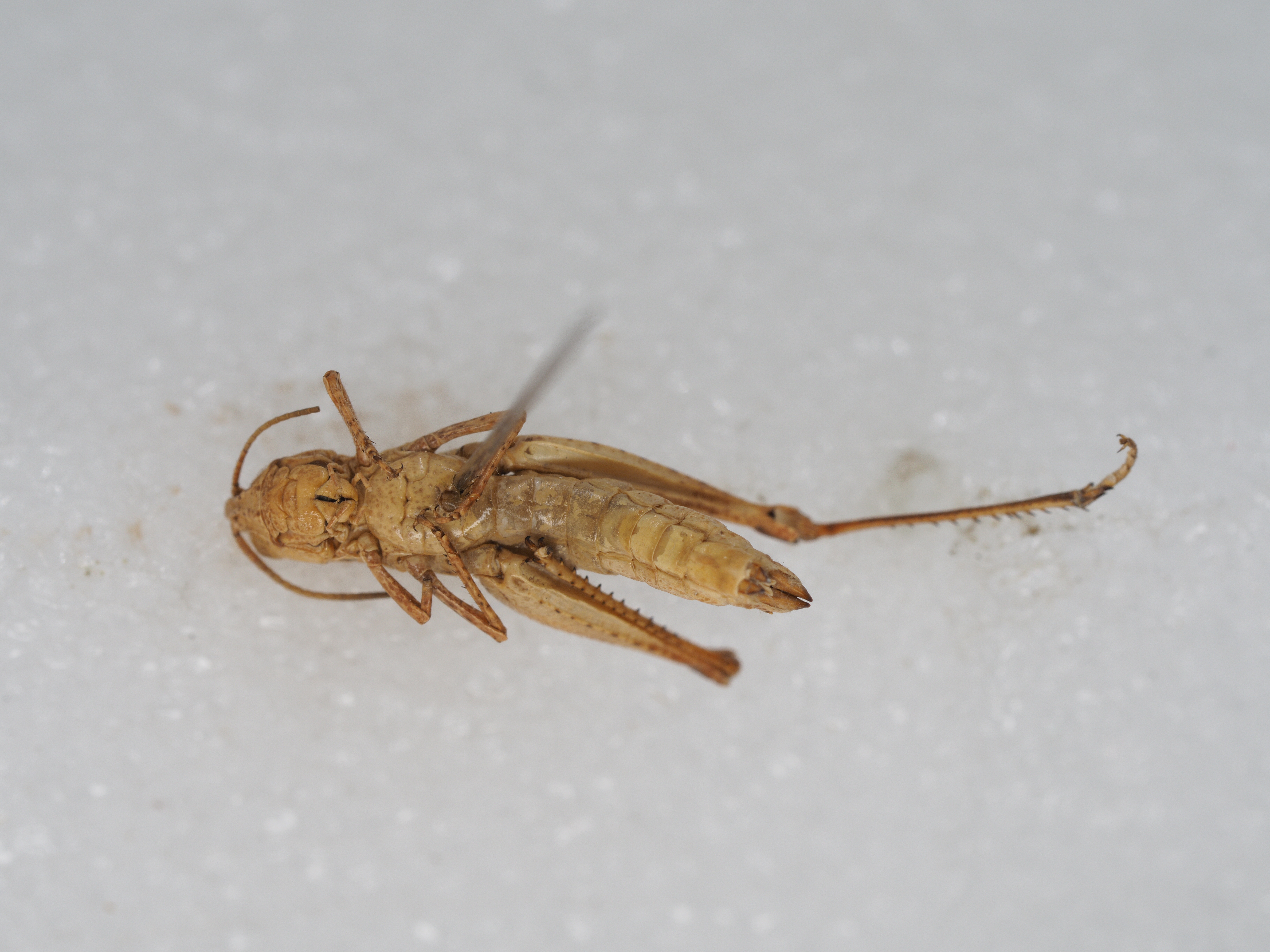 体色 黄褐色。具淡褐色眼后带,向后延伸至腹部侧面;后足股节端部淡褐色,内侧基部具一条短的弧形褐色条纹。