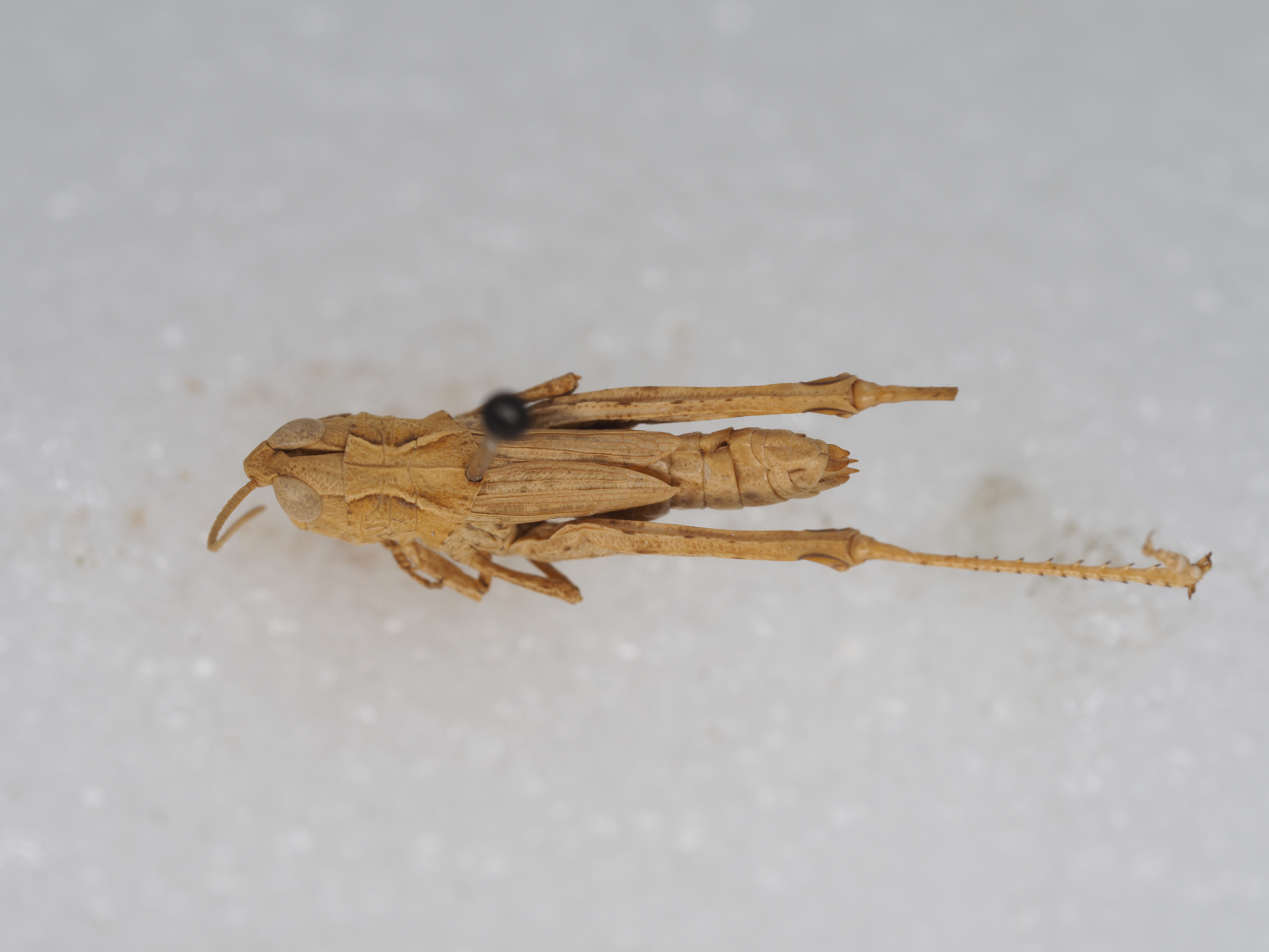 体色 黄褐色。具淡褐色眼后带,向后延伸至腹部侧面;后足股节端部淡褐色,内侧基部具一条短的弧形褐色条纹。