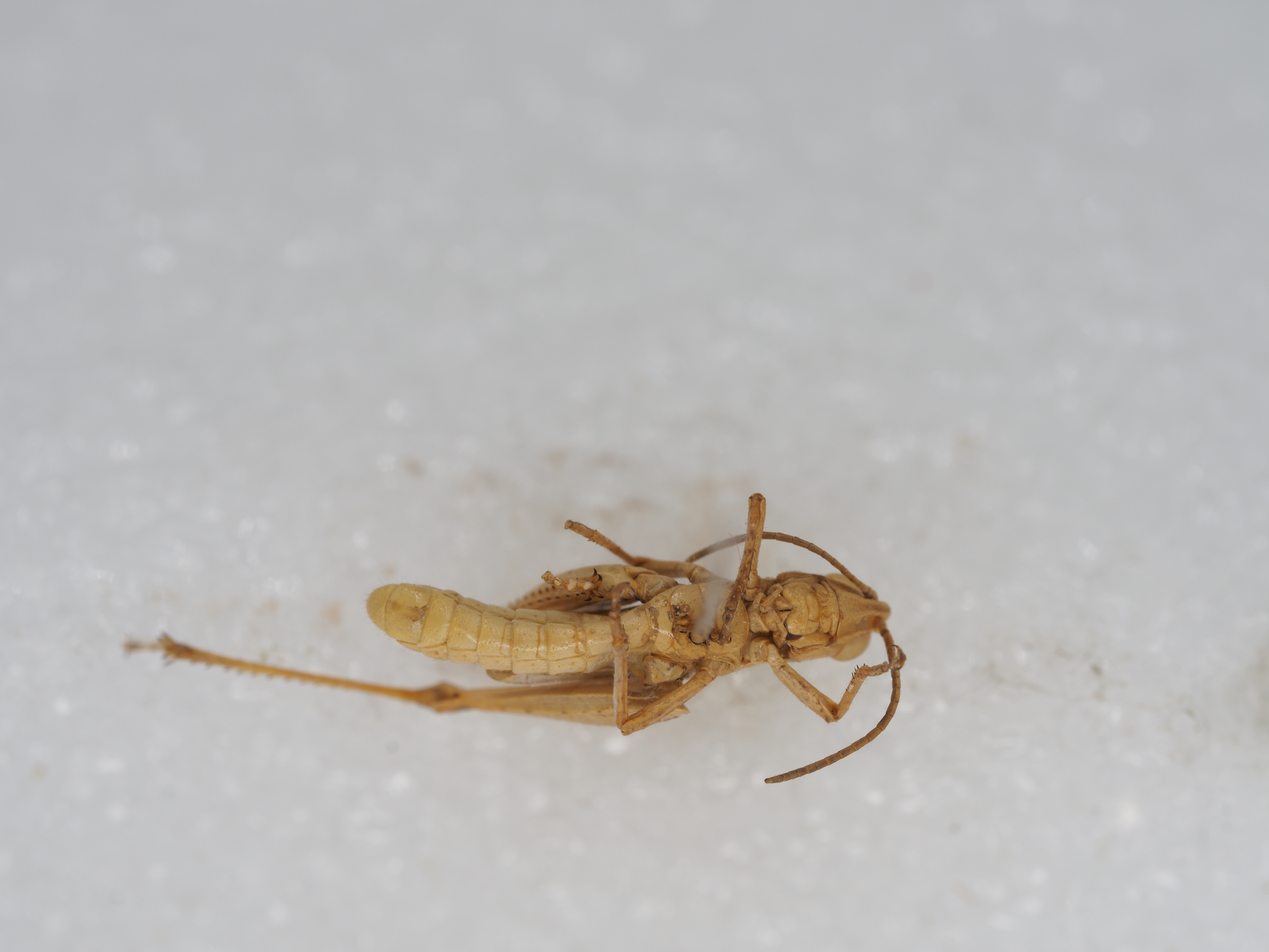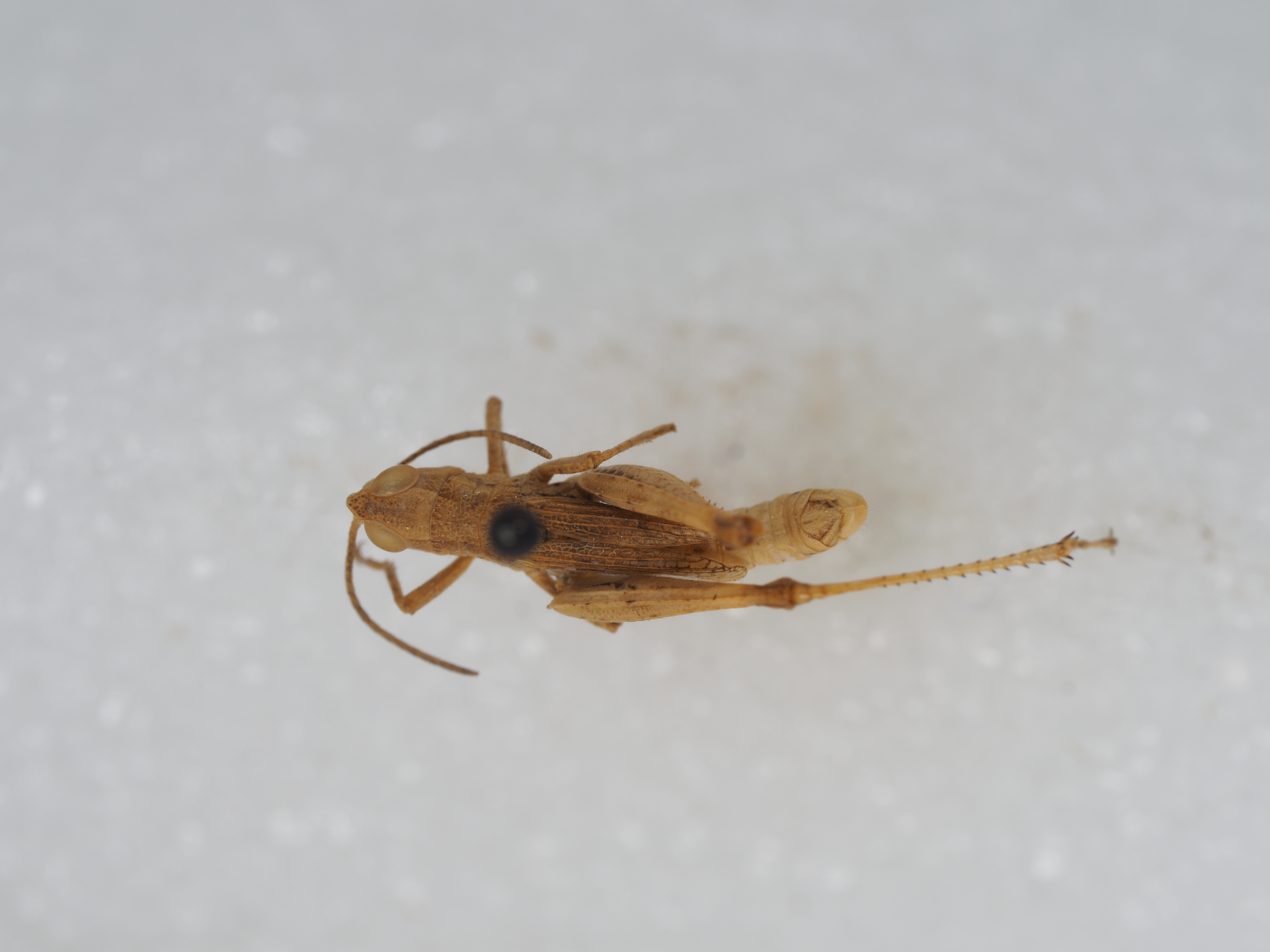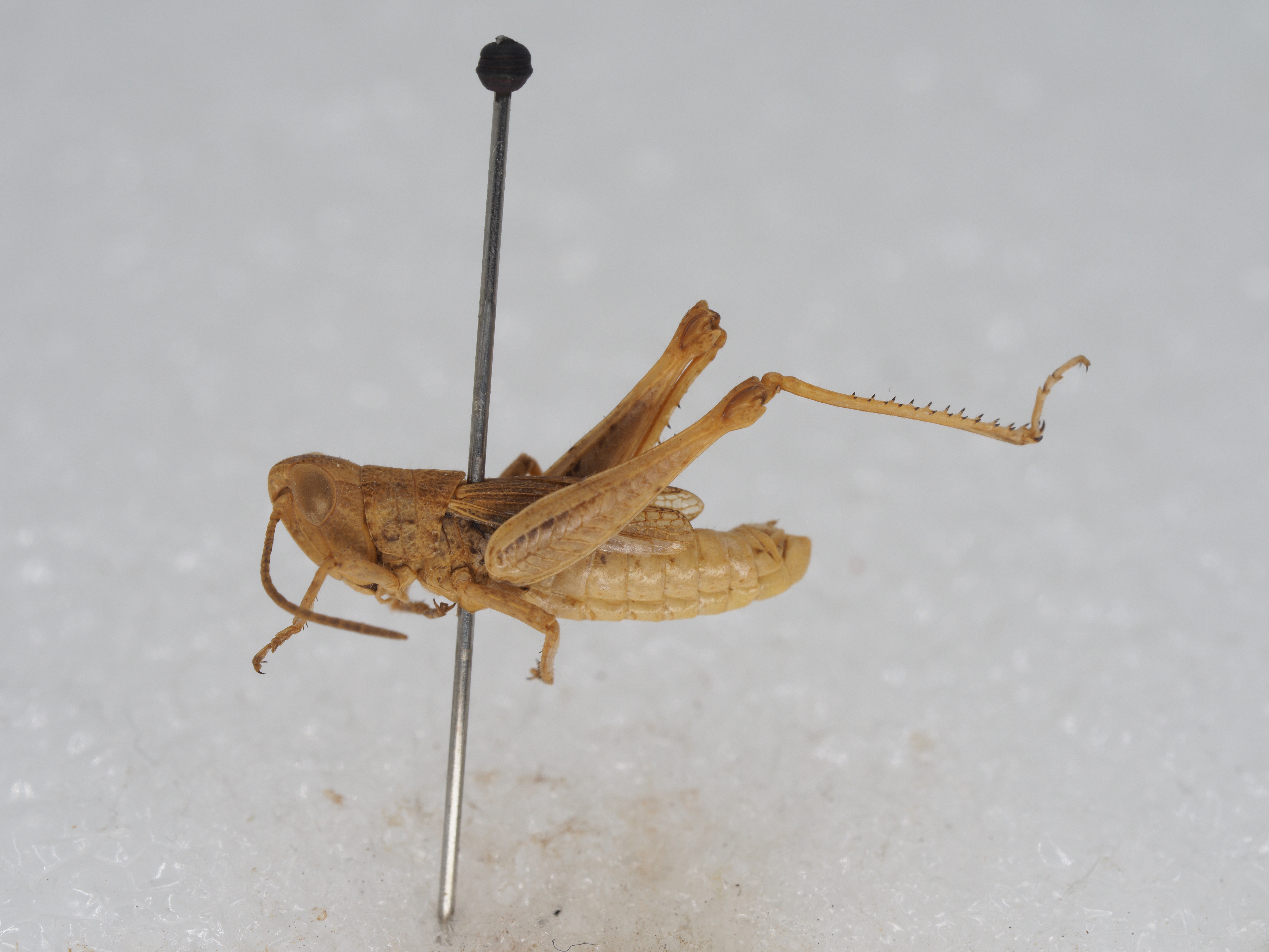 体色 黄褐色。具淡褐色眼后带,向后延伸至腹部侧面;后足股节端部淡褐色,内侧基部具一条短的弧形褐色条纹。