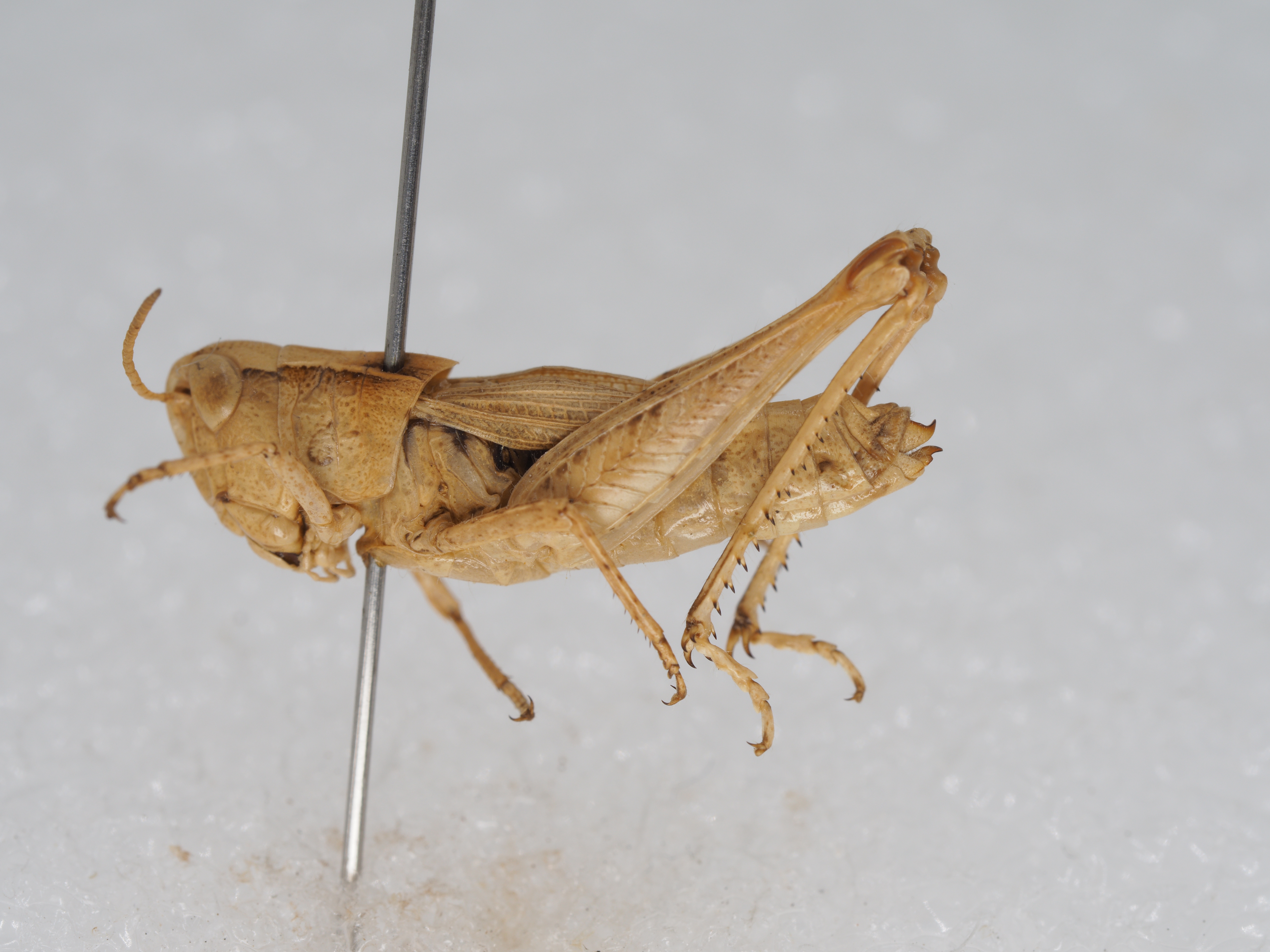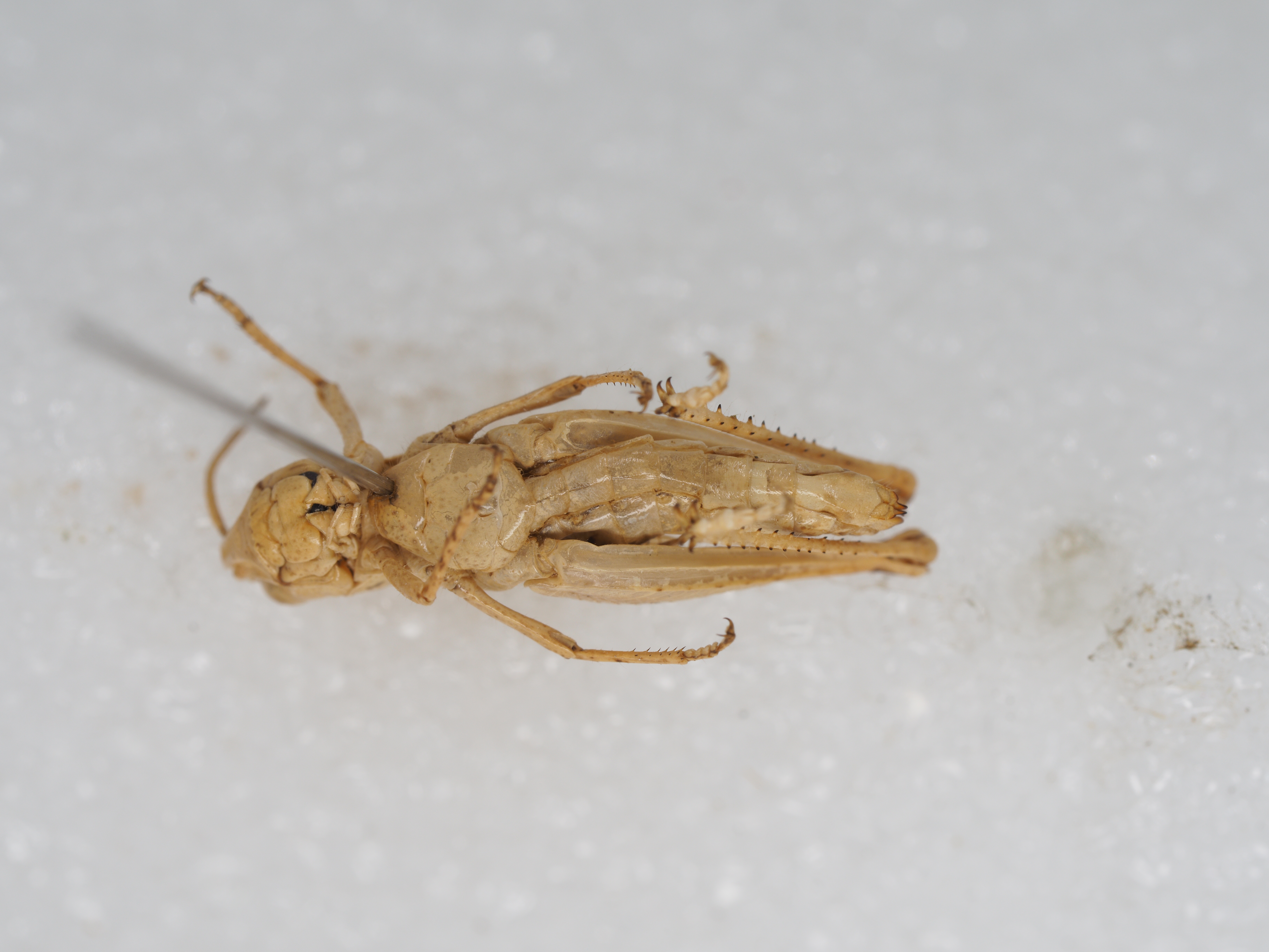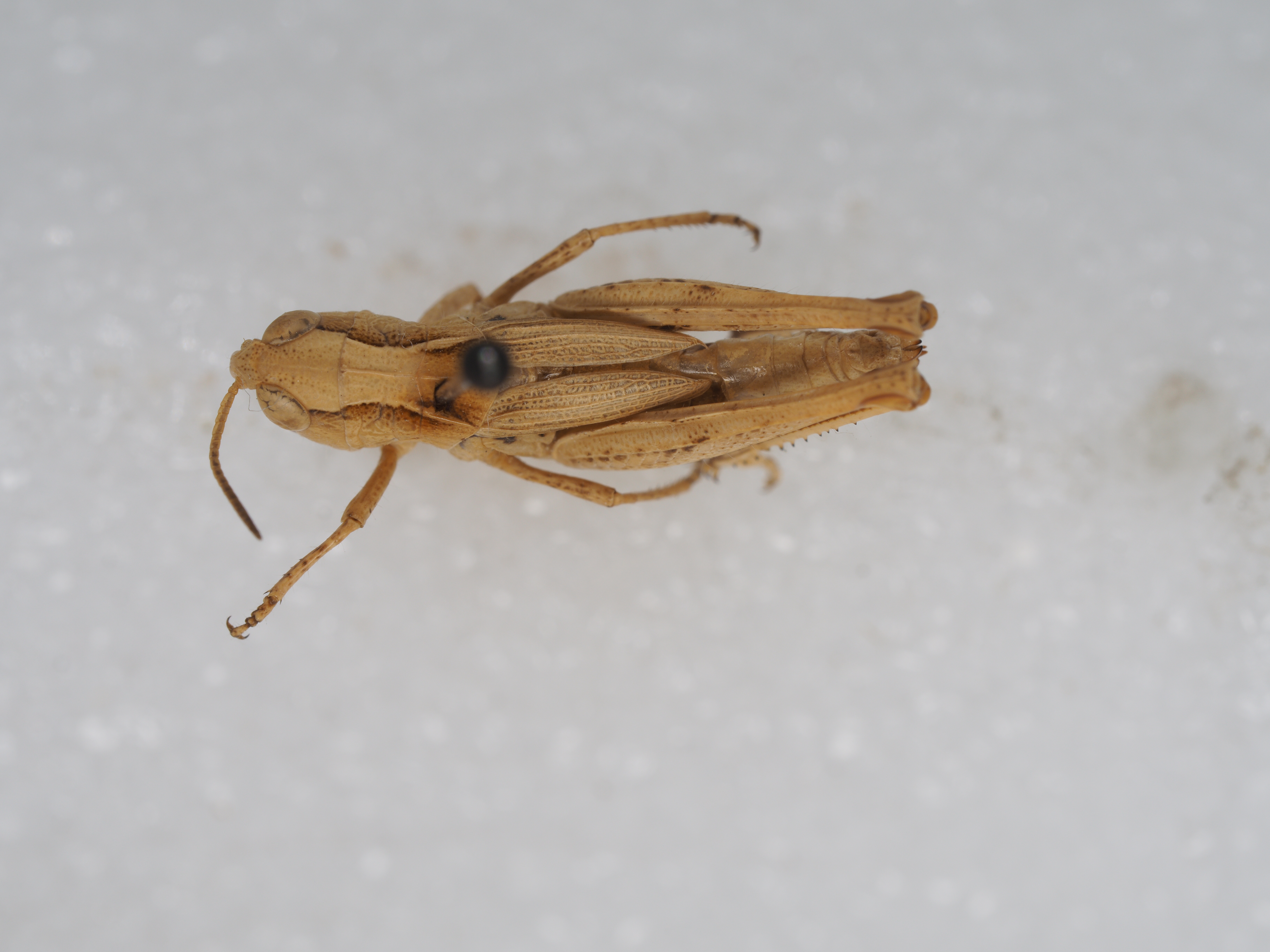 体色 黄褐色。具淡褐色眼后带,向后延伸至腹部侧面;后足股节端部淡褐色,内侧基部具一条短的弧形褐色条纹。