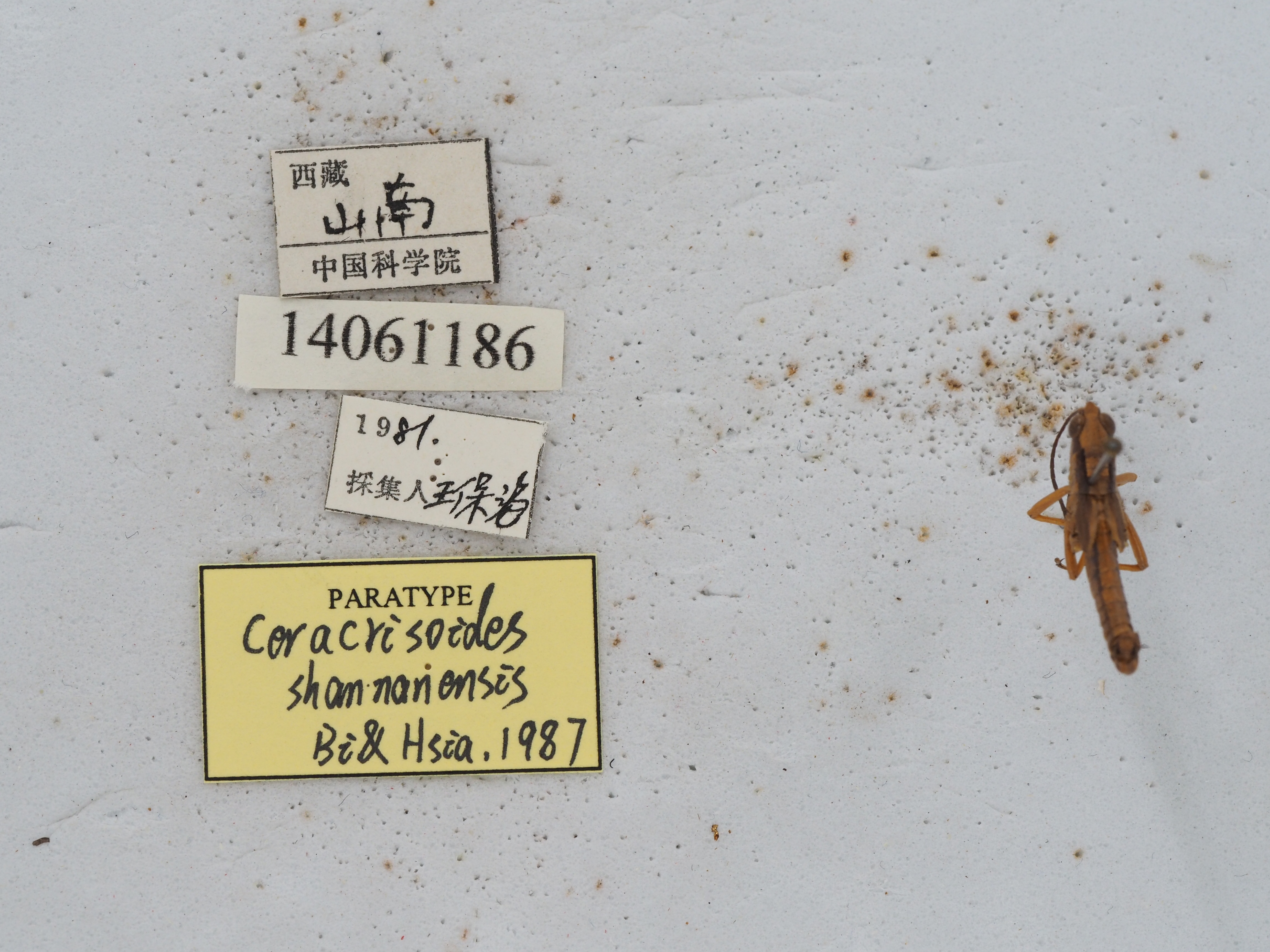 描述:雄性 体型中等,匀称(图119,a)。头较短,略短于前胸背板。头顶近乎等边三角形,顶端为锐角,中央低凹,缺中隆线。头侧窝不明显,极小,具刻点。颜面侧观明显向后倾斜,与头顶组成锐角;颜面隆起在中单眼之上近乎平行,中单眼之下向外扩展,中央具纵沟,并具少数粗刻点;颜面侧隆线明显,略弯。复眼卵形,凸出,其纵径约为横径的1.5倍,为眼下沟长的1.5倍。触角较长,其顶端超过前胸背板的后缘;基部数节略扁,中段一节的长度为其宽度的2.8倍。前胸背板背面较平;前缘平直,后缘呈圆弧形略向后突出;中隆线明显,侧隆线极不明显;3条横沟均明显,但仅后横沟割断中隆线;沟前区长于沟后区;前胸背板侧片的长略大于高。前胸腹板平坦。中胸腹板侧叶间的中隔宽大于长。后胸腹板侧叶相互分开。前、后翅均为鳞片状,侧置,顶端为狭圆形,其顶端到达或略超过腹部第二节背板的后缘;前翅长约为宽的2.8倍;中脉域缺中闰脉;后翅短于前翅。后足股节细长,其长约为宽的5.4倍;上侧中隆线平滑,其顶端形成锐齿;外侧上膝侧片顶端圆形。后足胫节略弯,具细毛,缺外端刺;上侧外缘具刺9—10个,内缘具刺10—11个(包括内端刺);内侧上、下距近乎等长。跗节第一节的长等于其余二节之和。爪间中垫较大,其顶端略不到达爪的端部。鼓膜器发达。肛上板舌状,顶端圆形,基部中央具纵沟,不到达中部。尾须圆锥形,侧扁,顶端较锐,具刻点和毛(图119,c)。下生殖板短锥形,端部钝圆。阳具基背片桥状,形态结构如图119,d。