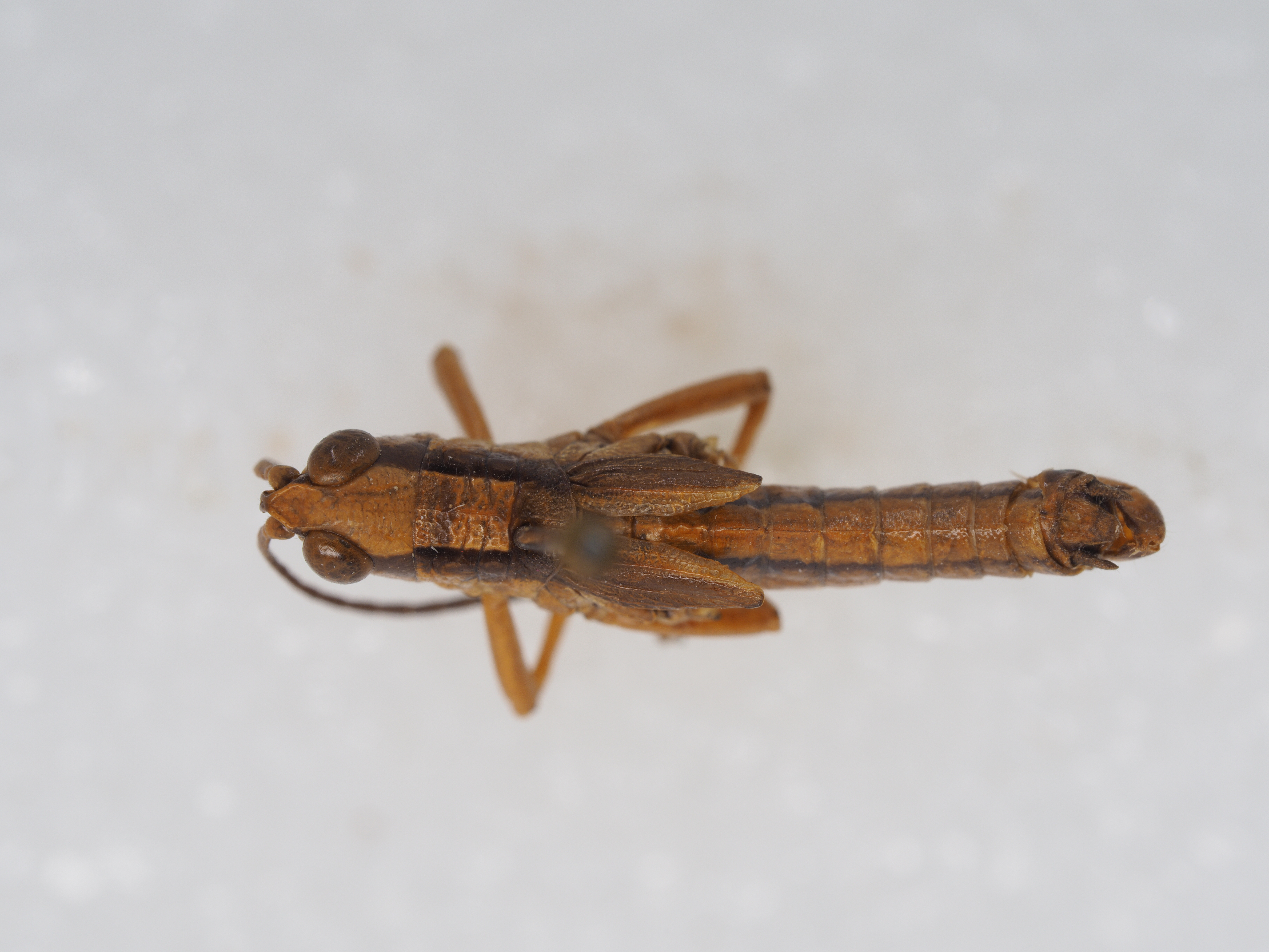 体色 黄褐色。自复眼之后,向后沿前胸背板侧片的上部、前翅大部分、腹部两侧至腹端具有褐色纵带纹。后足膝部、胫节的腹侧为黑褐色,胫节刺顶端为黑色;后足股节的膝前环和胫节的基前环均为淡黄色;后足胫节上侧为黄色,其下侧带黑色。
