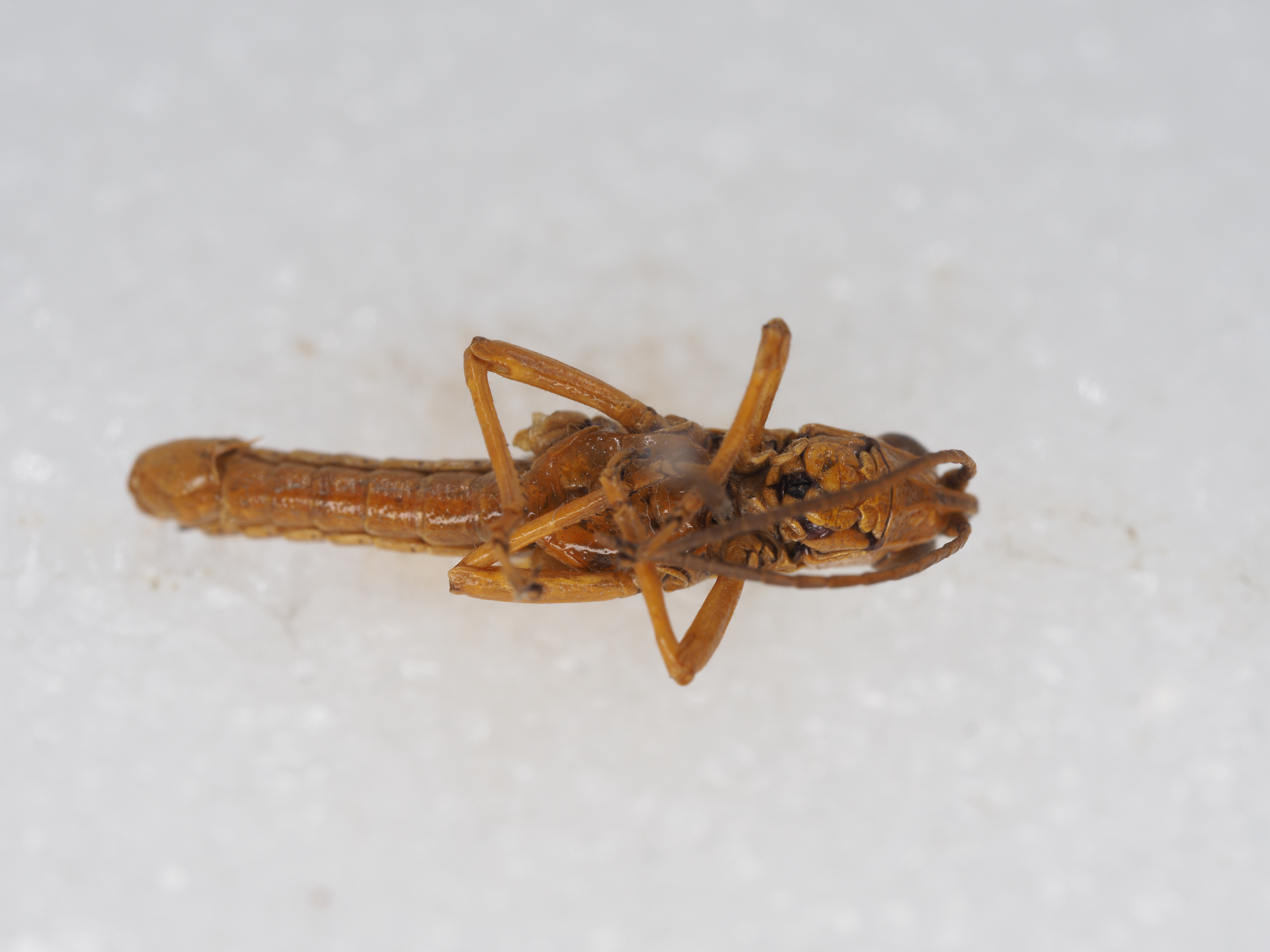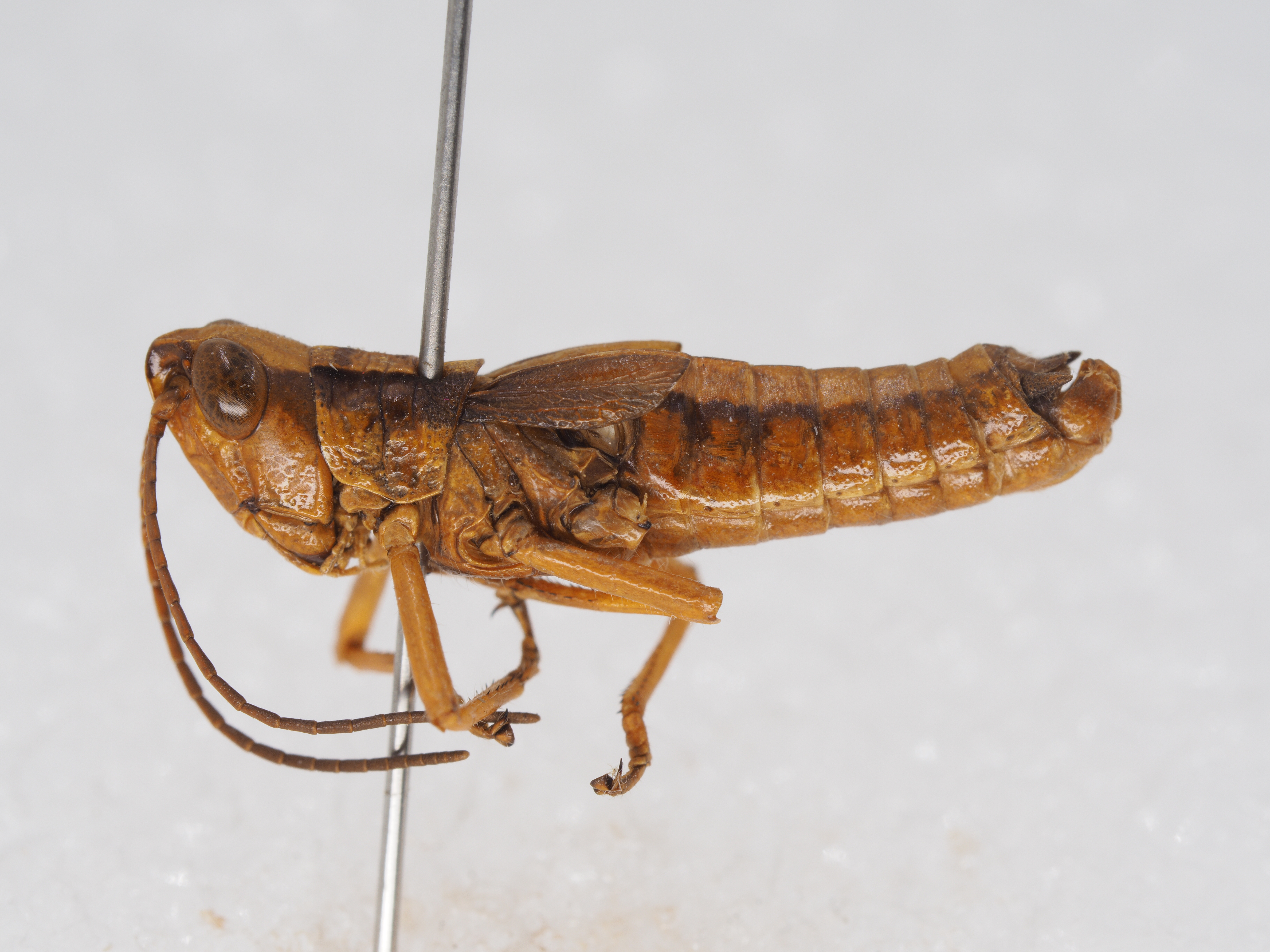 雌性 体型较粗大。触角顶端仅到达前胸背板的后缘,其中段一节的长度约为宽度的2.2倍。前翅的长度约为宽度的2.2倍。肛上板短舌状,顶端圆形。尾须圆锥形,较短,其顶端不到达肛上板的端部。下生殖板长大于宽,后缘中央具三角形突出。上、下产卵瓣的顶端呈弯钩形,上产卵瓣略长,其长约为高的2倍,其上缘近基部具齿。