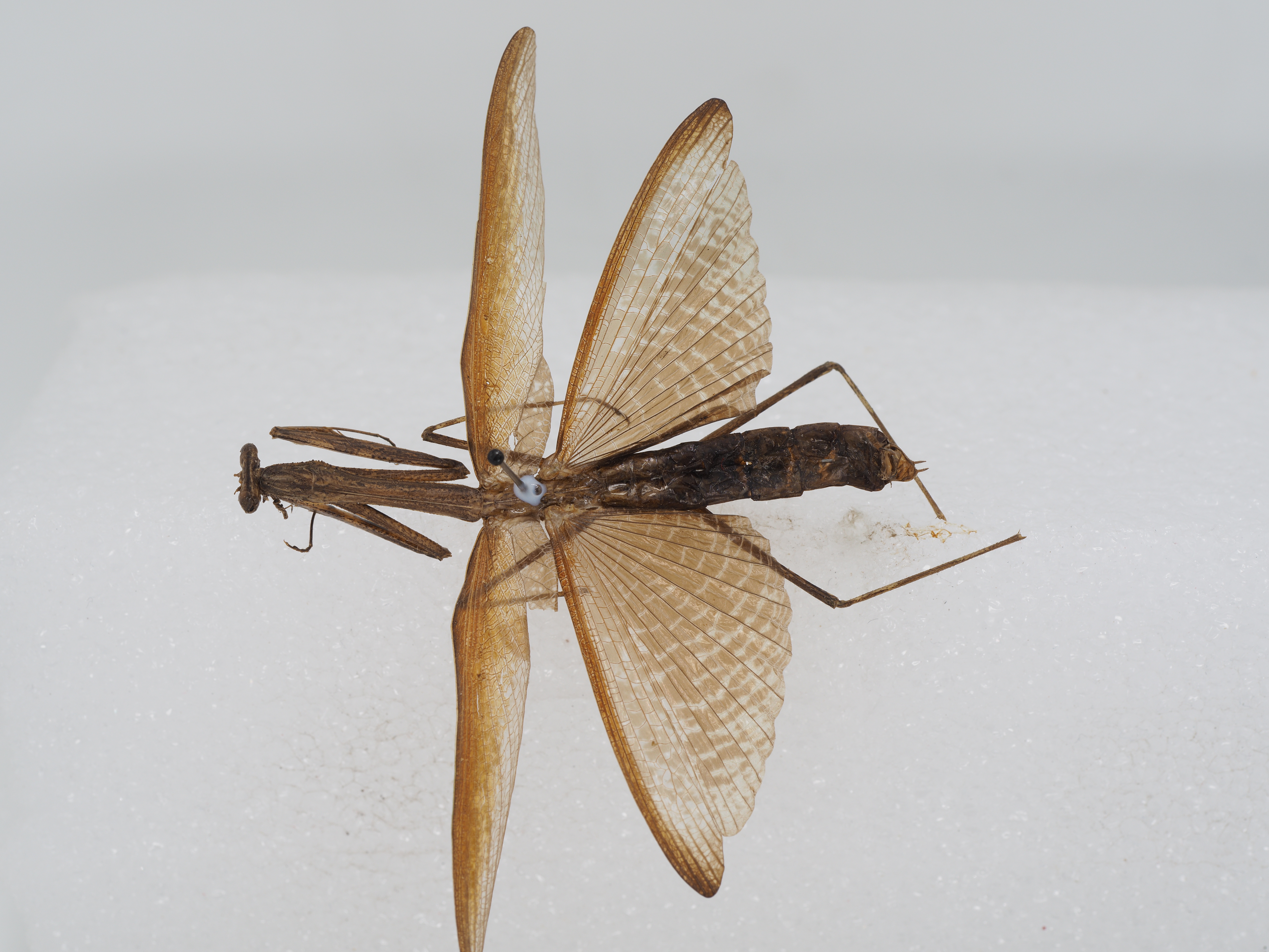 描述:雄性:体中型,头部额盾片为横向的新月形,复眼椭圆形,头顶在近触角基部具有两条白色横纹。前胸背板两侧具细齿,但在后端的齿较稀少或缺,中隆线在沟后区明显隆起,前翅超出腹端,其前缘域和中域不透明,后缘、较透明,翅痣为椭圆形,在其后缘具一明显的黑点。后翅半透明,Cu l 脉具有3一2分支。前足基节底侧具有5-6个淡黄色三角形齿,在各齿之间尚有若干小齿;在前端之半的内侧具有较多的颗粒。前足腿节具有13枚内列刺,前足胫节具有7枚外列刺和10-11枚内列刺。中、后足正常。雄性外生殖器:左上阳茎叶的拟阳茎明显突出;下阳茎叶末端具有两明显的凹陷。体色:体褐色。前胸腹板在前足基节之后具有一黑色横带,前翅前缘域黄褐色,臀膜烟褐色,半透明。后翅前缘域红褐色,其余烟褐色,前足基节内侧基部之半黑色, 其腿节外侧具有黑色斑点,内侧的内沟之后具有一黑色大斑,内沟之前也具有黑色横纹,两斑纹之间为一淡黄色大斑,内列刺的各大刺均为黑色。