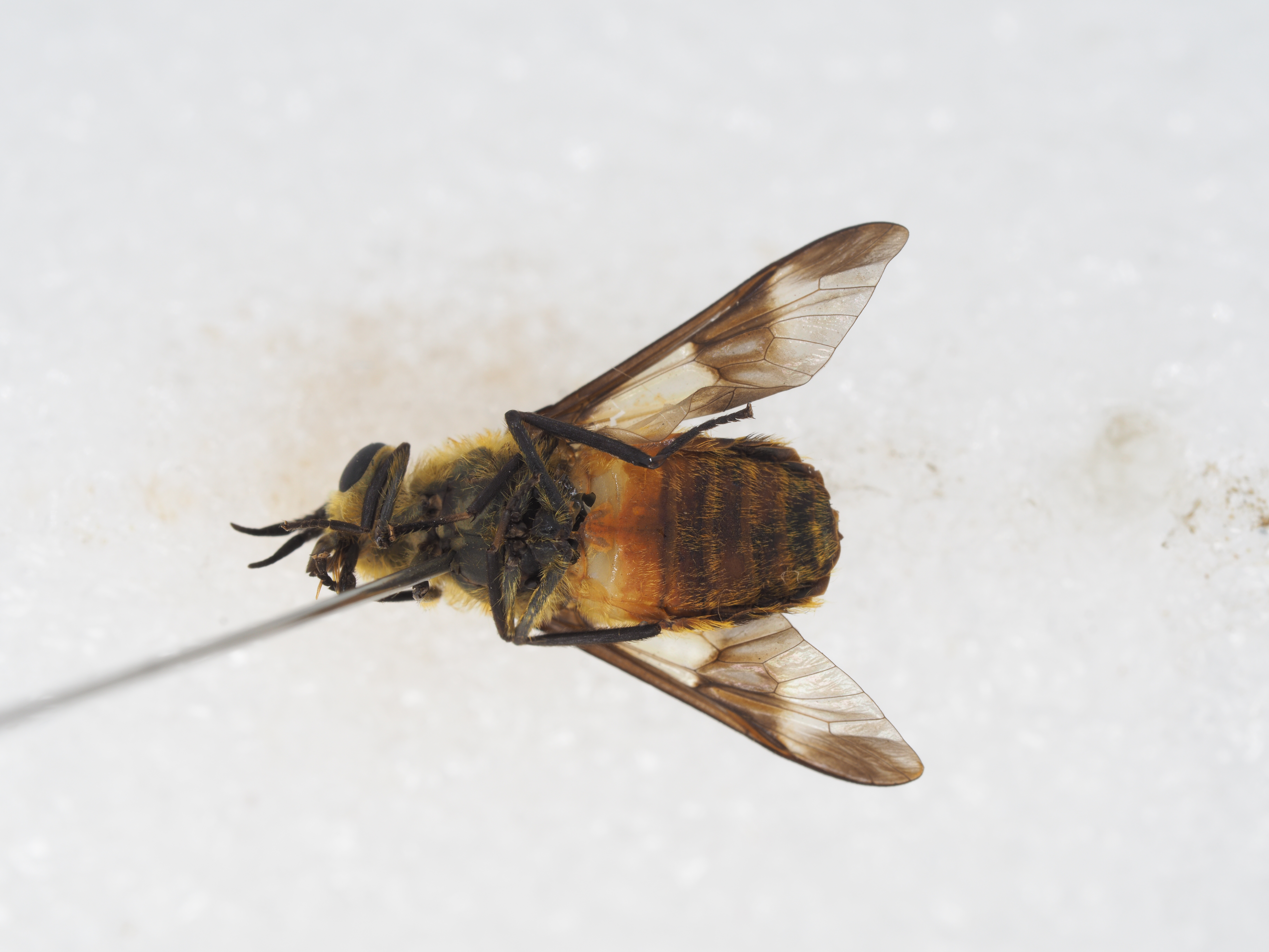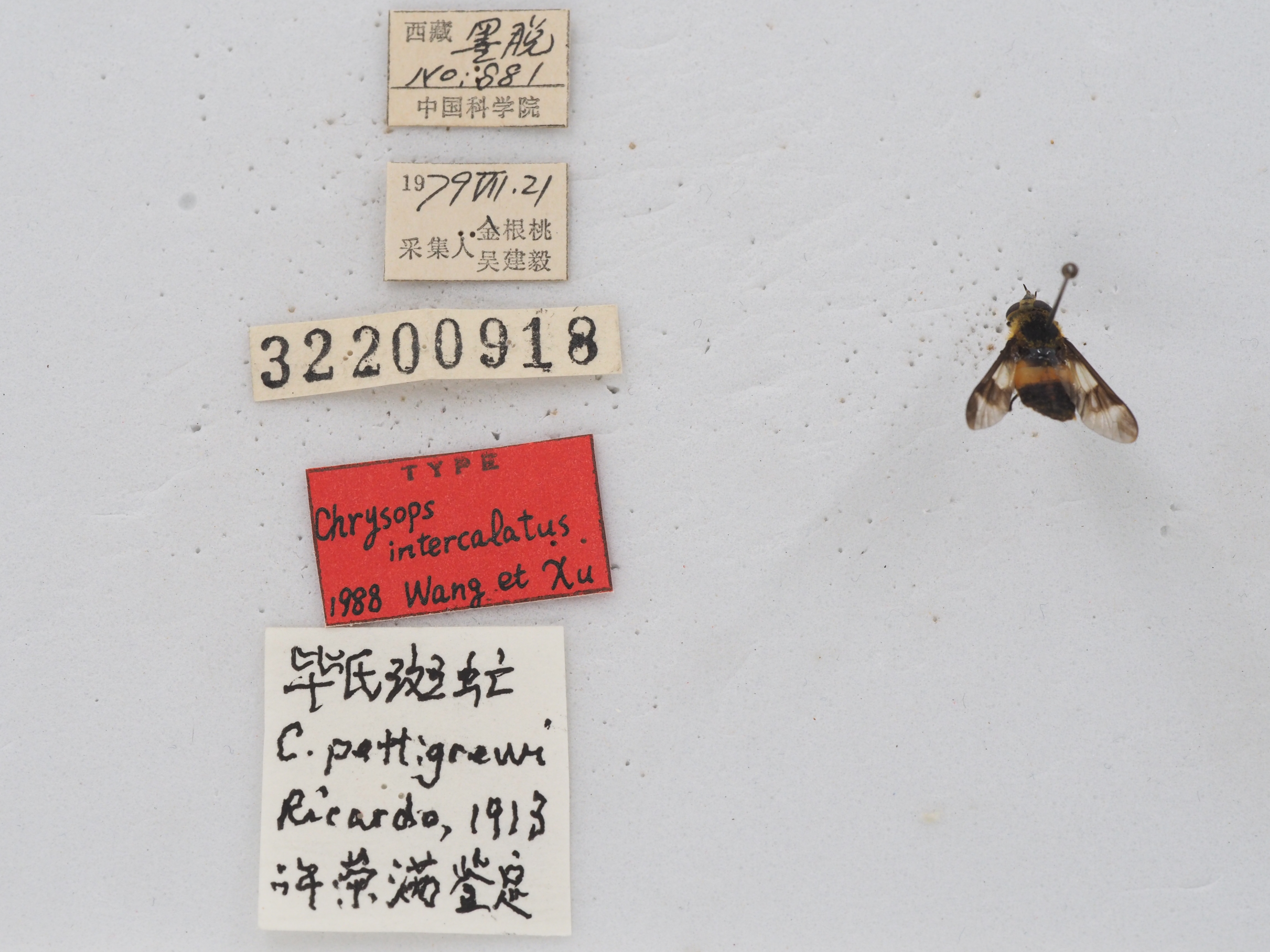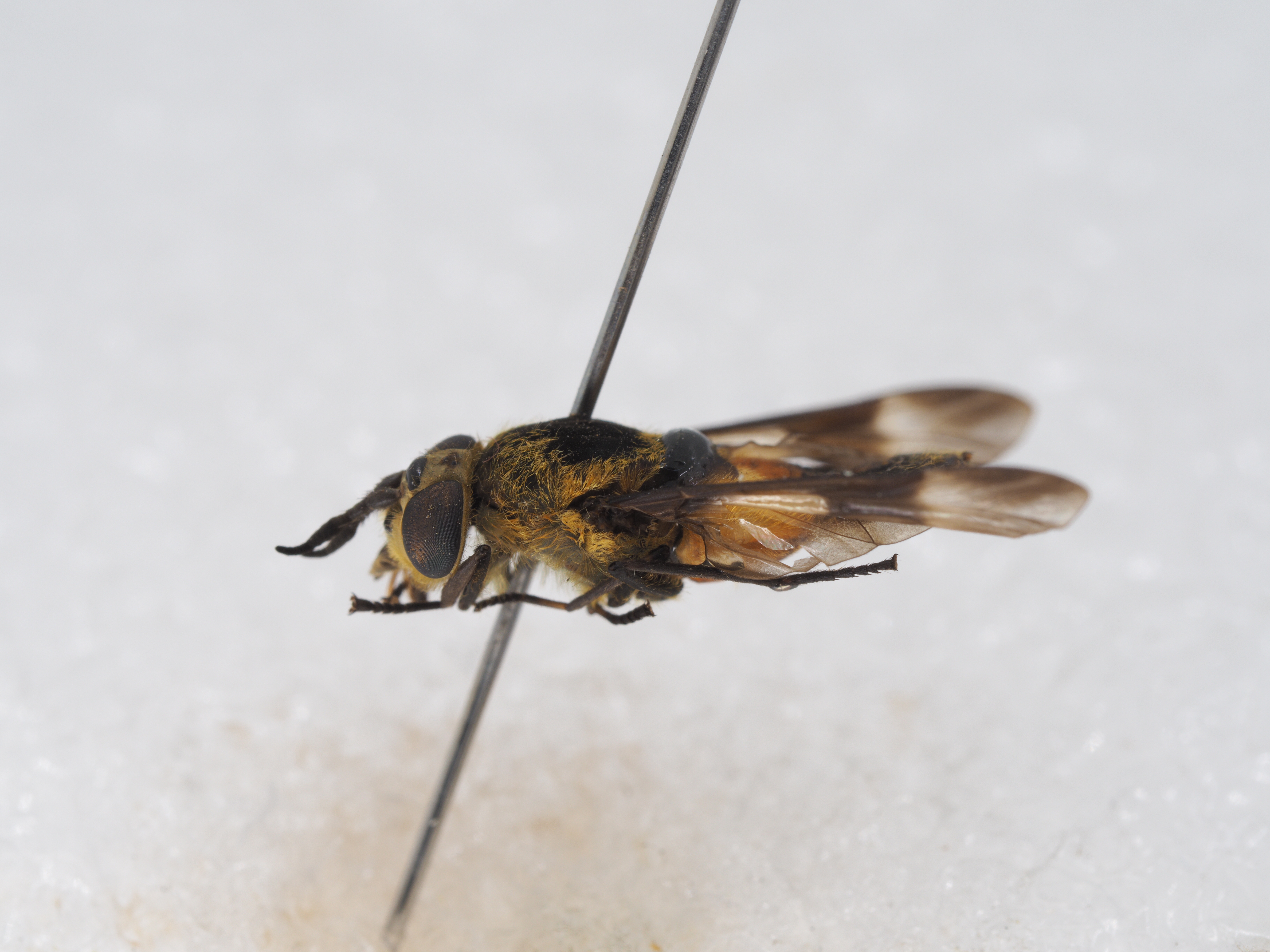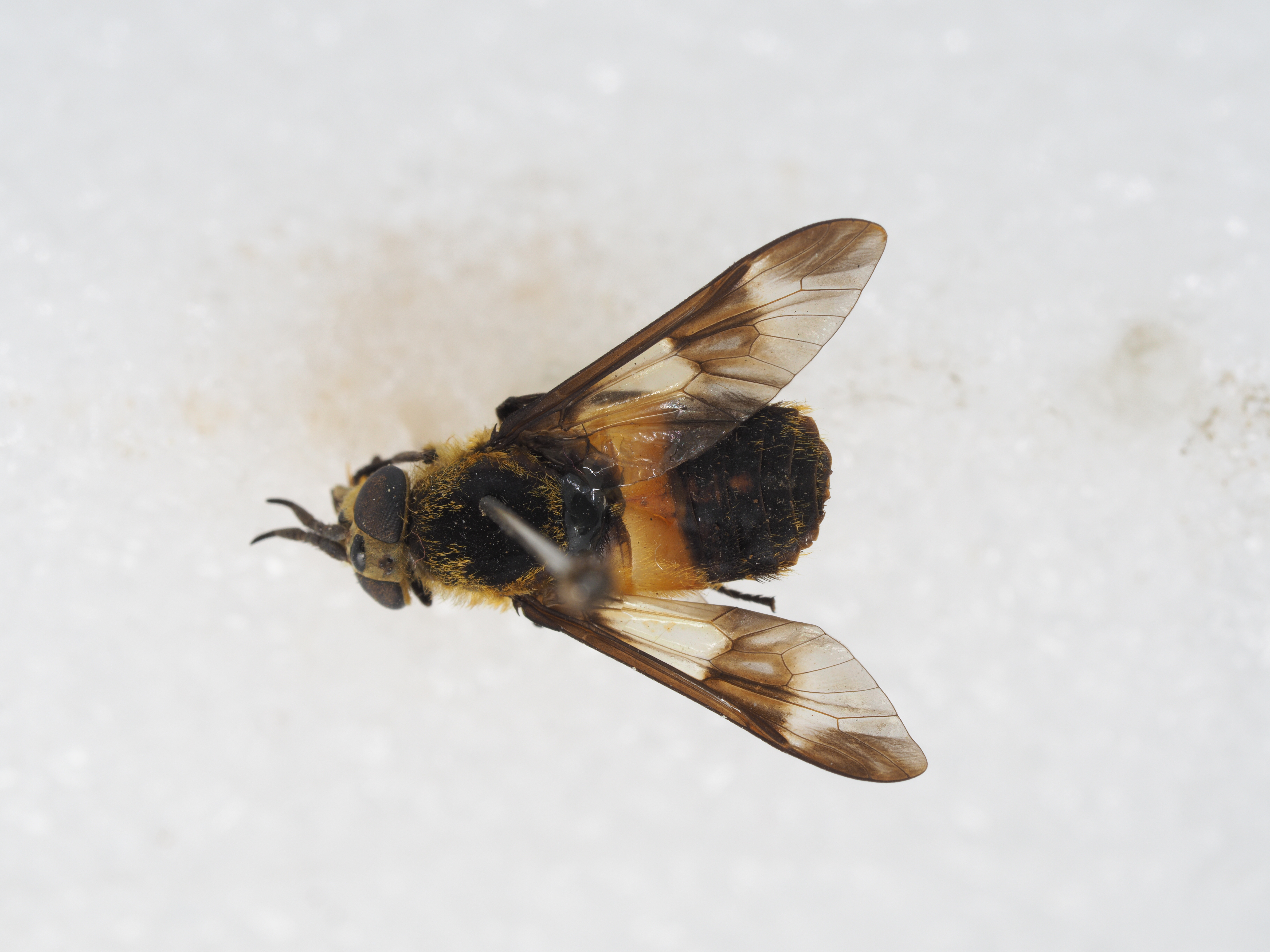 描述:头部: 前额覆黄色粉被, 具少量黑毛及棣色毛; 额基部宽度小于高度, 顶宽略窄于基宽; 额脚黑色, 与亚额接触, 与眼宽分离; 单眼区黑褐色, 无亮斑。颜、颊均覆黄灰色粉被, 着生黄毛夹杂少数黑毛; 颜脾黑色, 近圆形; 口毛金黄色。触角黑色, 第l、2节着生黑毛; 第1、2节之和短于第3节之长。颗须浅黑色, 覆金黄色粉, 着生金黄色毛, 第2节端部夹杂黑毛。胸部: 盾片及小盾片黑色, 着生金黄色毛, 无纵条。侧板及腹板灰黑色, 密生金黄色长毛。足黑色, 基节和股节着生金黄色毛, 胫节和咐节着生黑毛。翅端斑及横带斑皆为棕黑色; 端斑近圆形, 边缘界限不清楚, 占据R . 脉长度的叮5 ; 横带斑达翅缘, 中室中央透明。腹部: 第l 背板中央黑色, 两侧浅黄色; 第2背板浅黄色, 端部具狭窄的黑横带; 第3 背板中央及两侧具浅棕色小斑; 第4 背板中央具圆形斑; 其余背板黑色, 两侧金黄色毛, 中央夹杂短黑毛。第工。腹板浅棕色, 着生金黄色毛, 末端几节浅黑色, 着生黑色夹杂金黄色毛。雄虫: 未详。