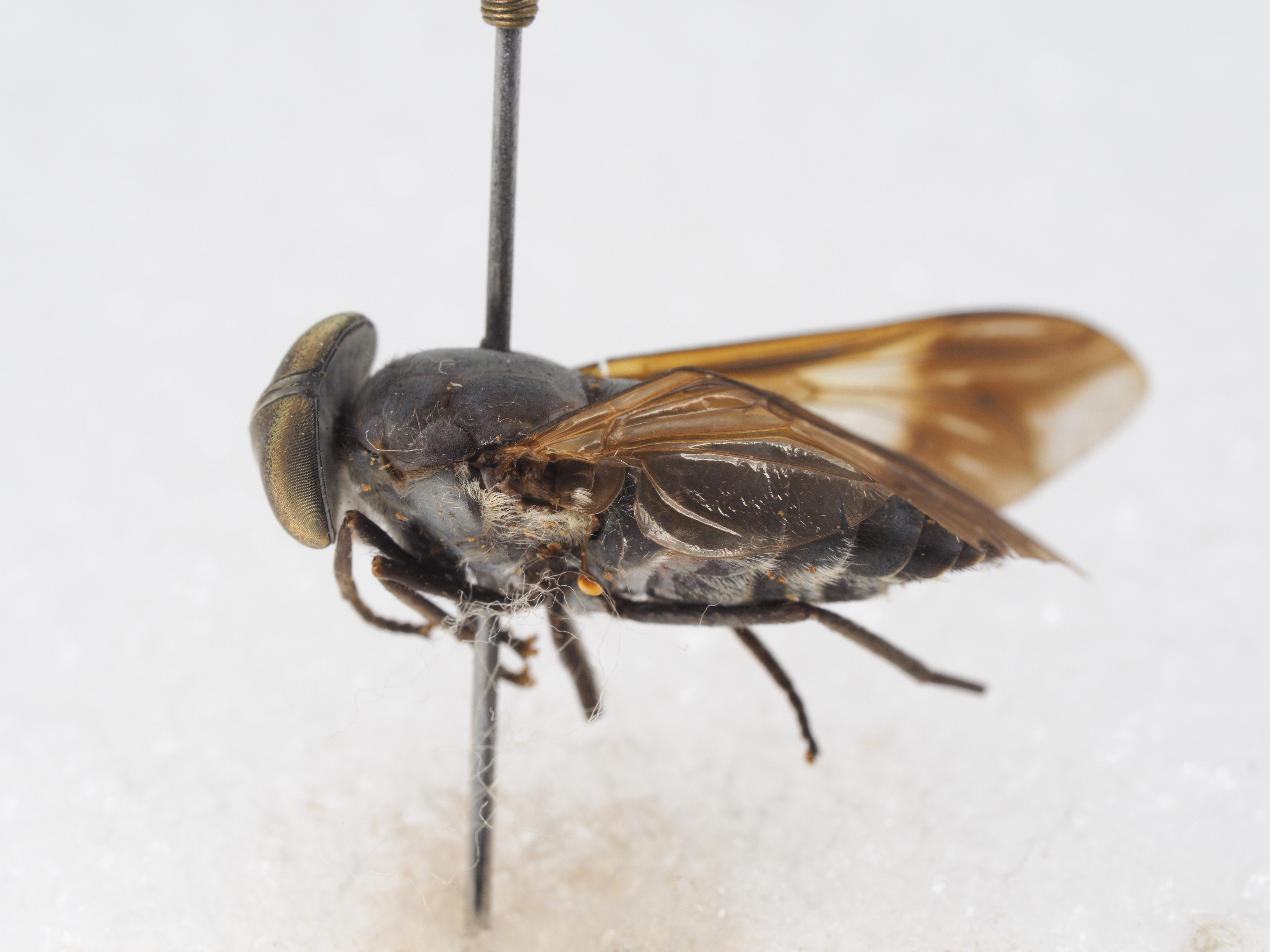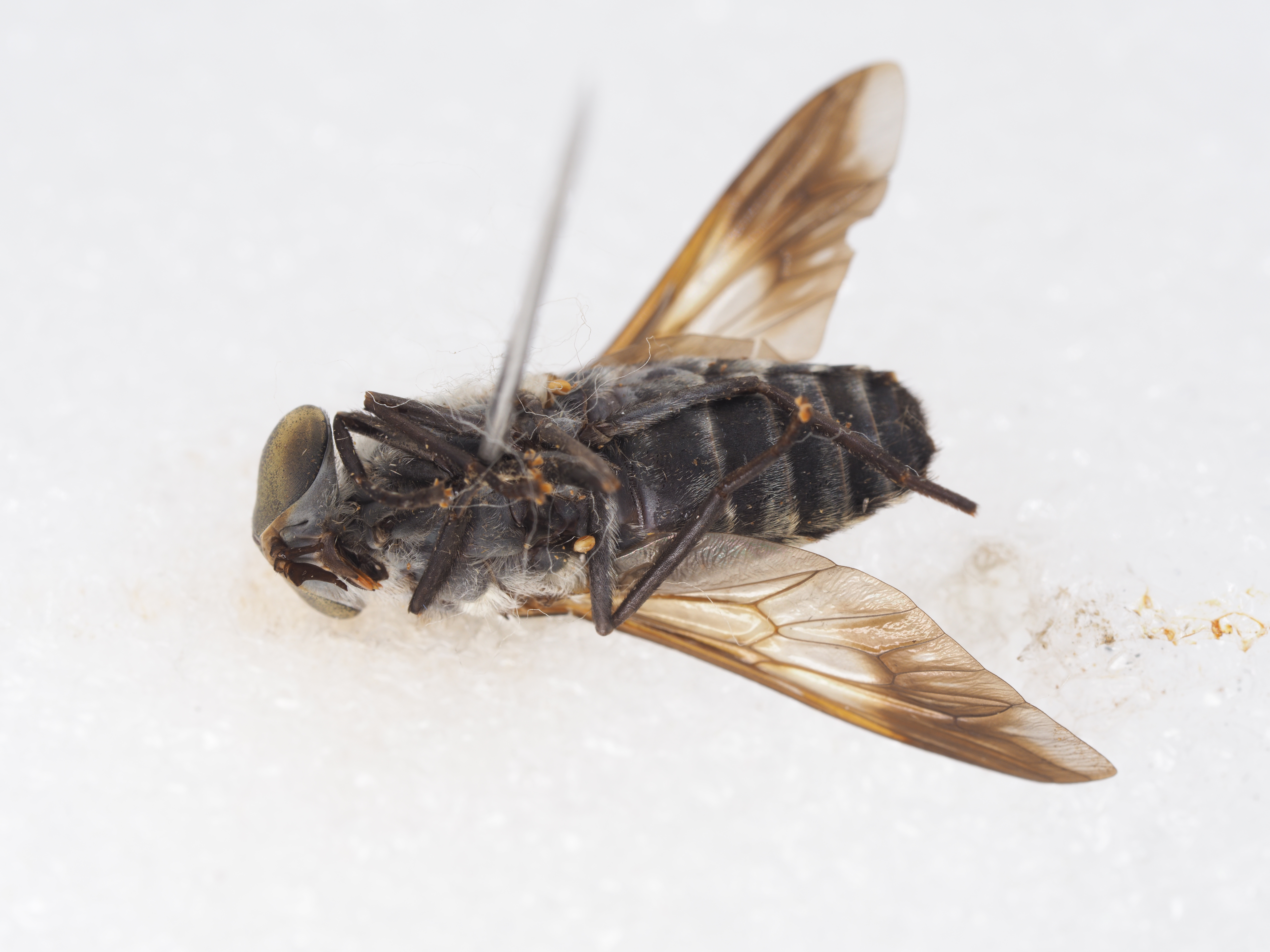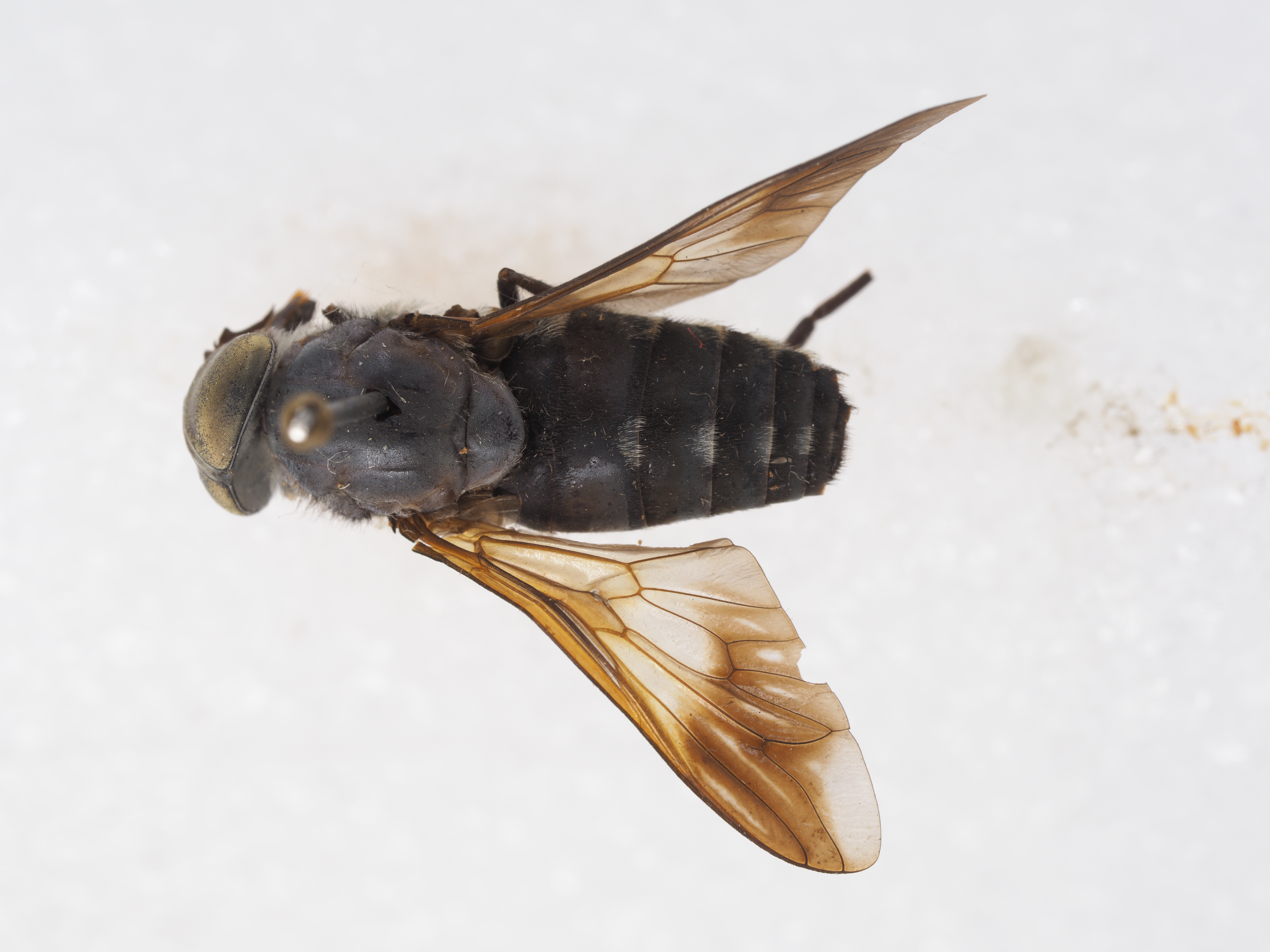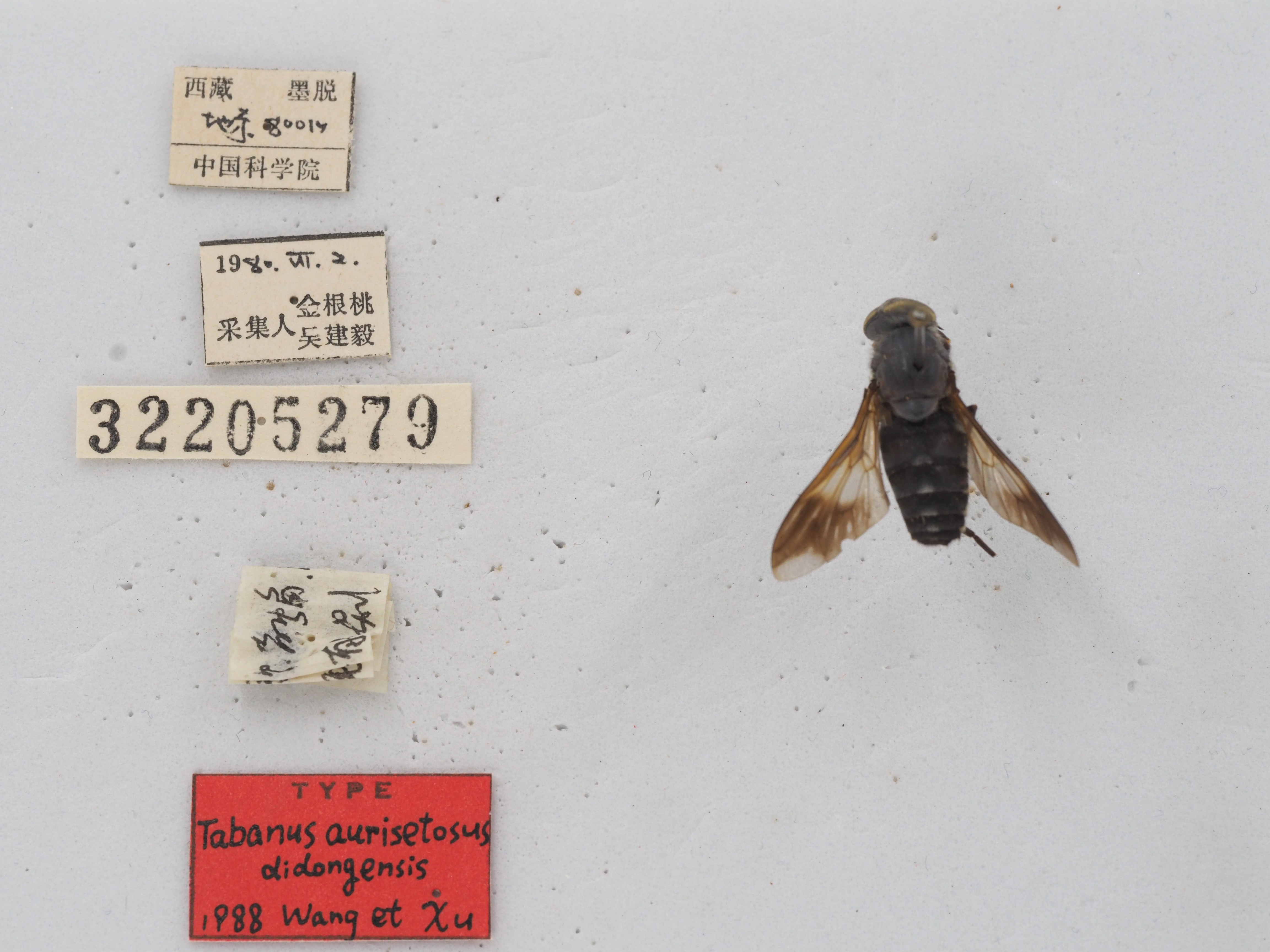 描述:头部: 眼深兰色无带( 回潮)。额灰白色, 着生黑色毛及少数白色毛; 额高约为基宽的8 . 8倍; 基脚黑棕色, 长卵形, 中脚为基脚的延线状, 伸达额高的2 / 3 以上。亚额褐色, 被褐色粉。颊上半部色同亚额, 下半部灰白色, 着生浅棕色毛; 颜灰自色, 着生同色毛: 口毛白色。触角黑棕色, 柄节和梗节着生黑毛, 鞭l 节长约为宽的2倍, 背面具一直角突。鄂须淡棕色,着生黑毛, 第2节长约为宽的5倍, 末端失。胸部: 盾片、小盾片均为黑色, 着生黑毛; 盾片中央及两侧具5条棕色细纵线。侧板灰黑色, 着生浅色毛。足棕黑色, 均着生黑毛, 股节色稍深。翅呈浅棕色透明, 具褐色横带, 但第l 、3径室及第l 、4后室中央具透明小斑; 第1后室封闭, R . 脉具附脉。平衡棒棕黄色。腹部: 黑色, 着生黑色毛; 第2 5背板后缘中央具三角白色斑: 各节背板两侧着多白毛。腹板黑色, 着生黑毛, 第2 6腹板后缘具明显的白毛带。雄虫: 未详。