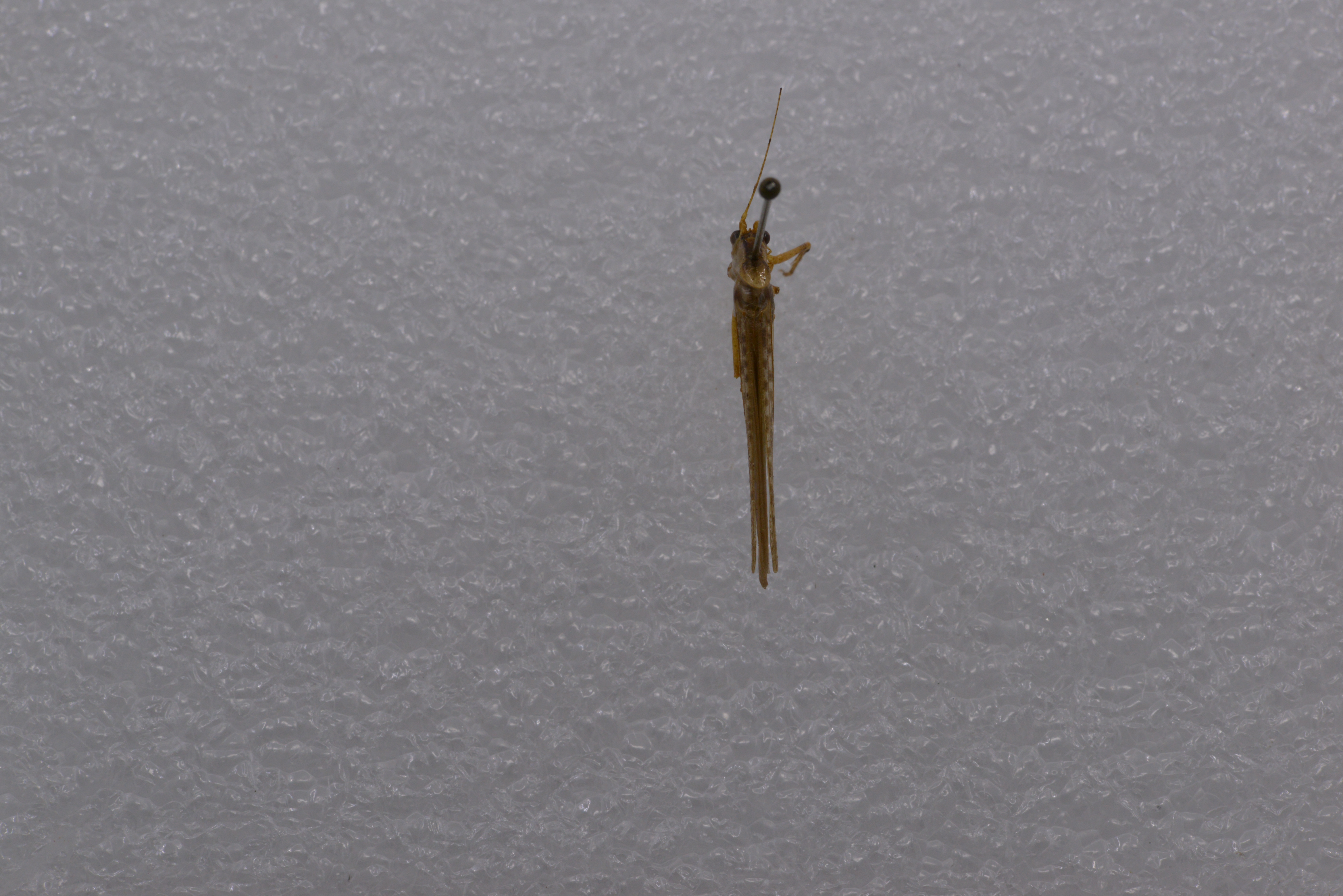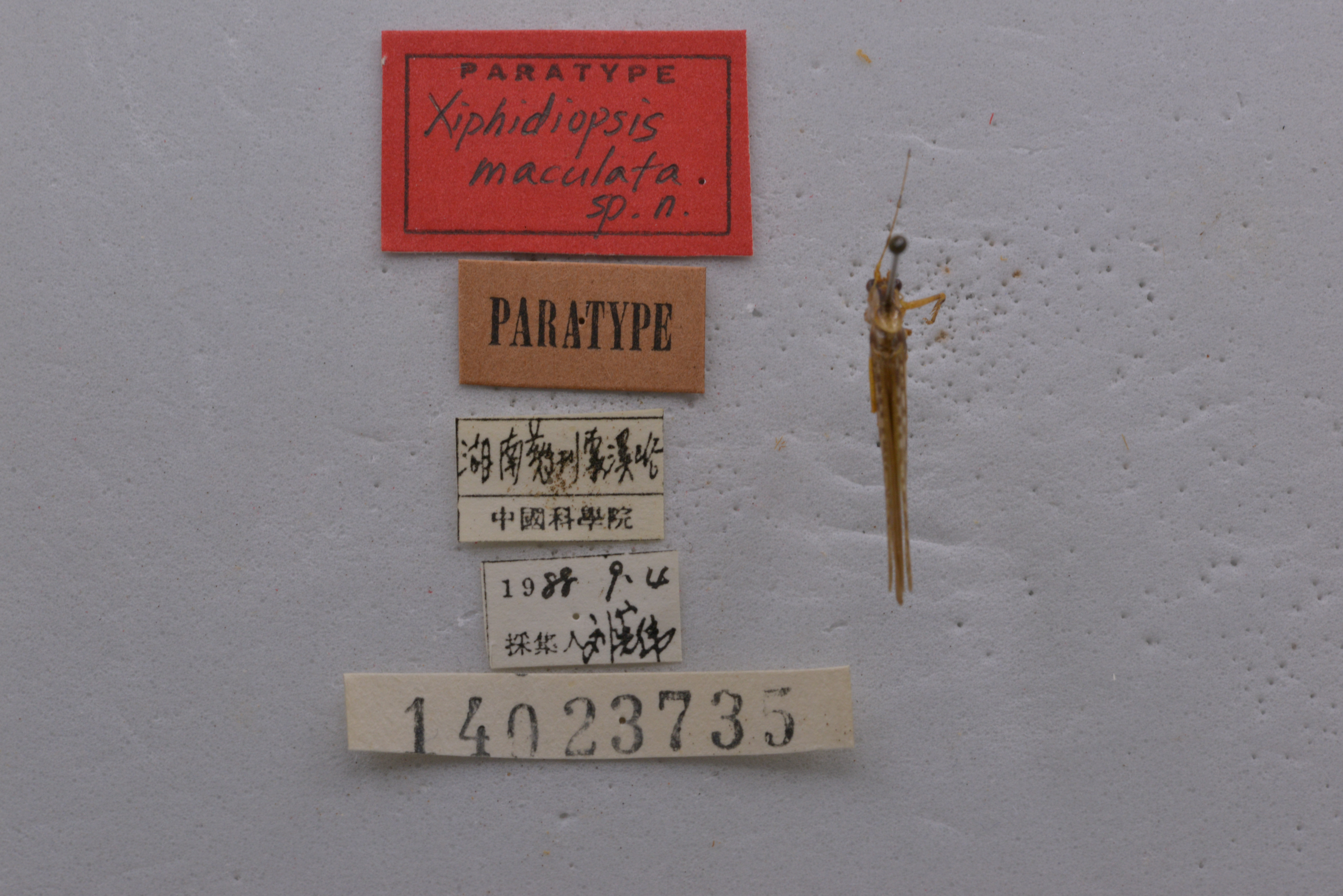 描述:雄性体小形。头顶圆锥形,顶端圆钝,背面具沟。复眼圆形,突出。下颚须第5节与第4节约等长,端部扩大。前胸背板沟后区稍扩张,前胸背板侧片后缘肩凹不明显。前足基节具刺各足股节度面无刺前足胫节腹面内、外剿排列形式为4,5(1,1)型后足胫节背面内线和外缘各具34-37小刺。前翅发达,颇远地超过后足股节端部后翅长于前