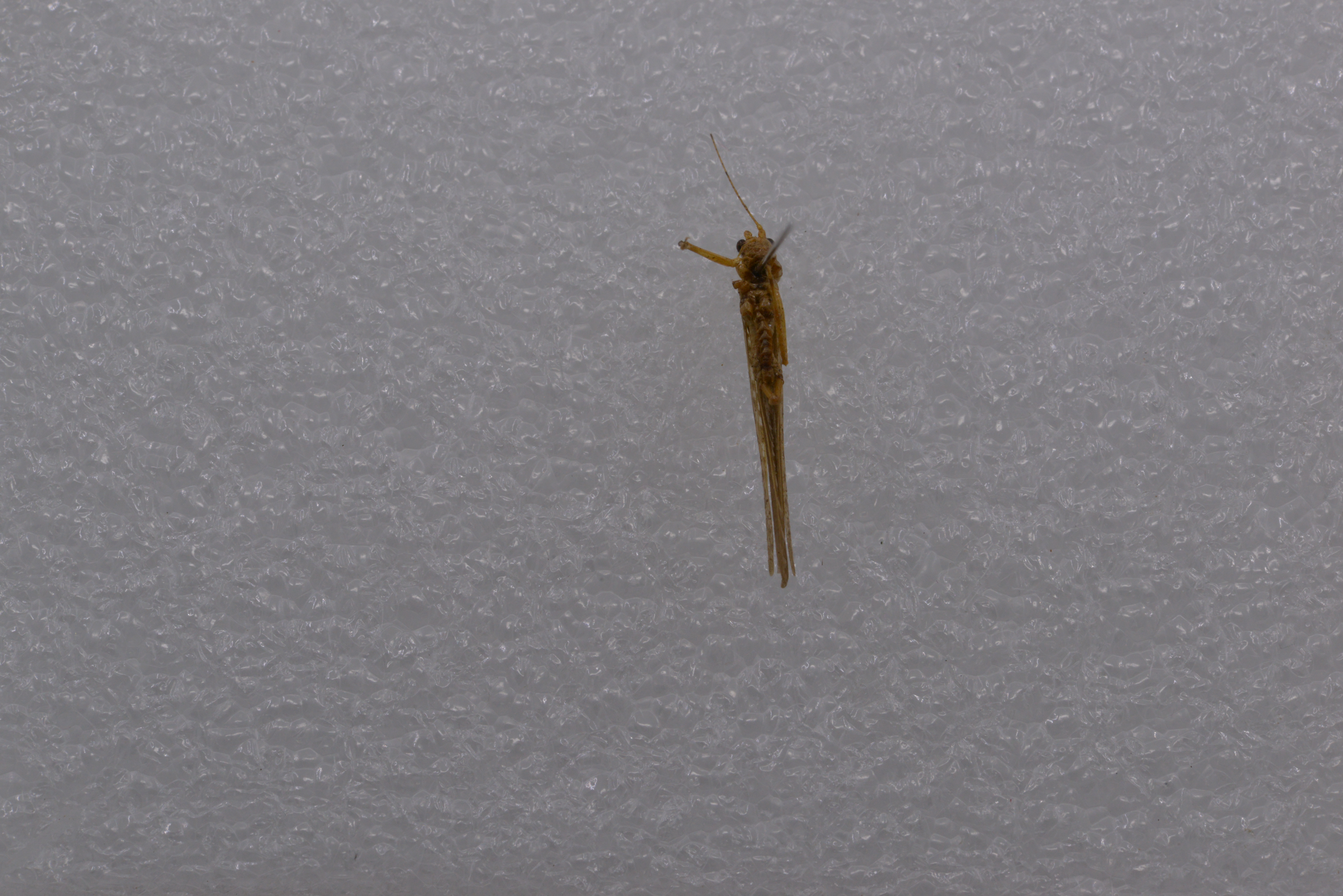 体黄褐色。头部背面深褐色,具4条较模糊的暗黑色纵纹,近头顶基部处聚合,延伸至头顶端部。前胸背板背面暗褐色,具睹黑色的侧条纹。后胸侧壁暗黑色。前翅具较多的烟褐色斑点。前足胫节听器区黑色,后足股节膝叶端部具黑色狭边,后足胫节背缘刺淡褐色。