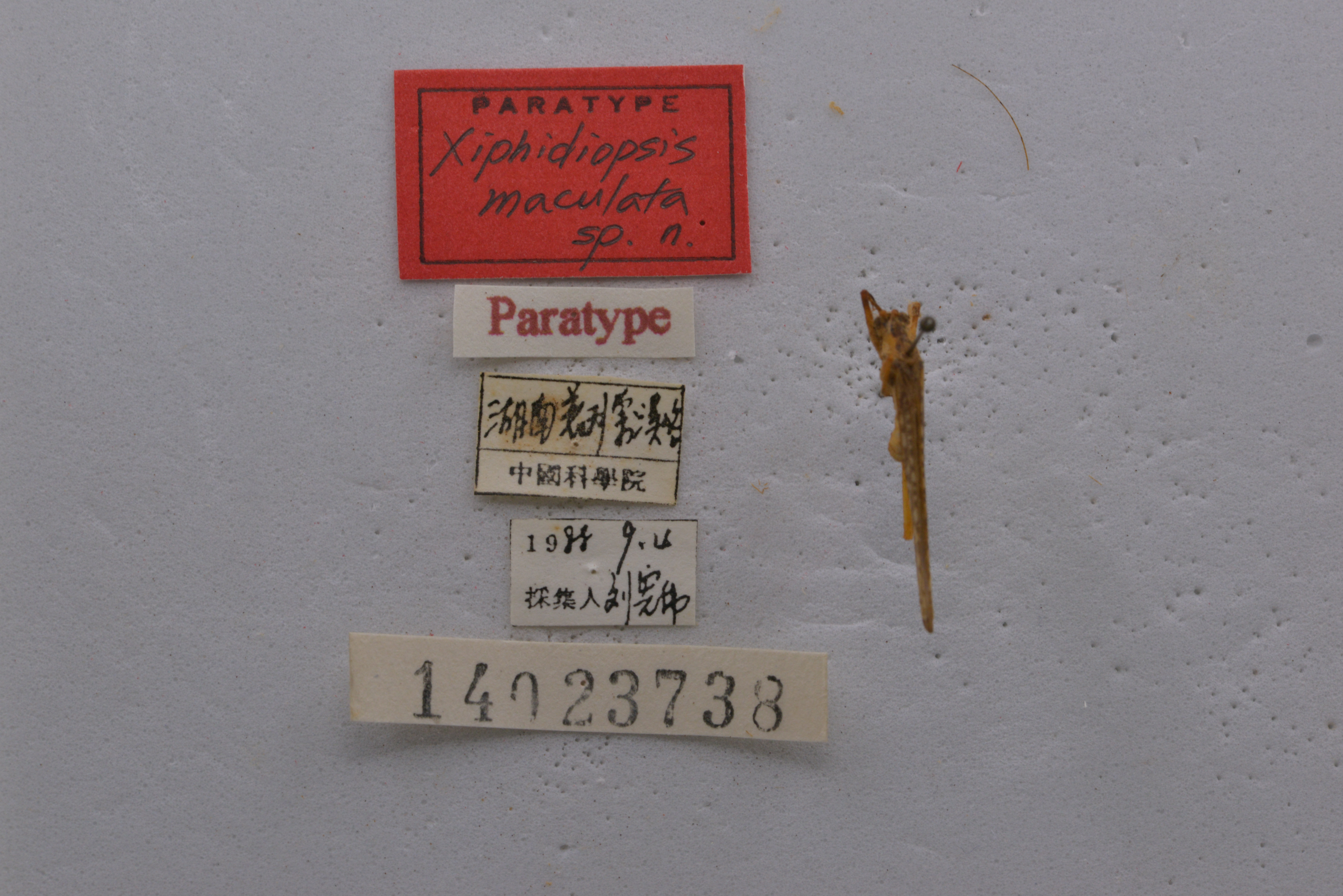 描述:雄性体小形。头顶圆锥形,顶端圆钝,背面具沟。复眼圆形,突出。下颚须第5节与第4节约等长,端部扩大。前胸背板沟后区稍扩张,前胸背板侧片后缘肩凹不明显。前足基节具刺各足股节度面无刺前足胫节腹面内、外剿排列形式为4,5(1,1)型后足胫节背面内线和外缘各具34-37小刺。前翅发达,颇远地超过后足股节端部后翅长于前