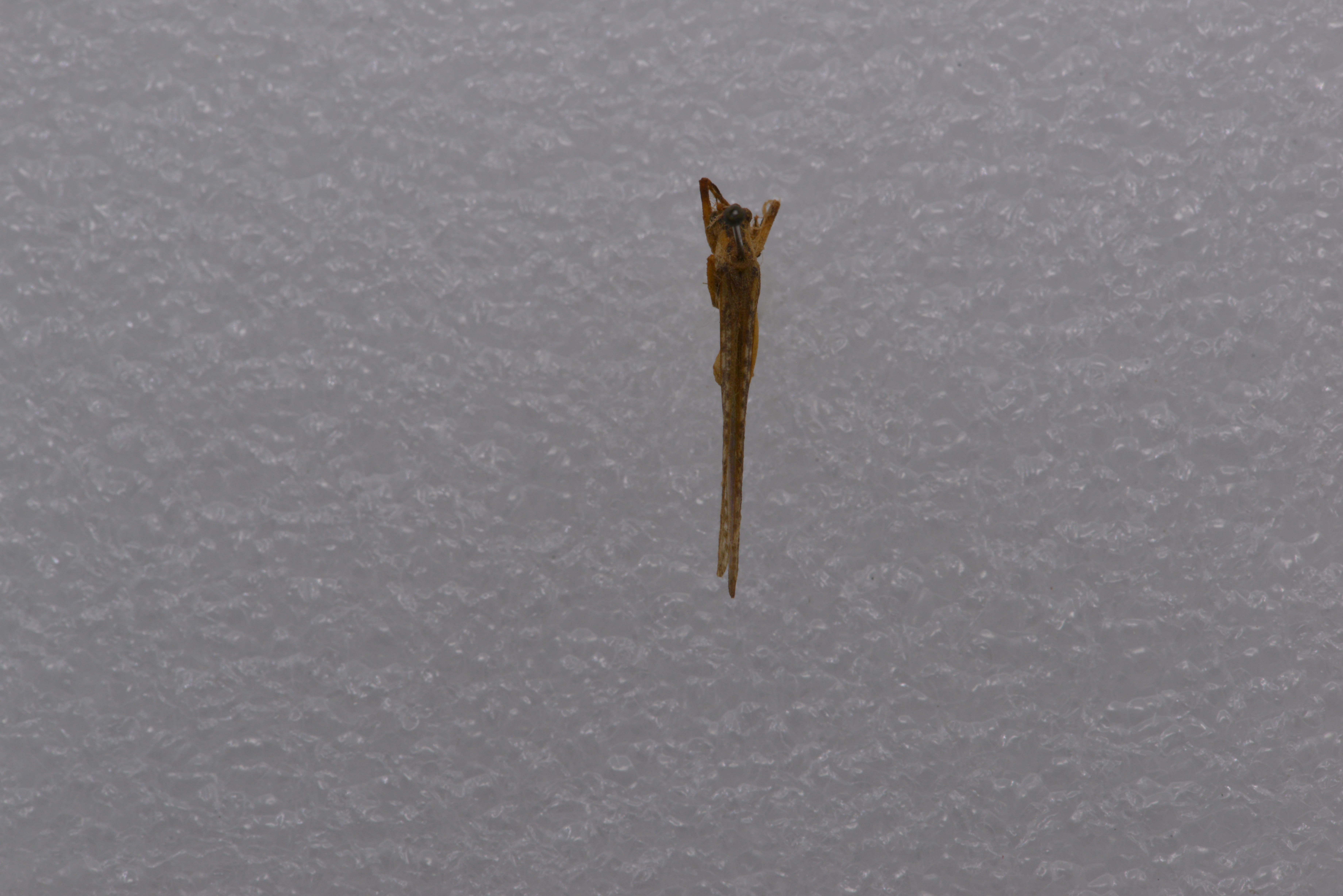 体黄褐色。头部背面深褐色,具4条较模糊的暗黑色纵纹,近头顶基部处聚合,延伸至头顶端部。前胸背板背面暗褐色,具睹黑色的侧条纹。后胸侧壁暗黑色。前翅具较多的烟褐色斑点。前足胫节听器区黑色,后足股节膝叶端部具黑色狭边,后足胫节背缘刺淡褐色。