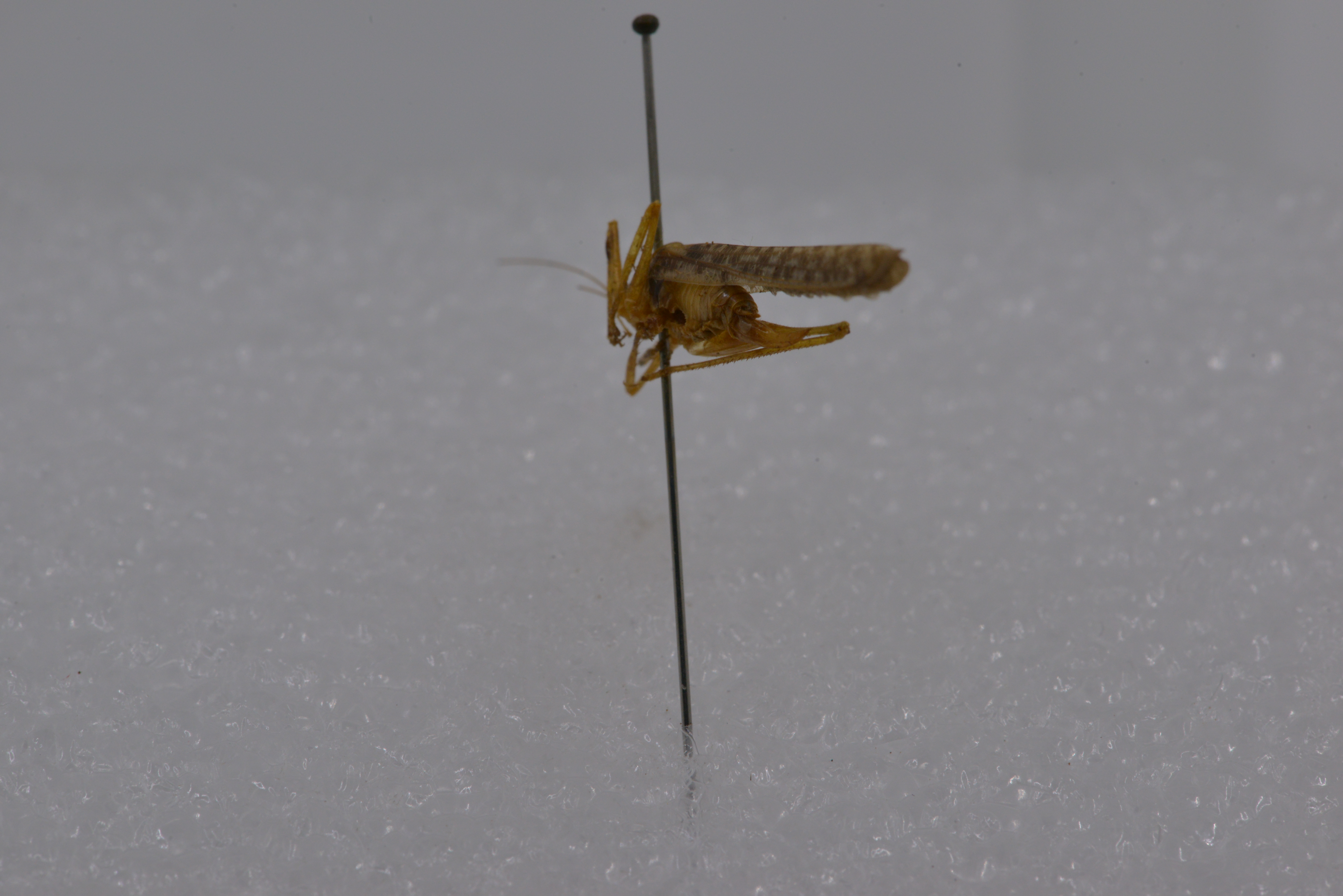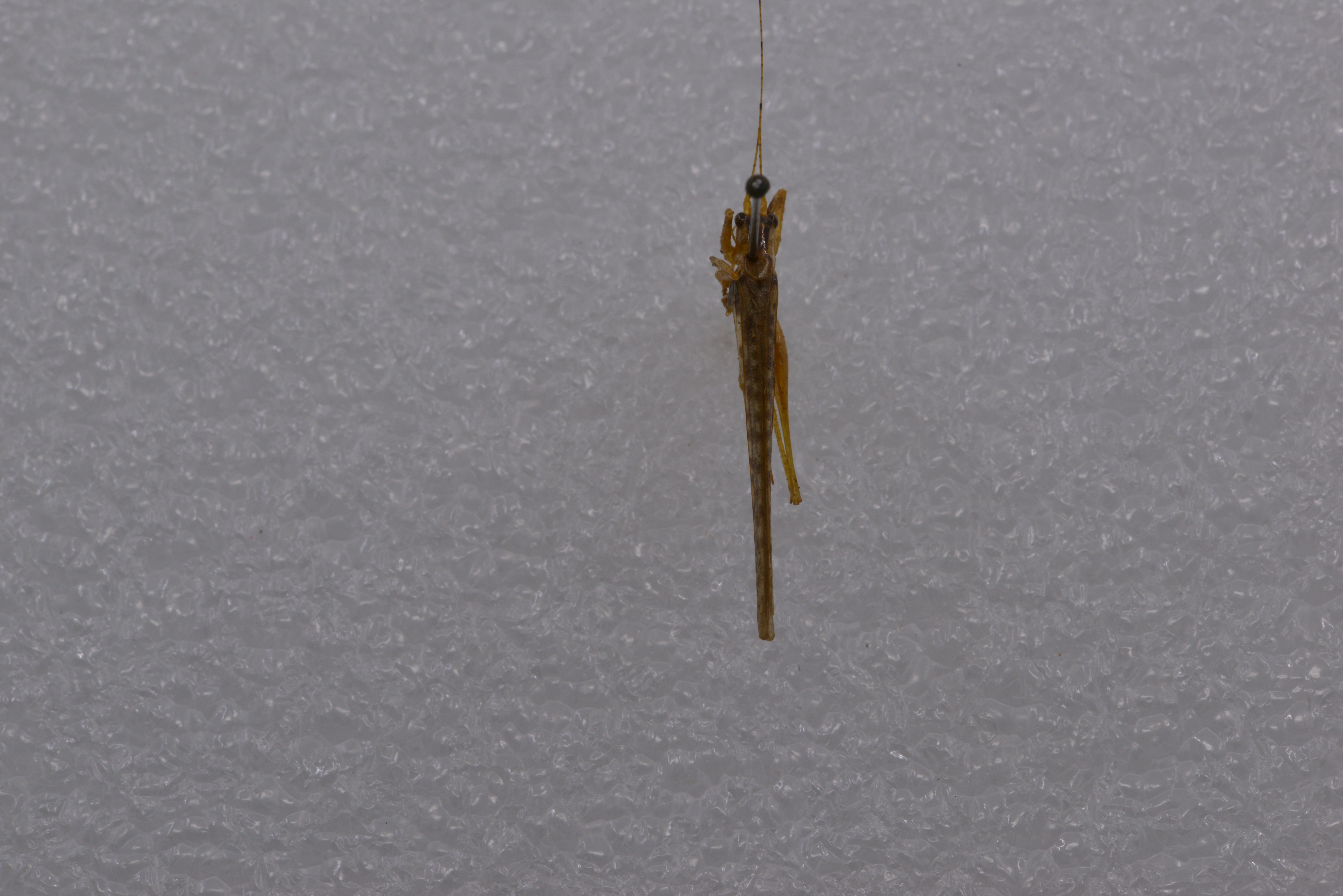 描述:雄性体小形。头顶圆锥形,顶端圆钝,背面具沟。复眼圆形,突出。下颚须第5节与第4节约等长,端部扩大。前胸背板沟后区稍扩张,前胸背板侧片后缘肩凹不明显。前足基节具刺各足股节度面无刺前足胫节腹面内、外剿排列形式为4,5(1,1)型后足胫节背面内线和外缘各具34-37小刺。前翅发达,颇远地超过后足股节端部后翅长于前