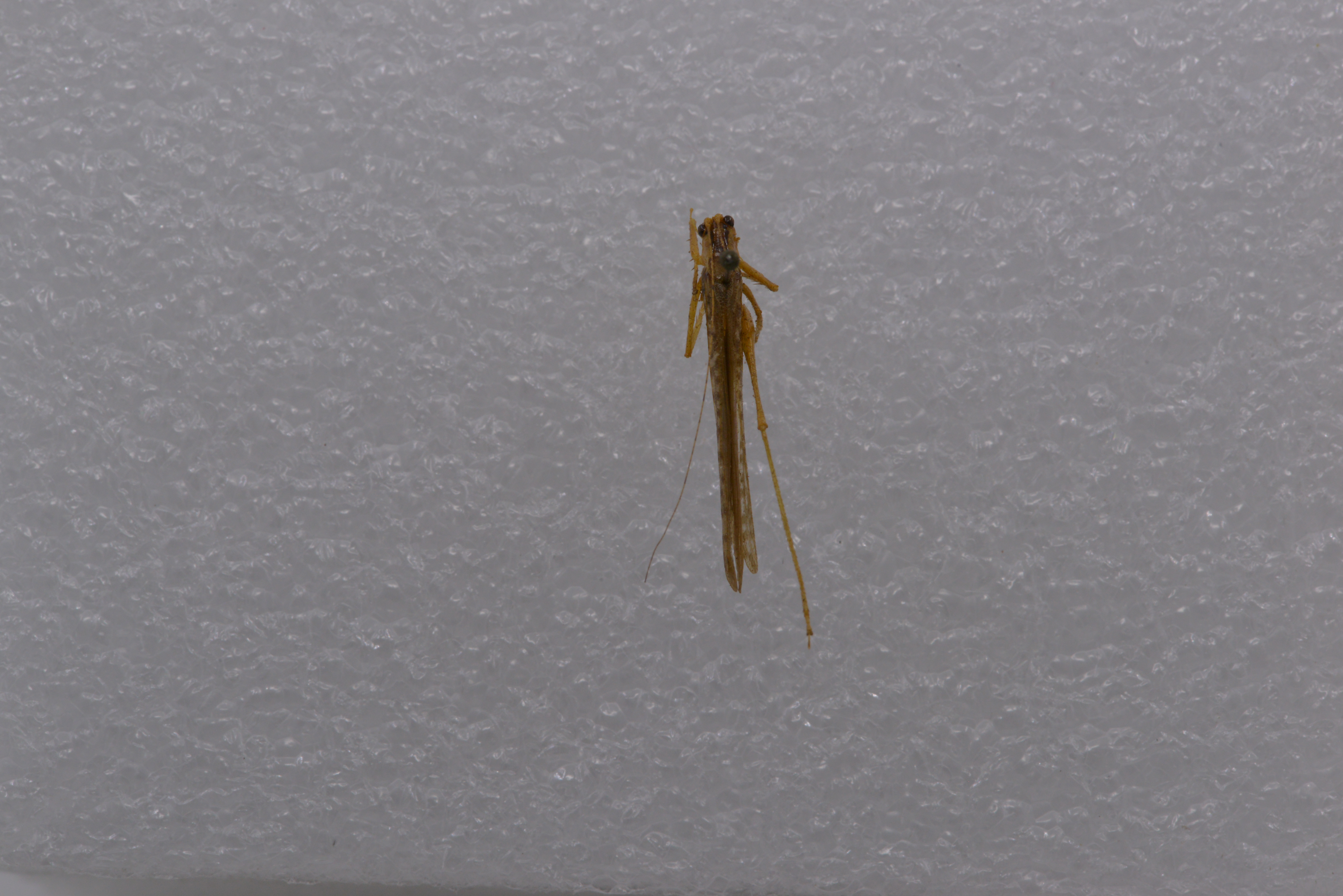 体黄褐色。头部背面深褐色,具4条较模糊的暗黑色纵纹,近头顶基部处聚合,延伸至头顶端部。前胸背板背面暗褐色,具睹黑色的侧条纹。后胸侧壁暗黑色。前翅具较多的烟褐色斑点。前足胫节听器区黑色,后足股节膝叶端部具黑色狭边,后足胫节背缘刺淡褐色。
