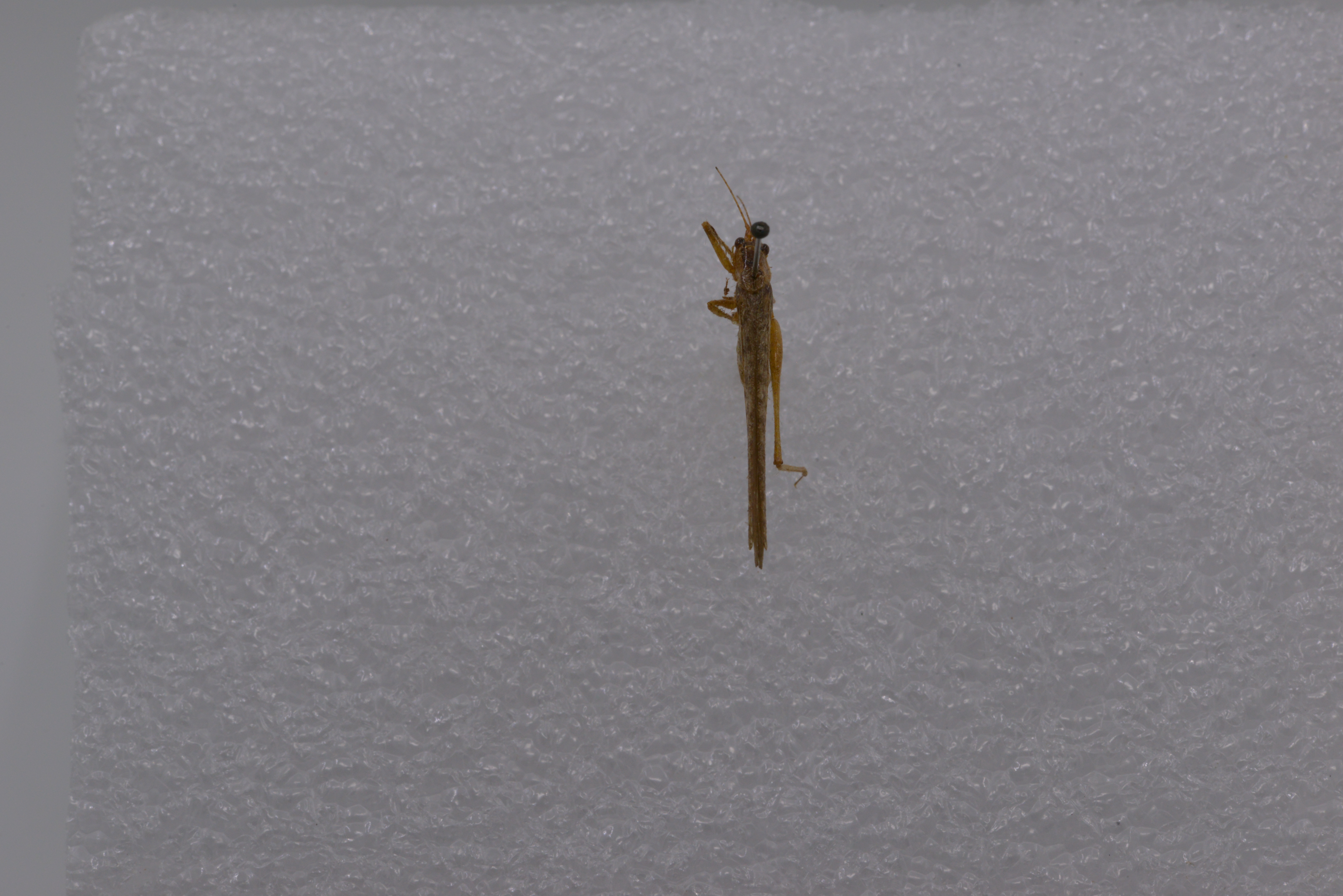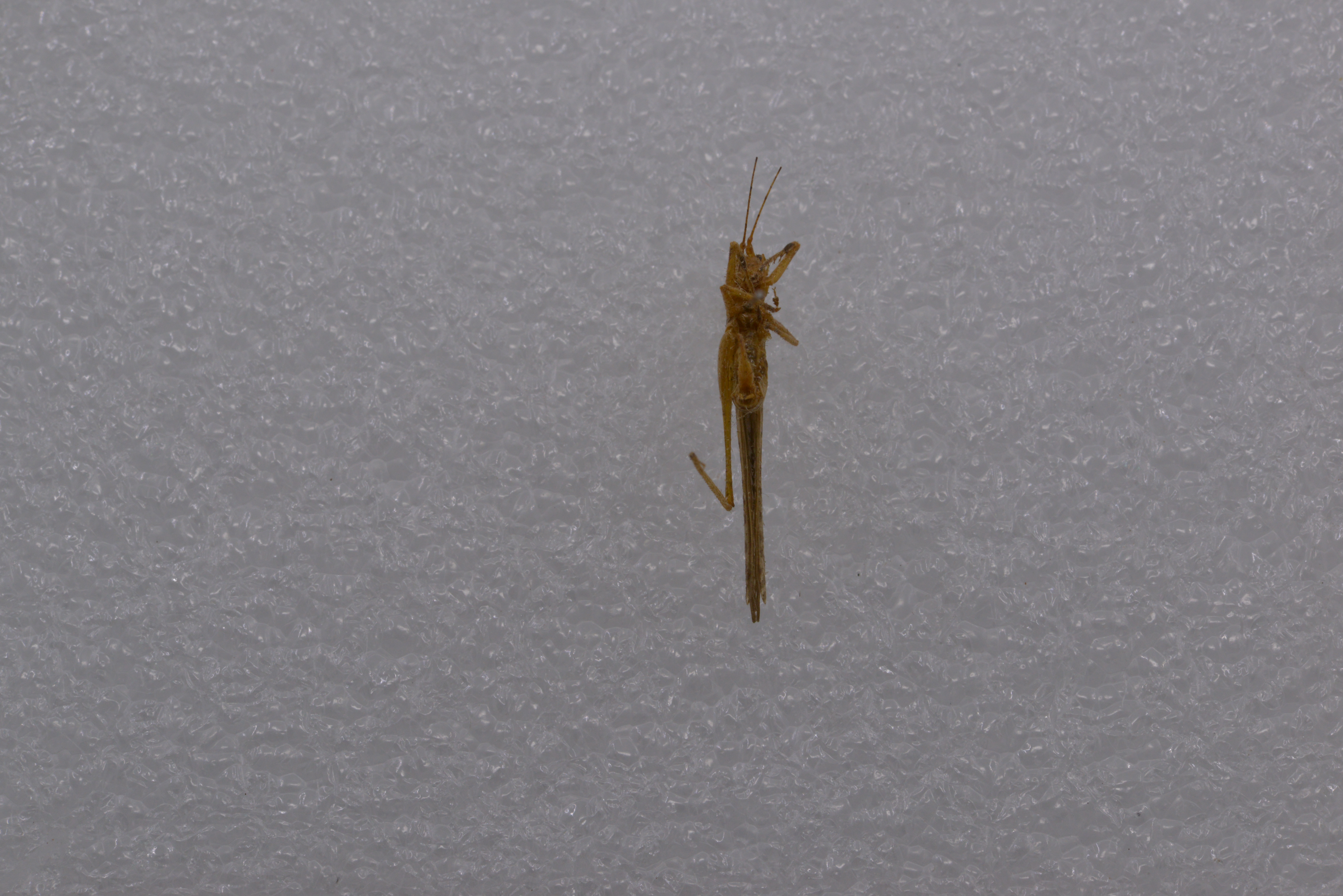 描述:雄性体小形。头顶圆锥形,顶端圆钝,背面具沟。复眼圆形,突出。下颚须第5节与第4节约等长,端部扩大。前胸背板沟后区稍扩张,前胸背板侧片后缘肩凹不明显。前足基节具刺各足股节度面无刺前足胫节腹面内、外剿排列形式为4,5(1,1)型后足胫节背面内线和外缘各具34-37小刺。前翅发达,颇远地超过后足股节端部后翅长于前