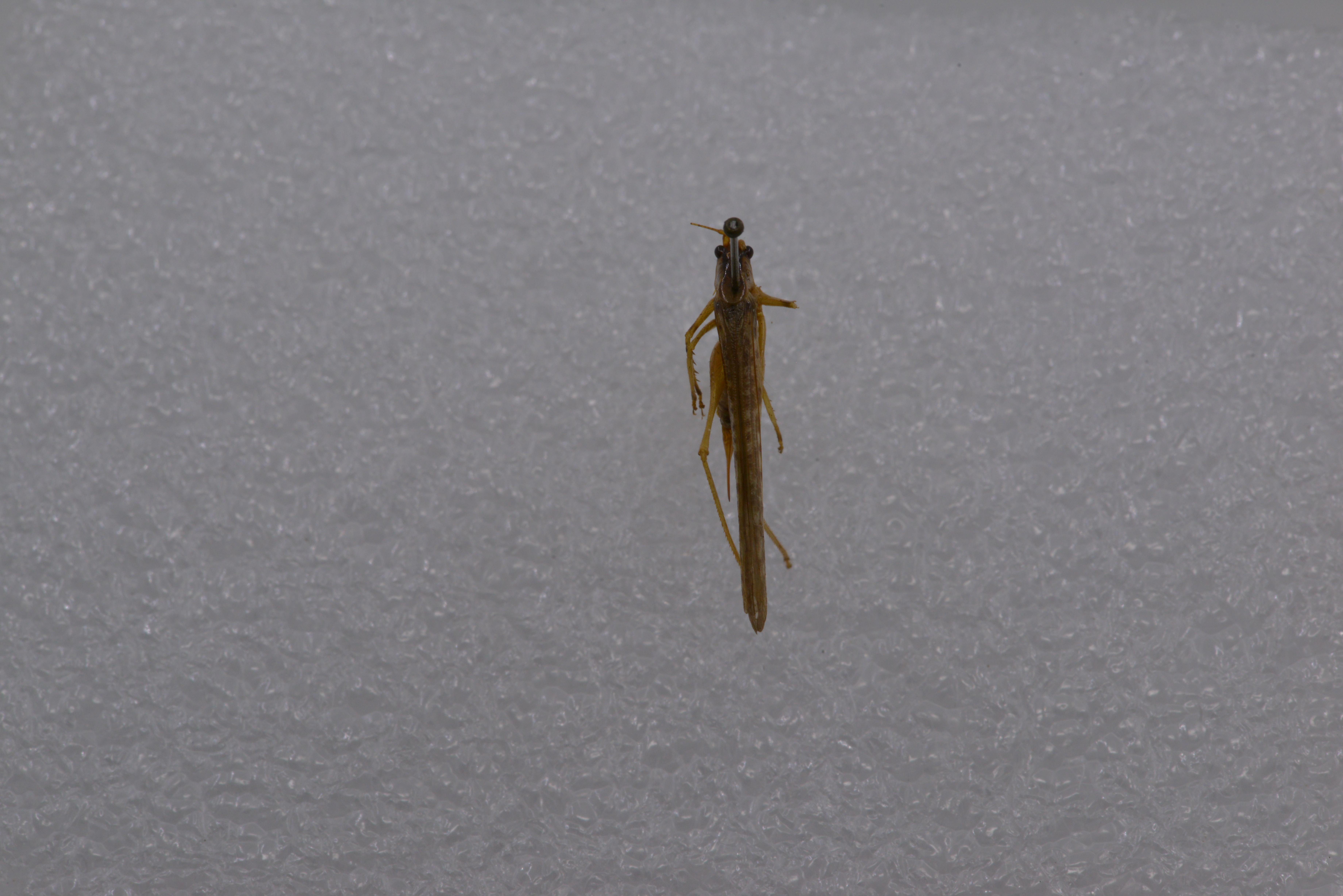 描述:雄性体小形。头顶圆锥形,顶端圆钝,背面具沟。复眼圆形,突出。下颚须第5节与第4节约等长,端部扩大。前胸背板沟后区稍扩张,前胸背板侧片后缘肩凹不明显。前足基节具刺各足股节度面无刺前足胫节腹面内、外剿排列形式为4,5(1,1)型后足胫节背面内线和外缘各具34-37小刺。前翅发达,颇远地超过后足股节端部后翅长于前