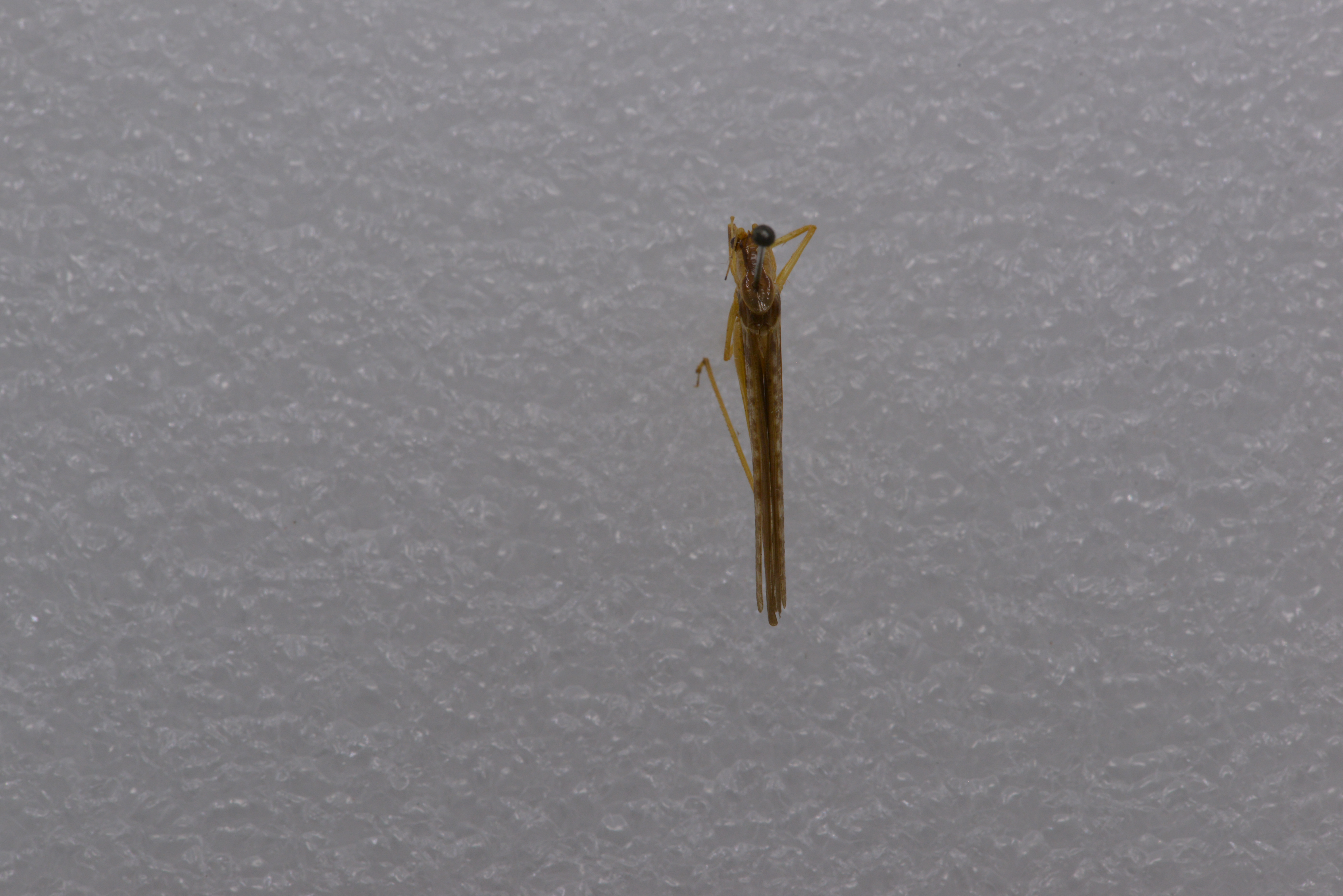 体黄褐色。头部背面深褐色,具4条较模糊的暗黑色纵纹,近头顶基部处聚合,延伸至头顶端部。前胸背板背面暗褐色,具睹黑色的侧条纹。后胸侧壁暗黑色。前翅具较多的烟褐色斑点。前足胫节听器区黑色,后足股节膝叶端部具黑色狭边,后足胫节背缘刺淡褐色。