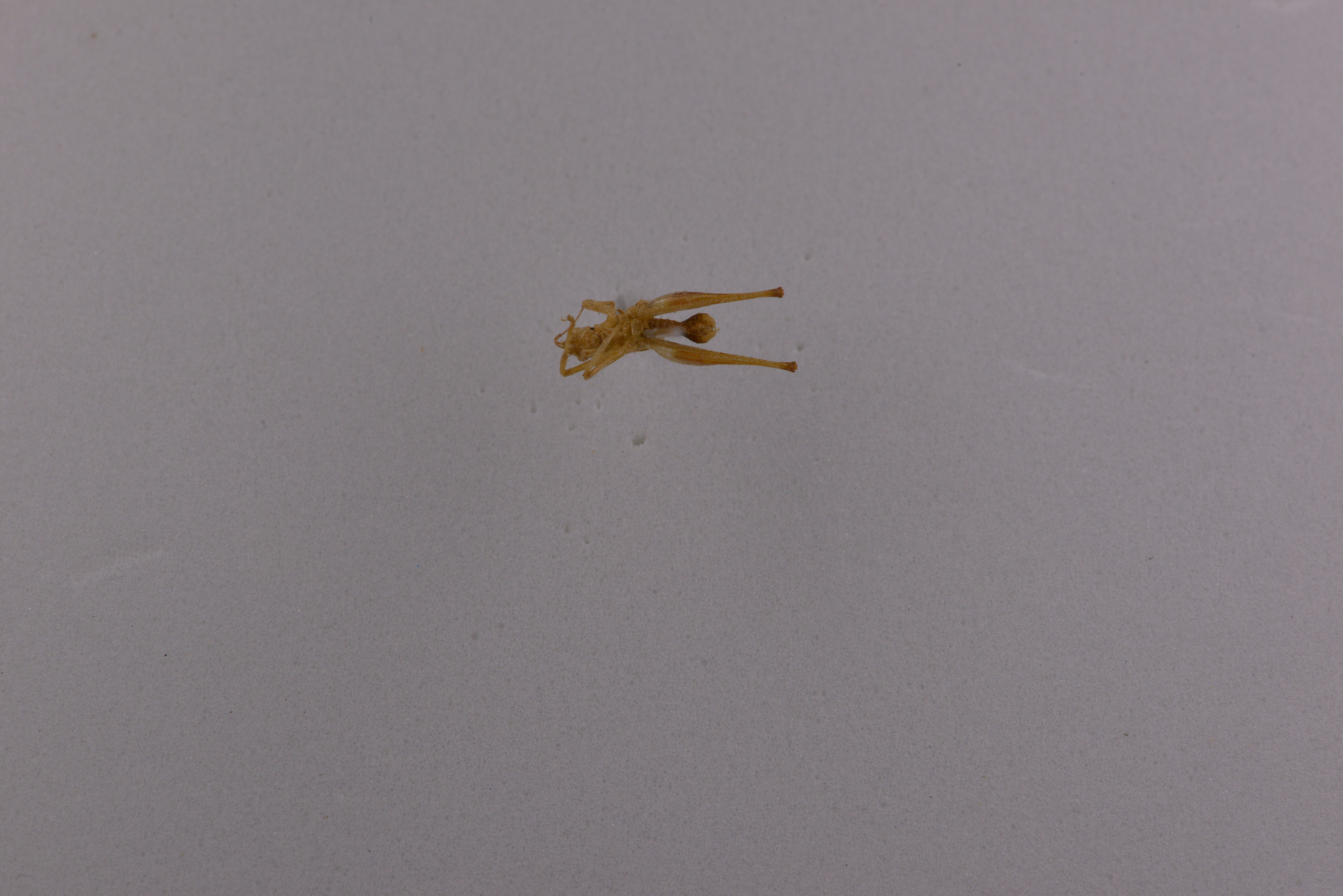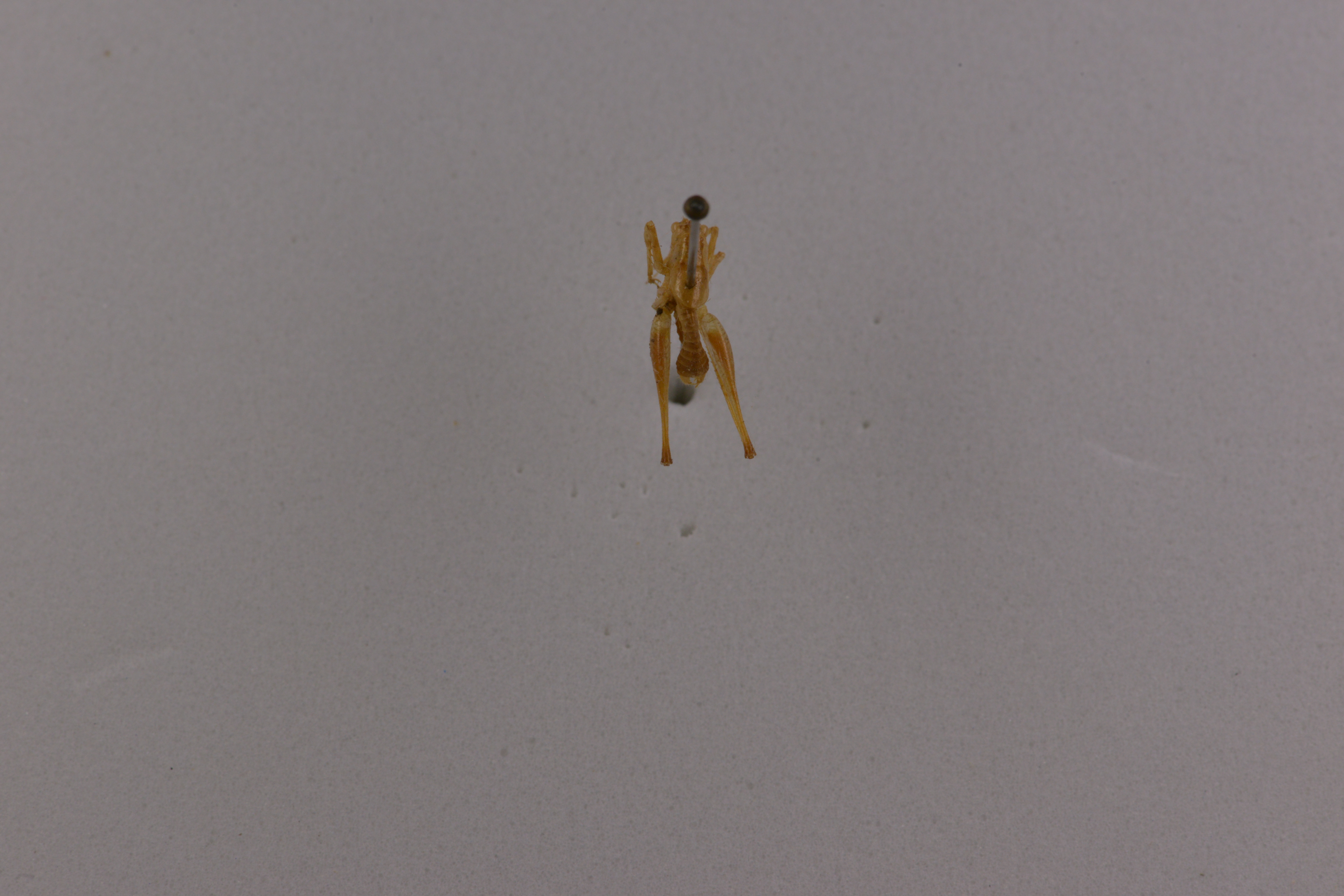 描述:雄性体小,具光泽和稍透明。头顶圆锥形,端部较钝圆,背面具沟。复眼圆形,突出。下颚须细长,第5节稍长于第4节,端部稍扩大。前胸背板强向后延长,侧片较低,后缘倾斜,无肩凹。前足基节具刺,各足股节腹面无刺。前足陉节腹面内、外刺排列形式为4,4(l,l)型。前足胫节内、外两侧听器均为开放型,后足胫节背面内缘及外缘各具24-