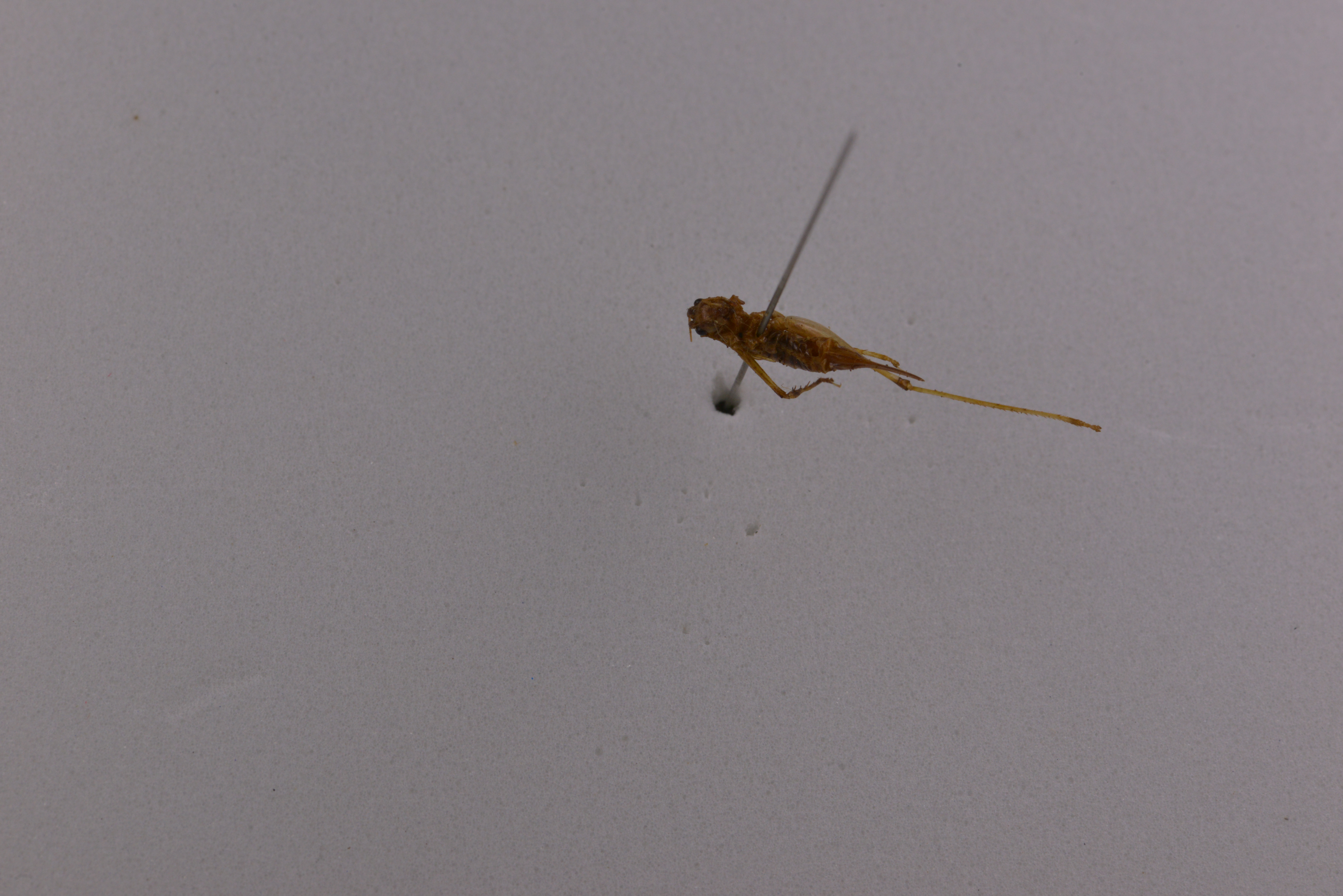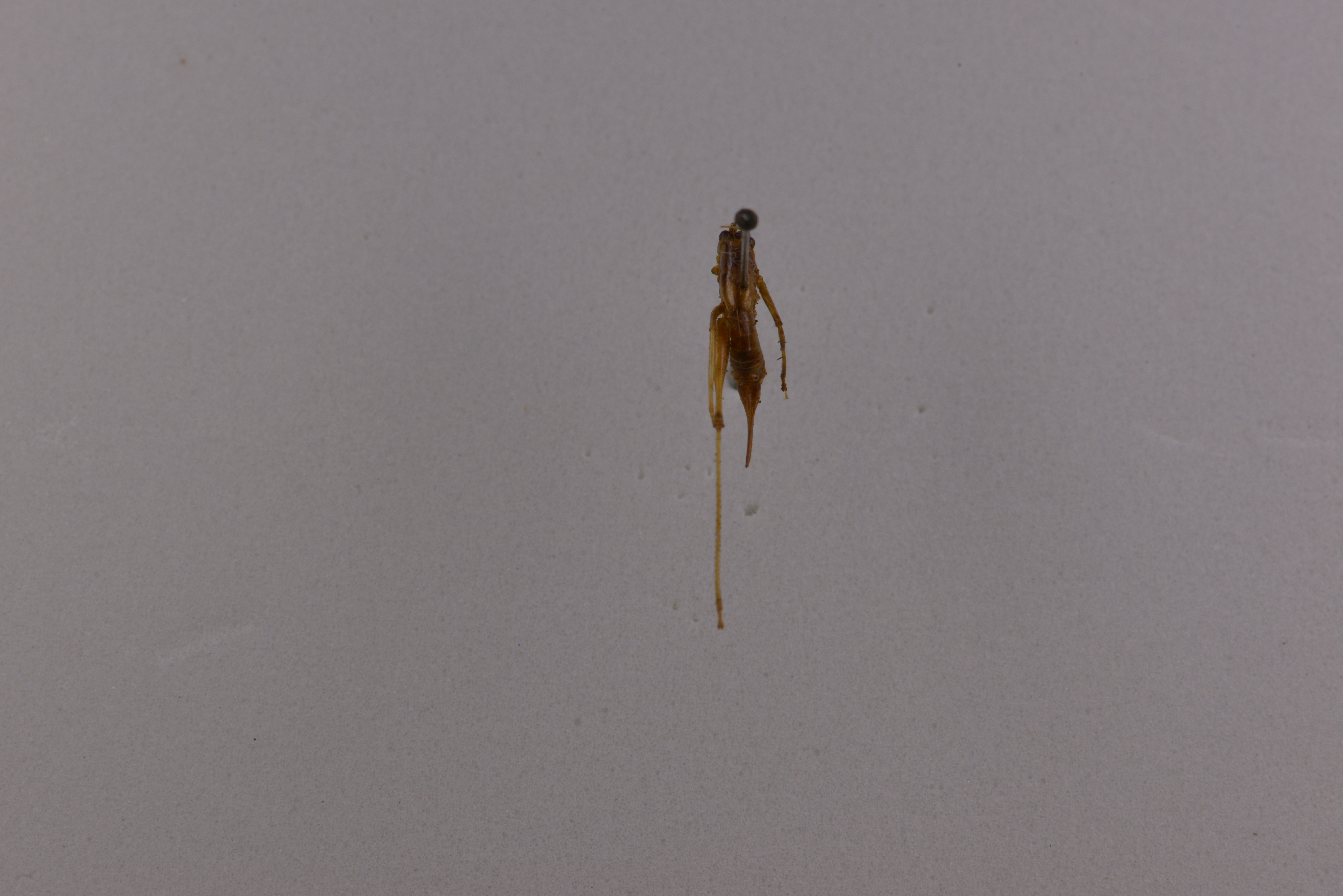 描述:雄性体小,具光泽和稍透明。头顶圆锥形,端部较钝圆,背面具沟。复眼圆形,突出。下颚须细长,第5节稍长于第4节,端部稍扩大。前胸背板强向后延长,侧片较低,后缘倾斜,无肩凹。前足基节具刺,各足股节腹面无刺。前足陉节腹面内、外刺排列形式为4,4(l,l)型。前足胫节内、外两侧听器均为开放型,后足胫节背面内缘及外缘各具24-