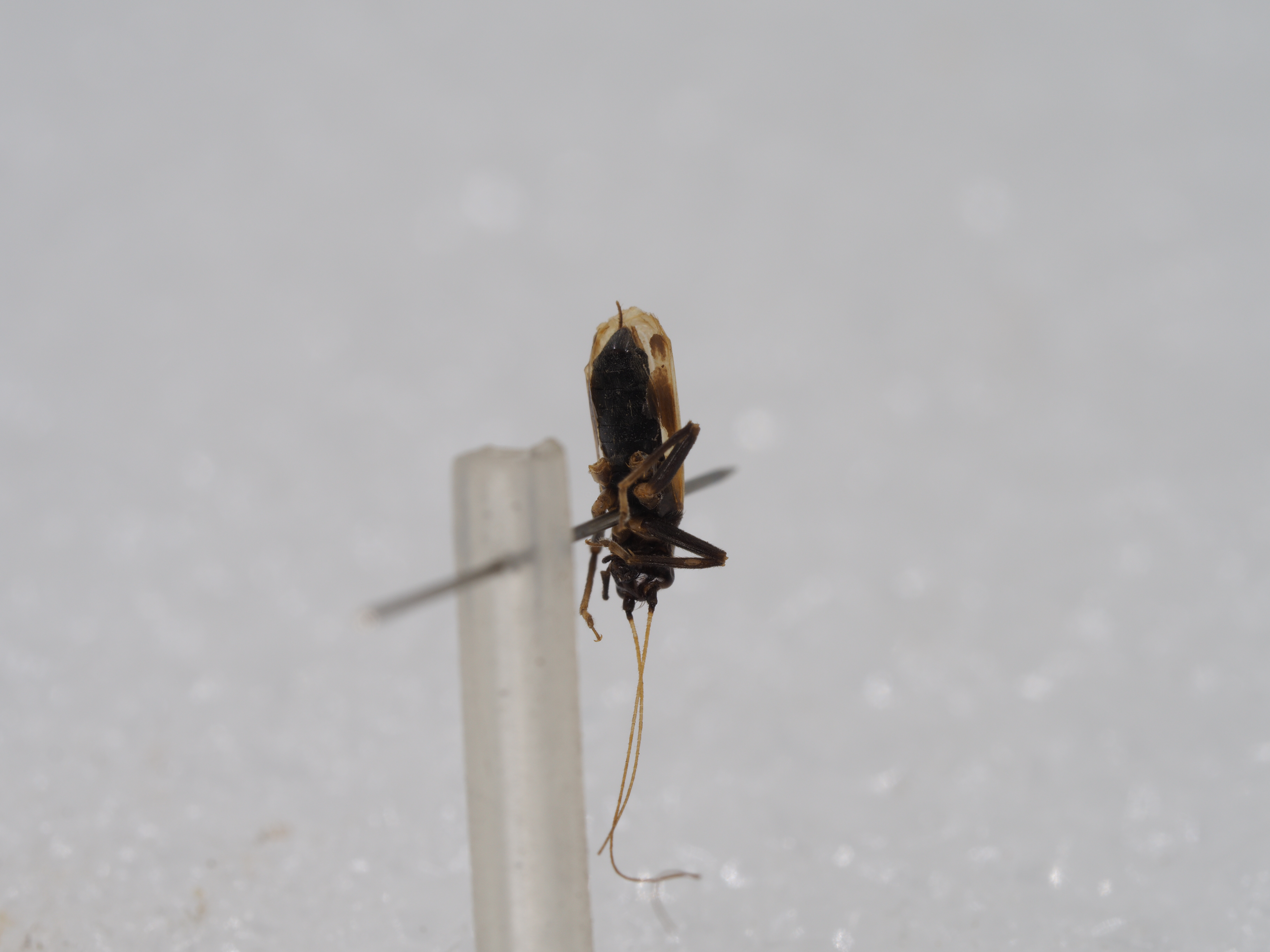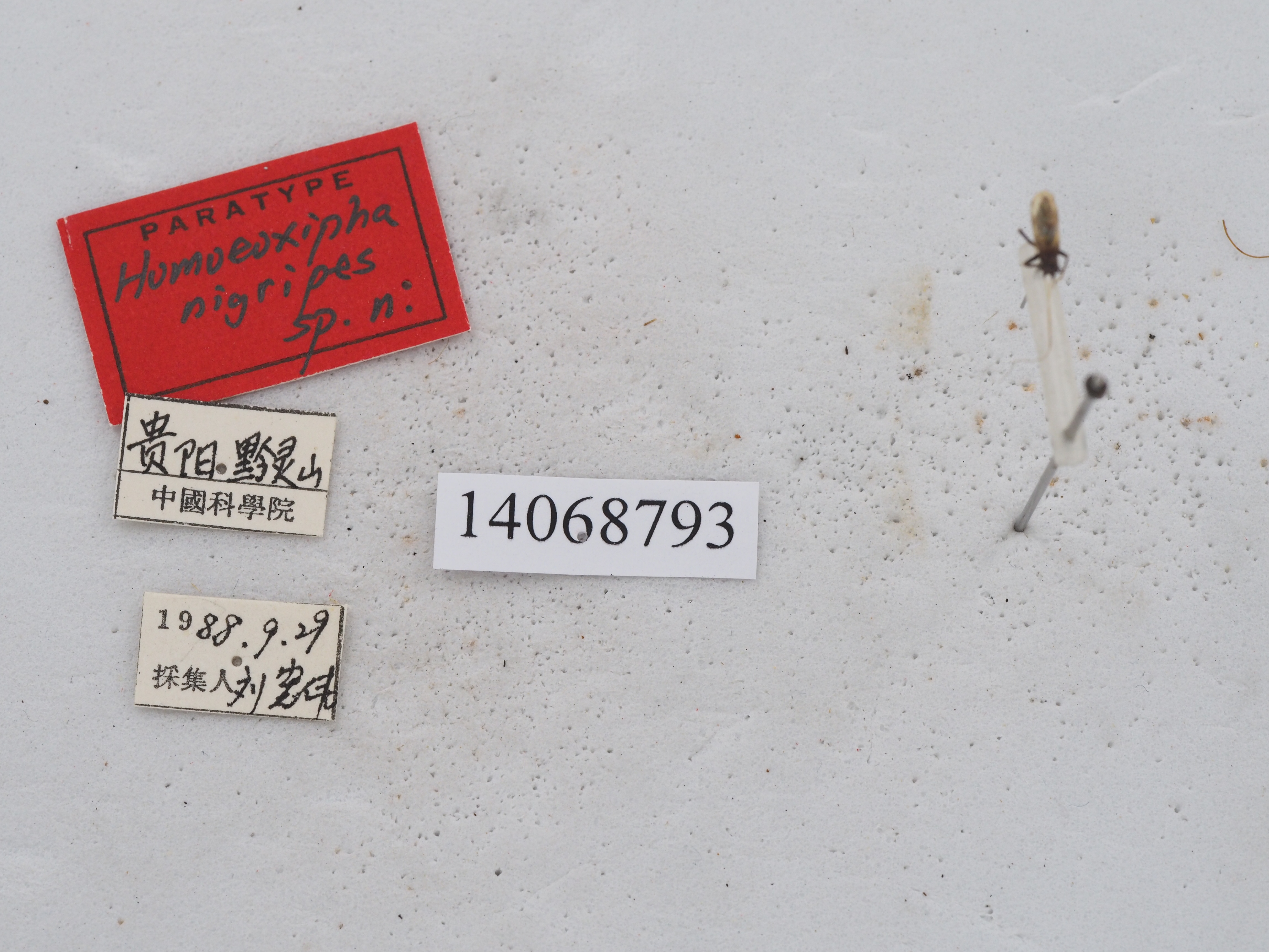 雌性体型大小与雄性相似。前翅较狭窄,背面具5条纵脉,纵脉之间是闰脉侧面部的脉序与雄性相似。产卵路与后足股节约等长,稍向上弯,端瓣较长,约为其全长的112,背缘秘缘具细齿。体黑色。头部暗褐色,触角淡黄色,基部两节黑色下颚须暗褐色。前胸背板暗褐色至暗黑色。前足和中足暗褐色,附节淡黄色。后足股节基部2/5为淡黄色,端部315为晴黑色后足胫节淡黄色,端部稍暗色。前翅烟色,缺较明显的暗色斑纹。