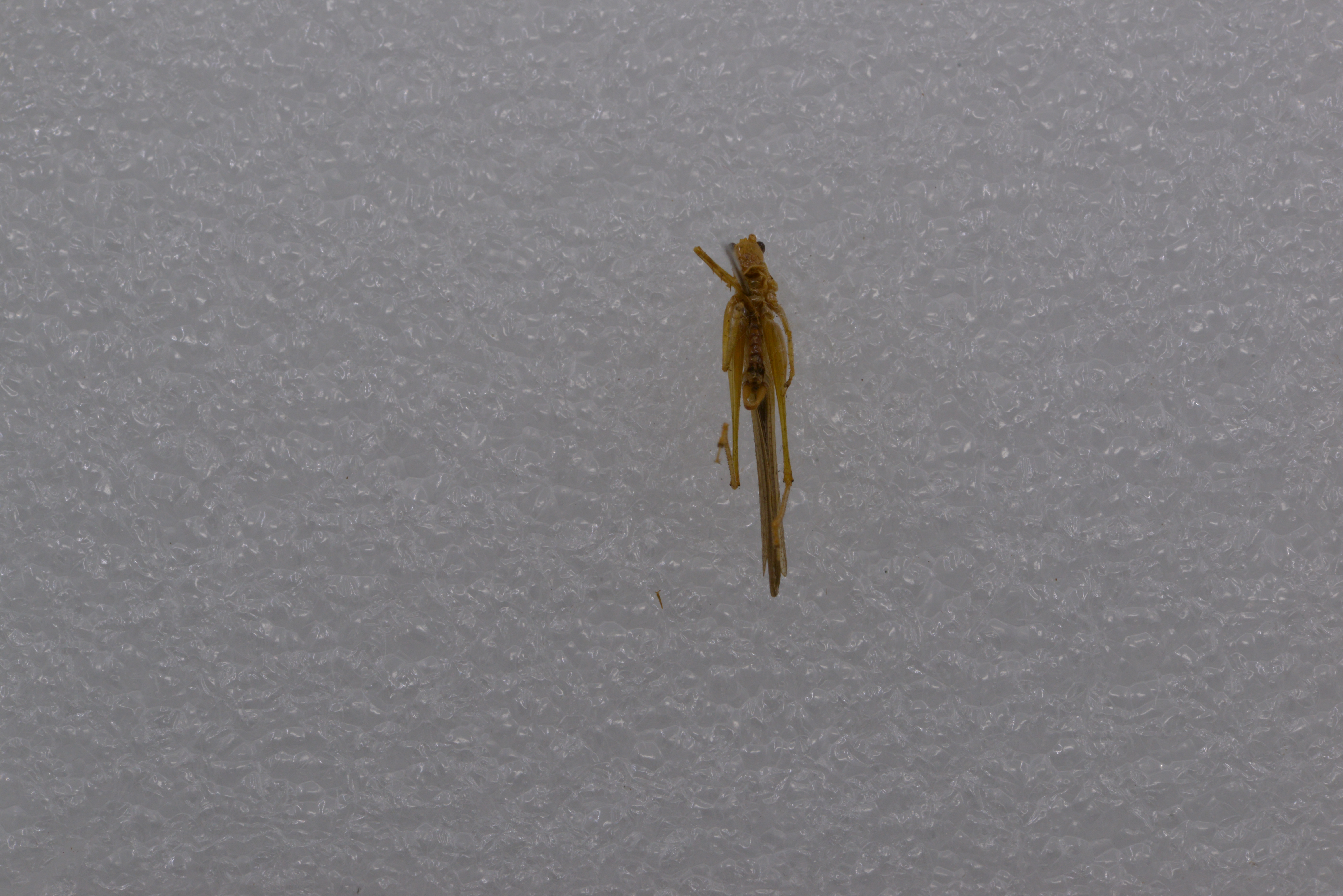 描述:雄性头部稍宽于前胸背板。头顶向前呈圆锥形突出}顶端较钝,背面具沟。复眼圆形,突出。下颚须第5节与第4节约等长,端部扩大。前胸背板侧片后缘强倾斜,肩凹不明显。前足基节具刺,各足股节腹面无刺。前足胫节腹面内、外刺排列形式为4,5(l,1)型,后足胫节背面内缘和外缘各具30-33个小刺。前翅基长,颇远地超过后足股节端部后翅稍长于前翅。第10腹节背板不变形,后缘稍内凹。尾须较细长,基半部圆柱形,端半部侧扁,内侧强凹陷侧观尾须中部稍狭缩。下生殖板基短,后缘平截,腹刺位于亚端两侧。