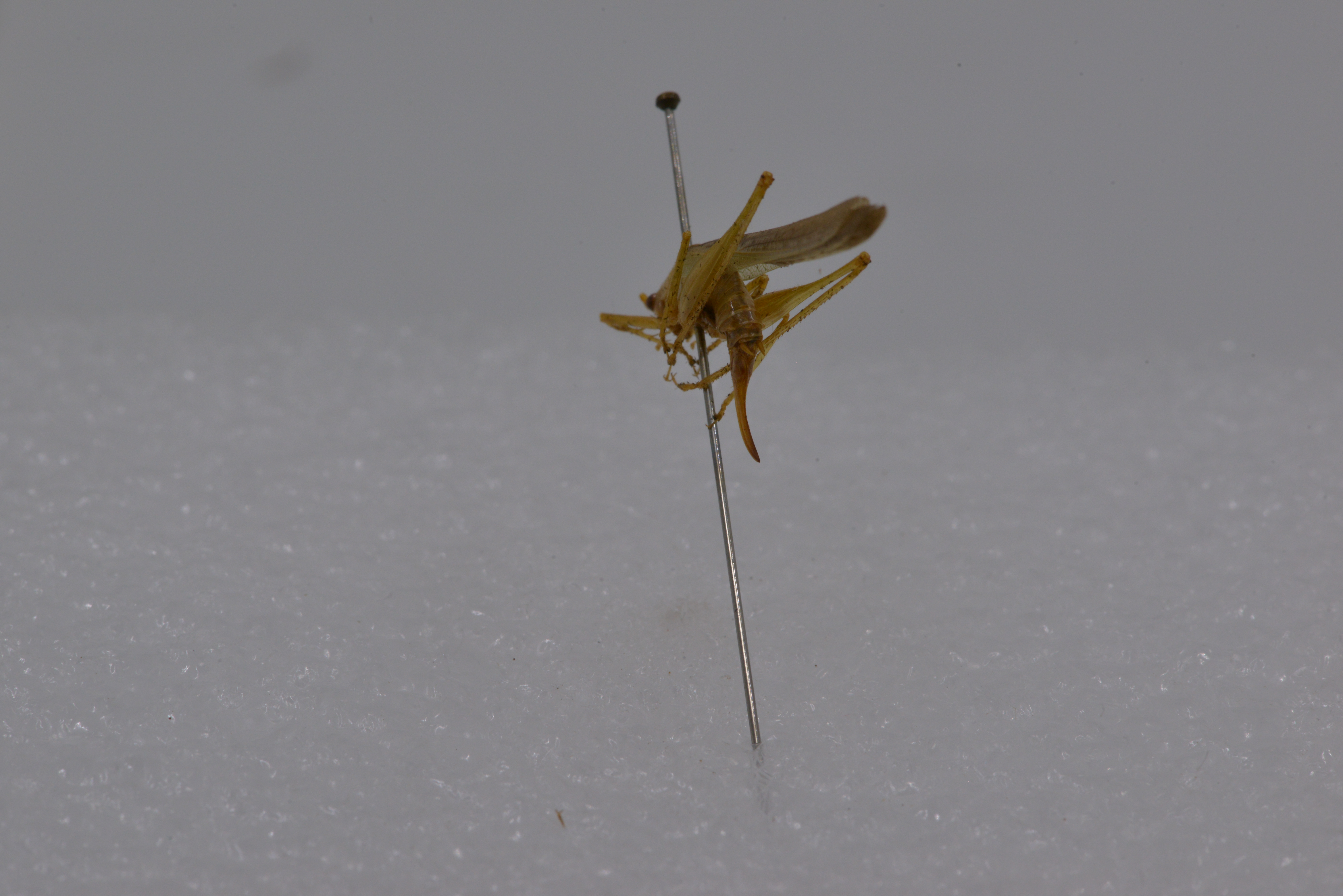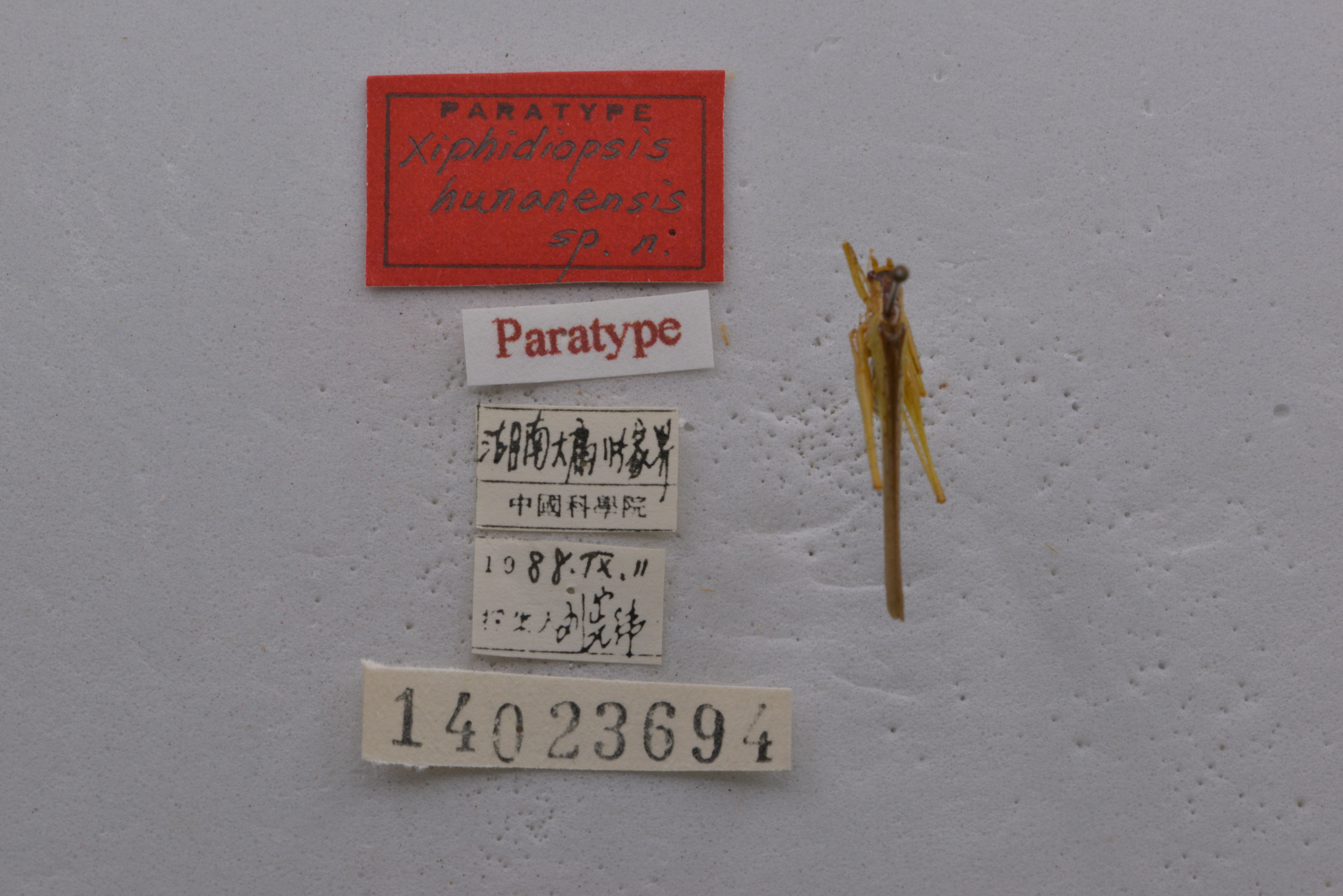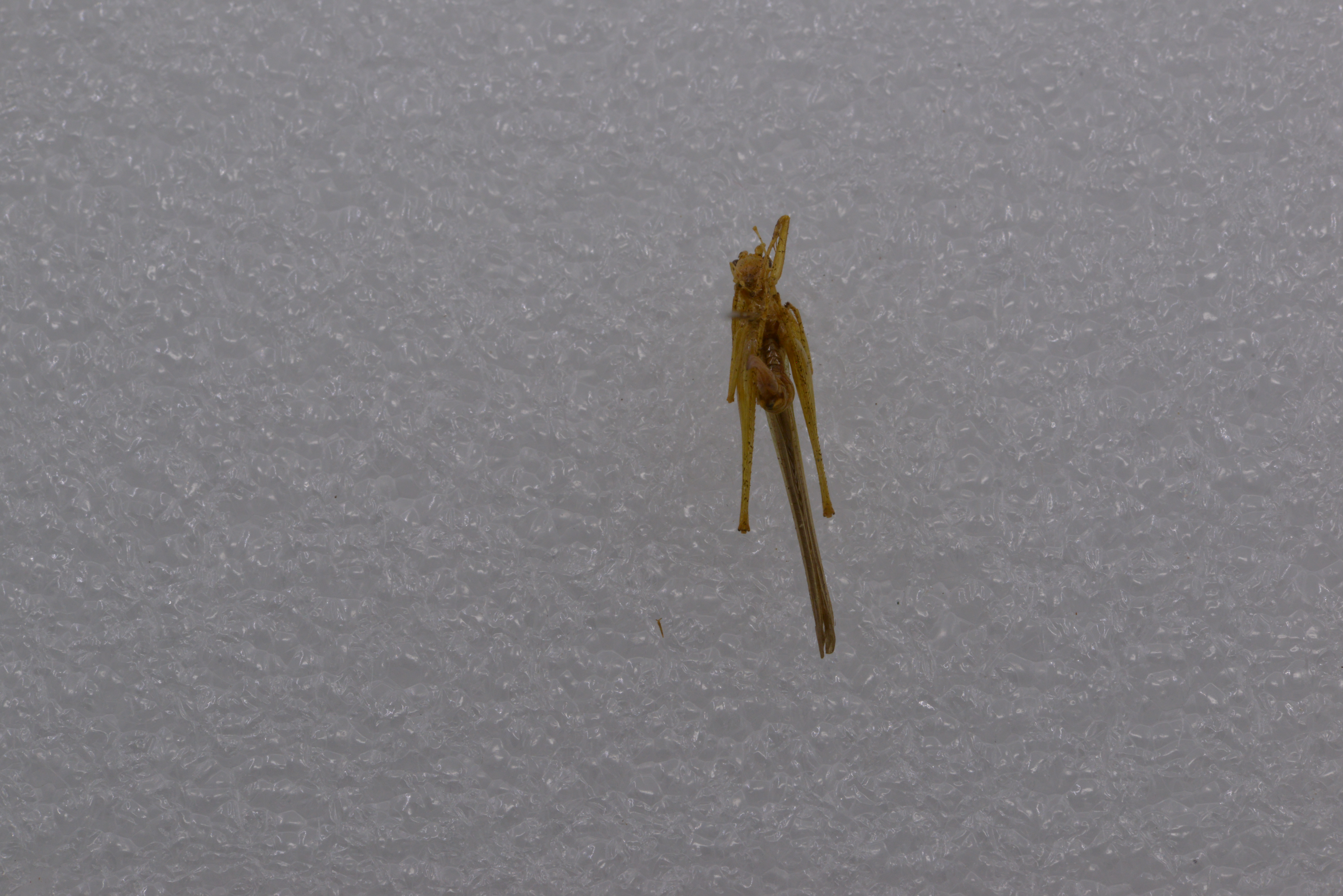 描述:雄性头部稍宽于前胸背板。头顶向前呈圆锥形突出}顶端较钝,背面具沟。复眼圆形,突出。下颚须第5节与第4节约等长,端部扩大。前胸背板侧片后缘强倾斜,肩凹不明显。前足基节具刺,各足股节腹面无刺。前足胫节腹面内、外刺排列形式为4,5(l,1)型,后足胫节背面内缘和外缘各具30-33个小刺。前翅基长,颇远地超过后足股节端部后翅稍长于前翅。第10腹节背板不变形,后缘稍内凹。尾须较细长,基半部圆柱形,端半部侧扁,内侧强凹陷侧观尾须中部稍狭缩。下生殖板基短,后缘平截,腹刺位于亚端两侧。