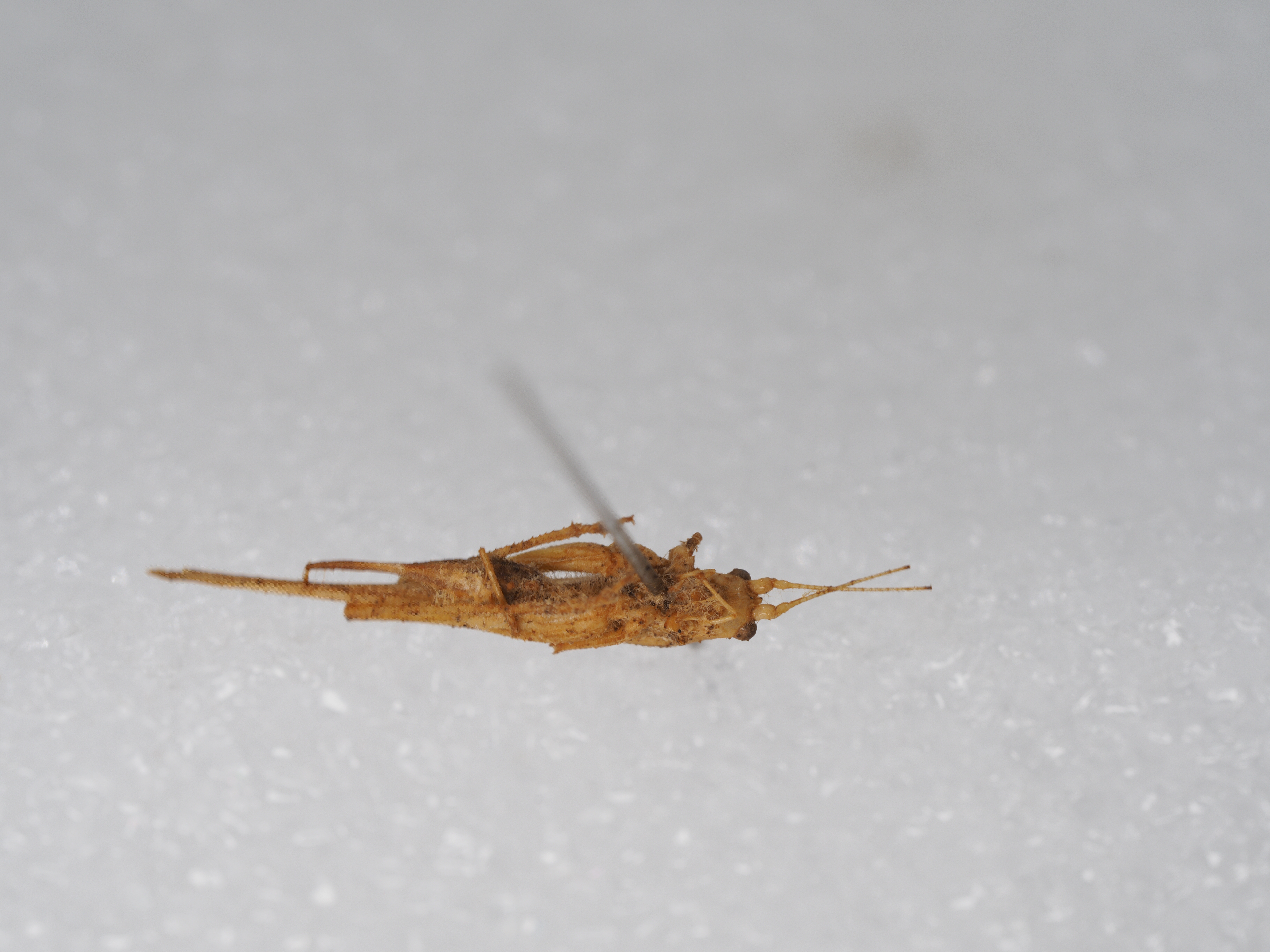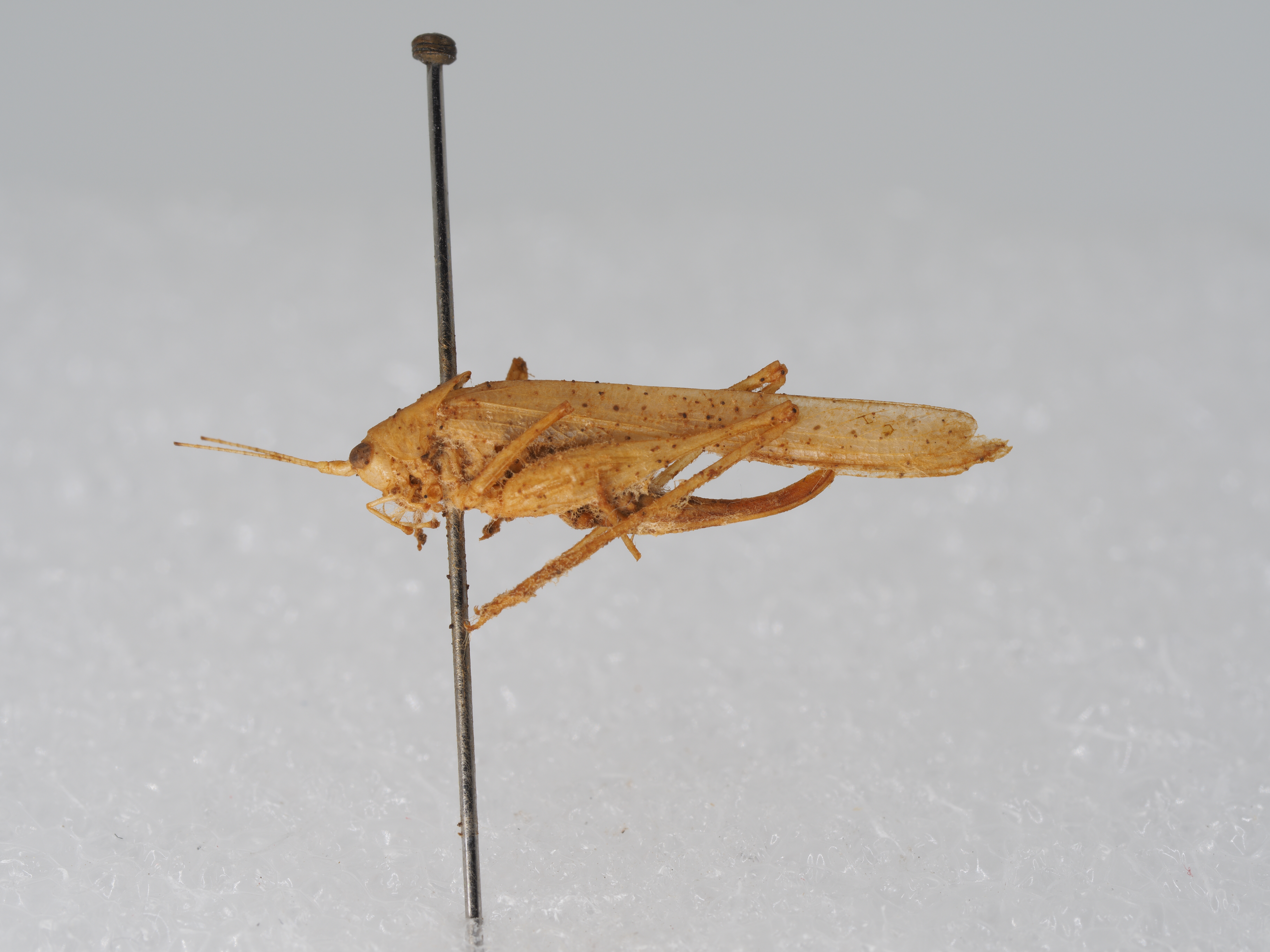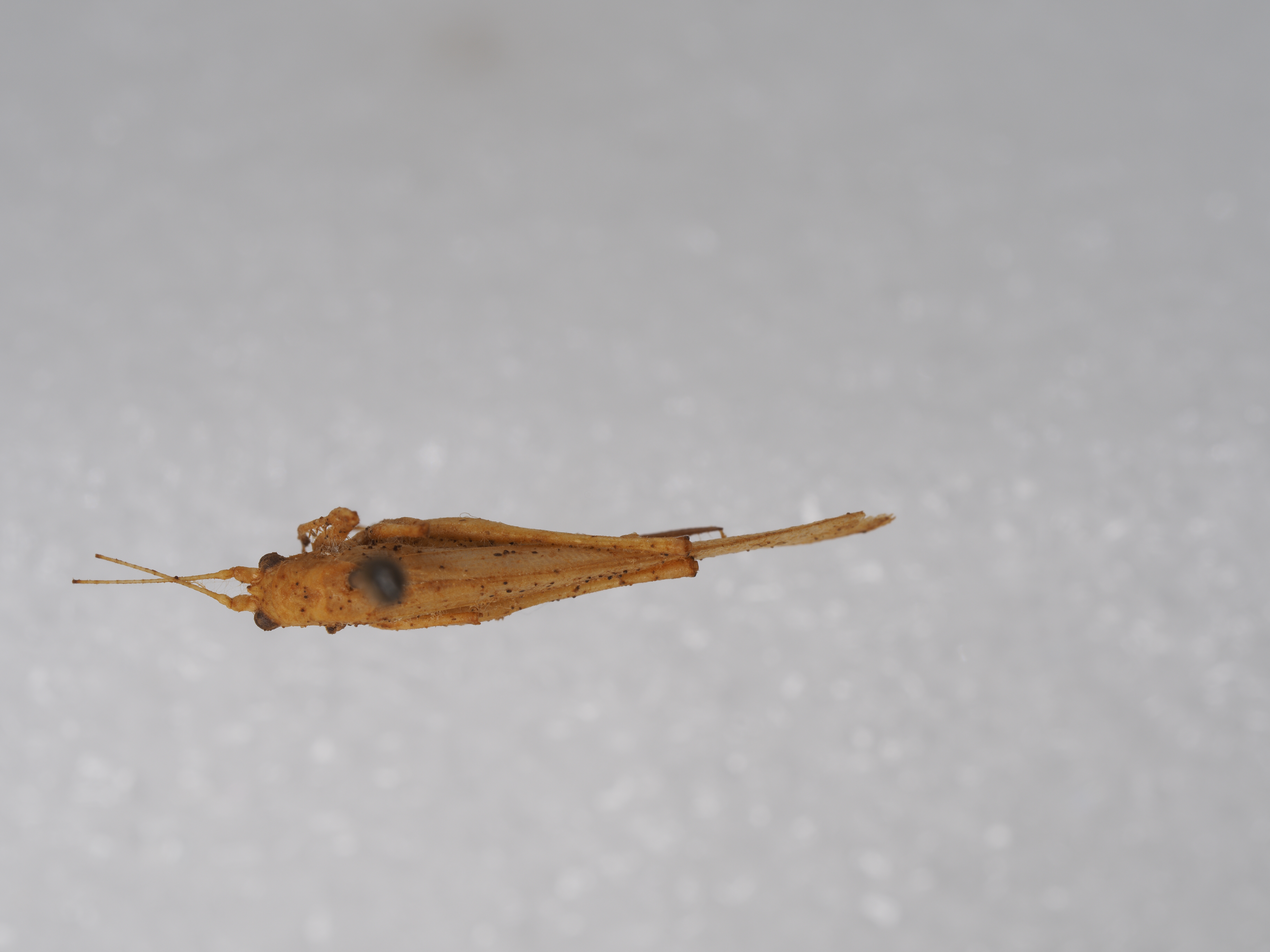 描述:雌性:体形甚小。头顶圆锥形,端部较圆钝,背面具沟。复眼圆形。突出。下颚须较细长,第5节端部稍扩大。前胸背板刨片后缘肩凹不基明显。前足基节具刺;各足股节腹面无刺前足胫腹面内、外刺排列形式为4,5(I,I)型;后足陉节背面内缘及外缘各具27-29小刺。前翅基发达颇远地超过后足股节端部后翅稍长于前翅。第8晚节背板后缘具较明显的侧凹(图12a),第7腹板稍向后突出,覆盖下生殖板基部,下生殖板圆三角形,基半部中央强收缩,两侧深凹陷,具明显的中隆脊(图12b)。产卵瓣较短,稍向上弯曲。