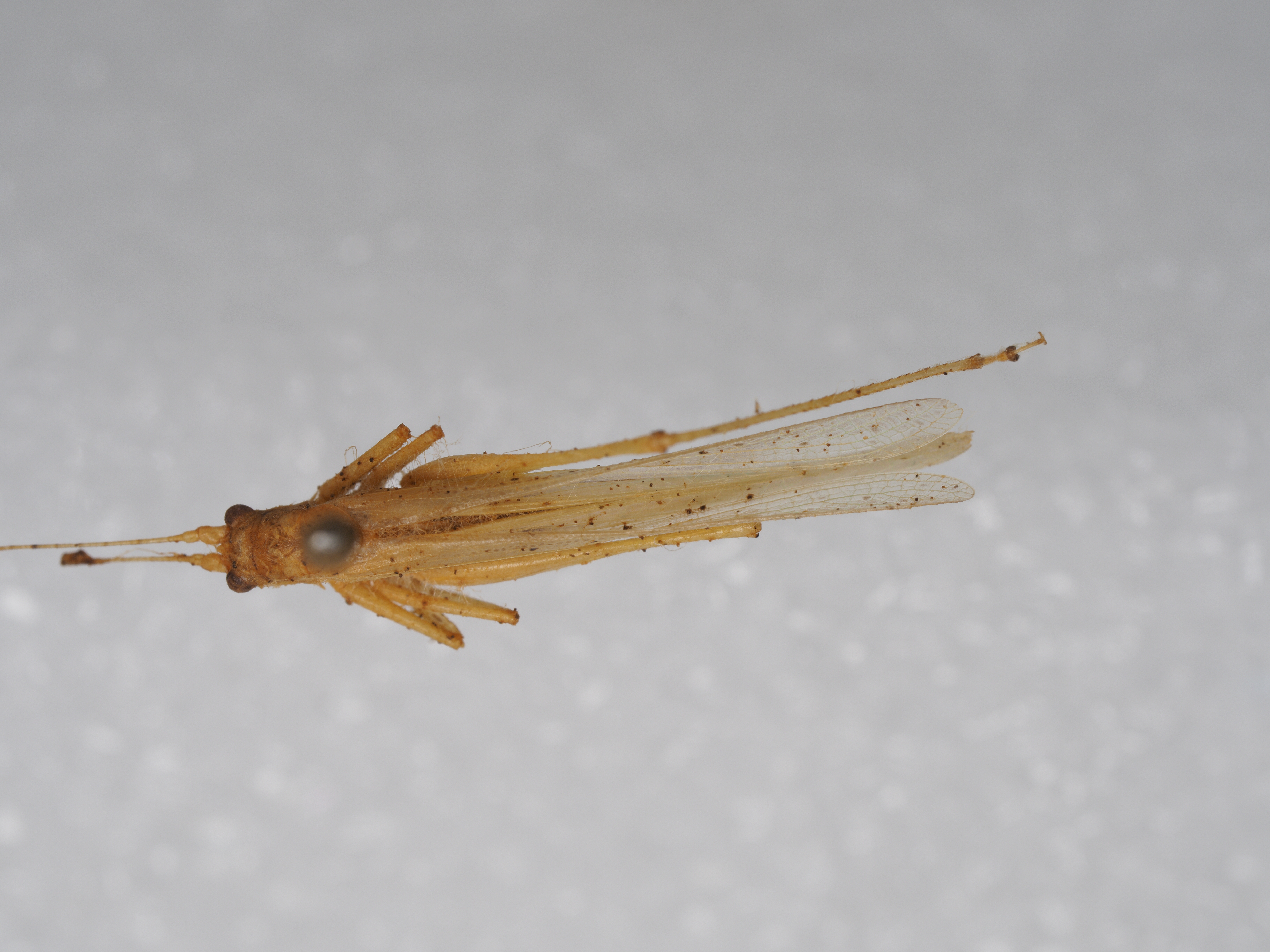 描述:雌性:体形甚小。头顶圆锥形,端部较圆钝,背面具沟。复眼圆形。突出。下颚须较细长,第5节端部稍扩大。前胸背板刨片后缘肩凹不基明显。前足基节具刺;各足股节腹面无刺前足胫腹面内、外刺排列形式为4,5(I,I)型;后足陉节背面内缘及外缘各具27-29小刺。前翅基发达颇远地超过后足股节端部后翅稍长于前翅。第8晚节背板后缘具较明显的侧凹(图12a),第7腹板稍向后突出,覆盖下生殖板基部,下生殖板圆三角形,基半部中央强收缩,两侧深凹陷,具明显的中隆脊(图12b)。产卵瓣较短,稍向上弯曲。