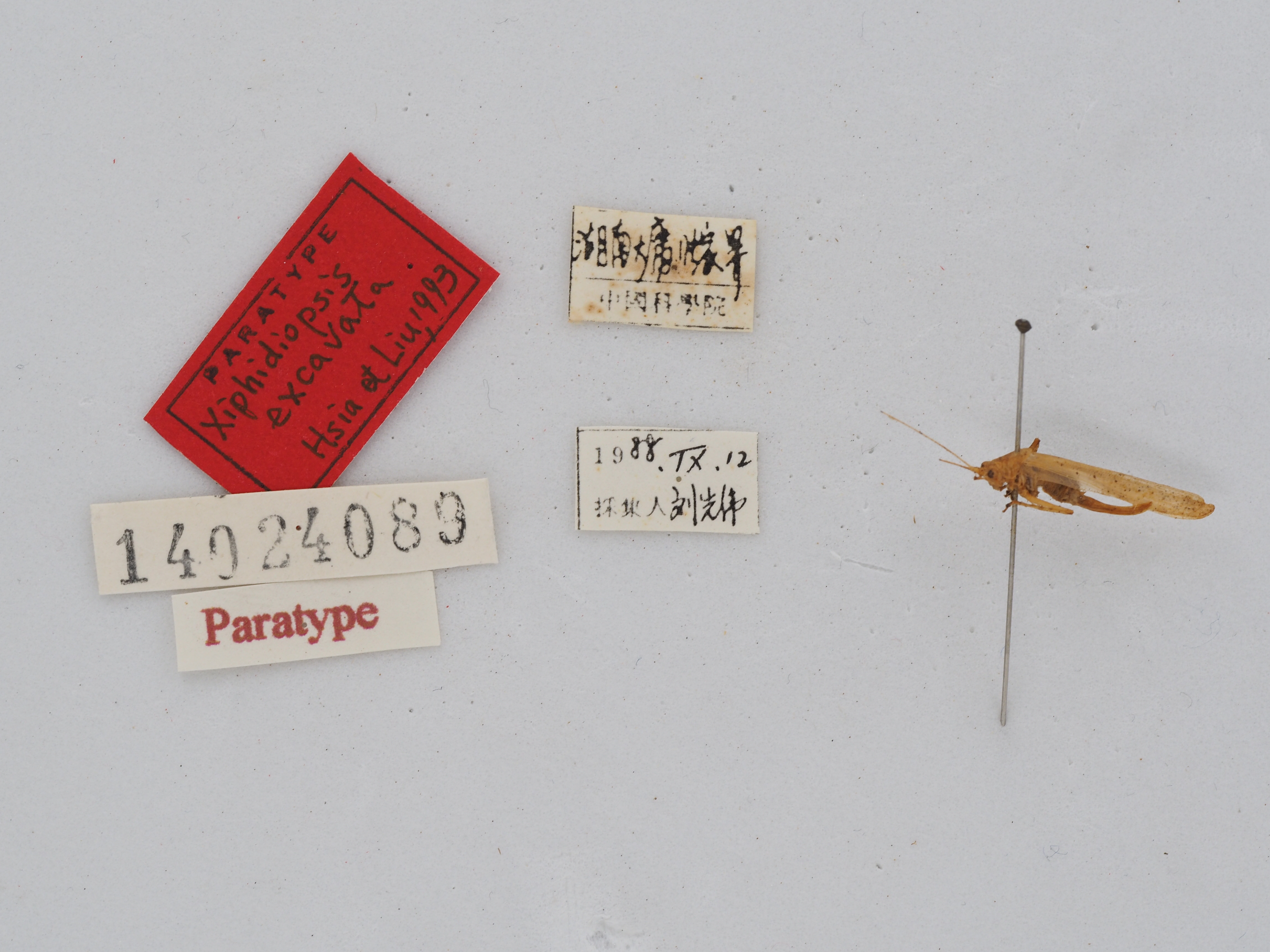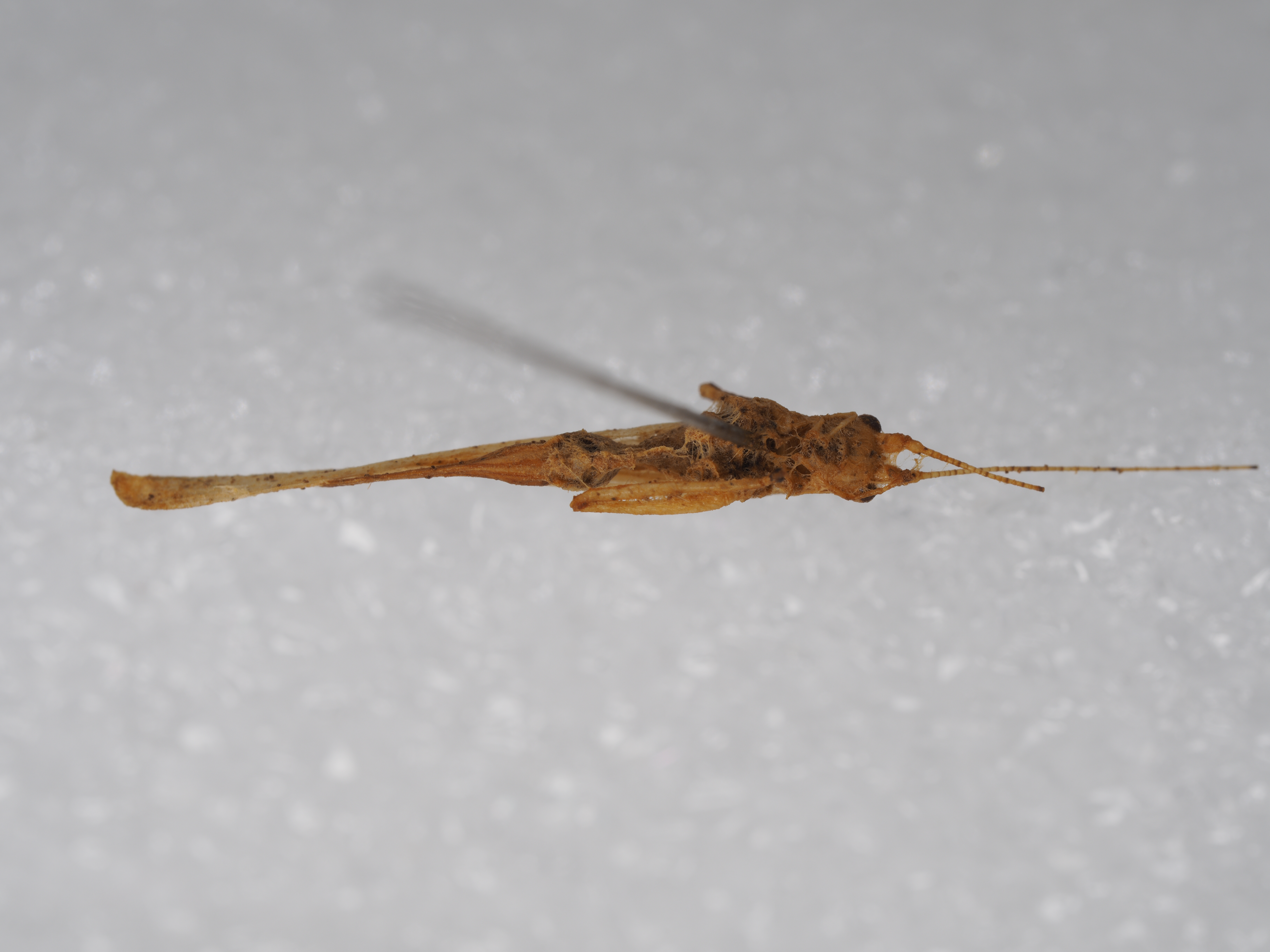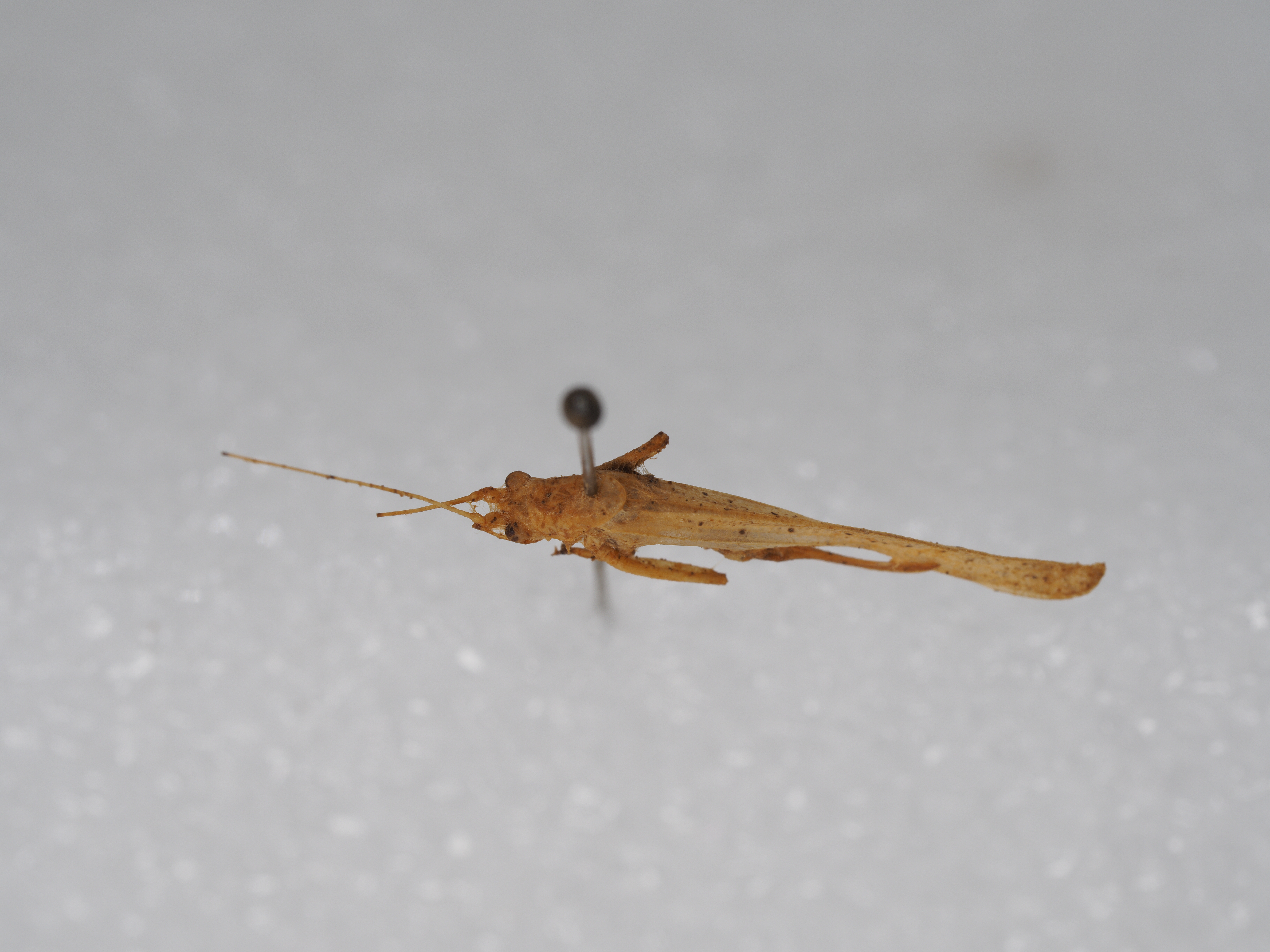 描述:雌性:体形甚小。头顶圆锥形,端部较圆钝,背面具沟。复眼圆形。突出。下颚须较细长,第5节端部稍扩大。前胸背板刨片后缘肩凹不基明显。前足基节具刺;各足股节腹面无刺前足胫腹面内、外刺排列形式为4,5(I,I)型;后足陉节背面内缘及外缘各具27-29小刺。前翅基发达颇远地超过后足股节端部后翅稍长于前翅。第8晚节背板后缘具较明显的侧凹(图12a),第7腹板稍向后突出,覆盖下生殖板基部,下生殖板圆三角形,基半部中央强收缩,两侧深凹陷,具明显的中隆脊(图12b)。产卵瓣较短,稍向上弯曲。