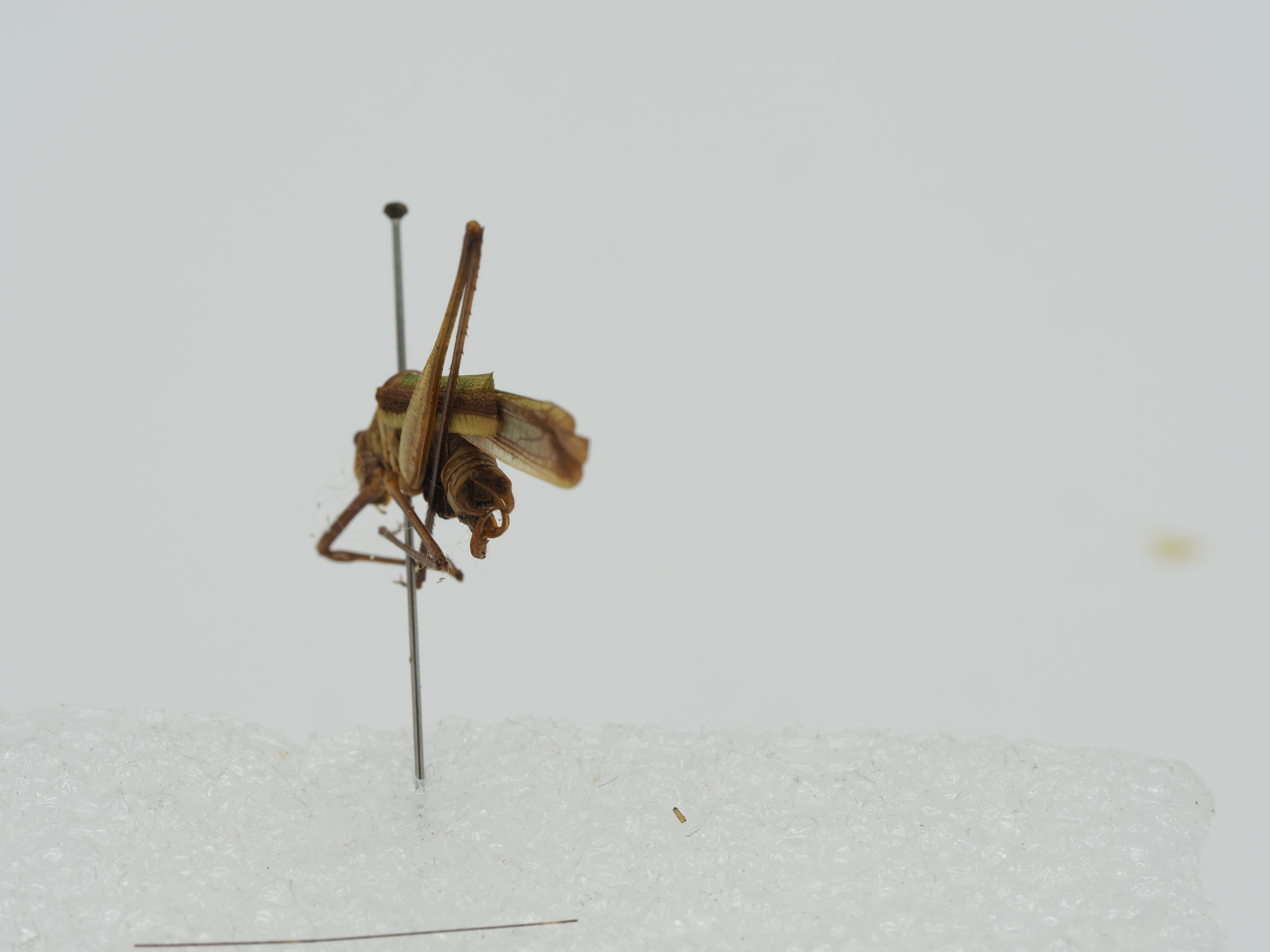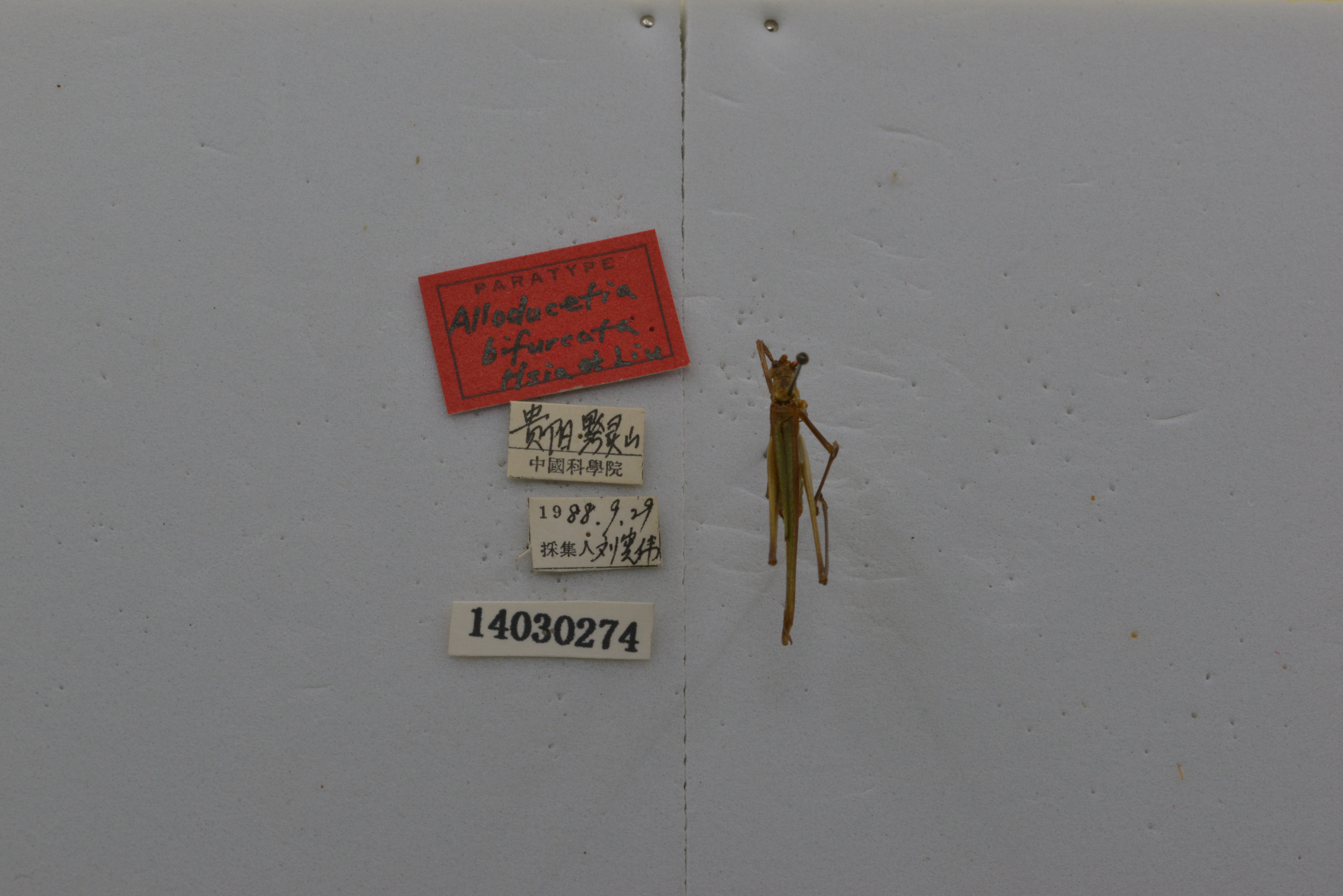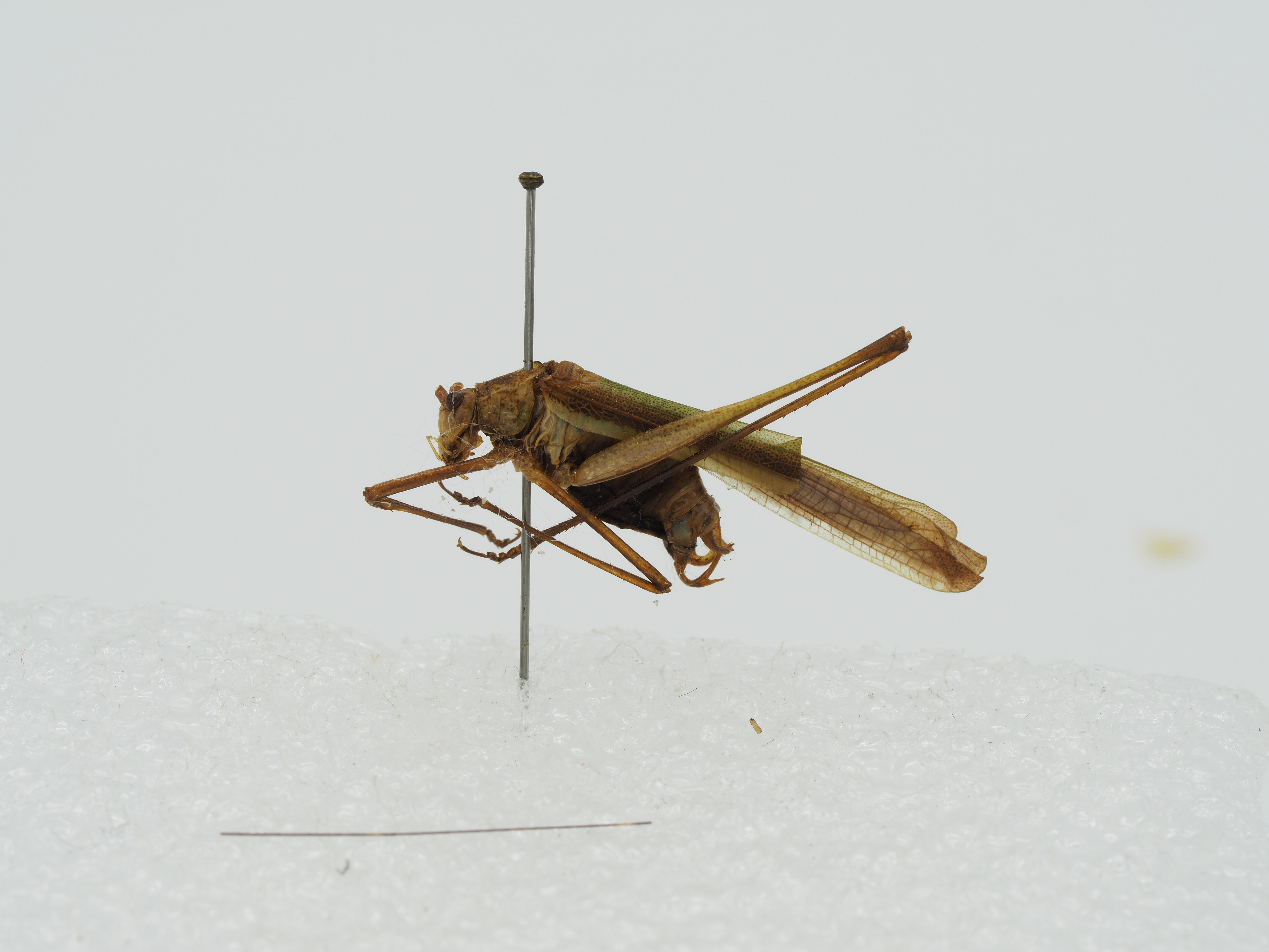 雌性 前翅不到达后足腿节端部,后翅稍长于前翅。产卵器侧扁,强向上弯曲,边