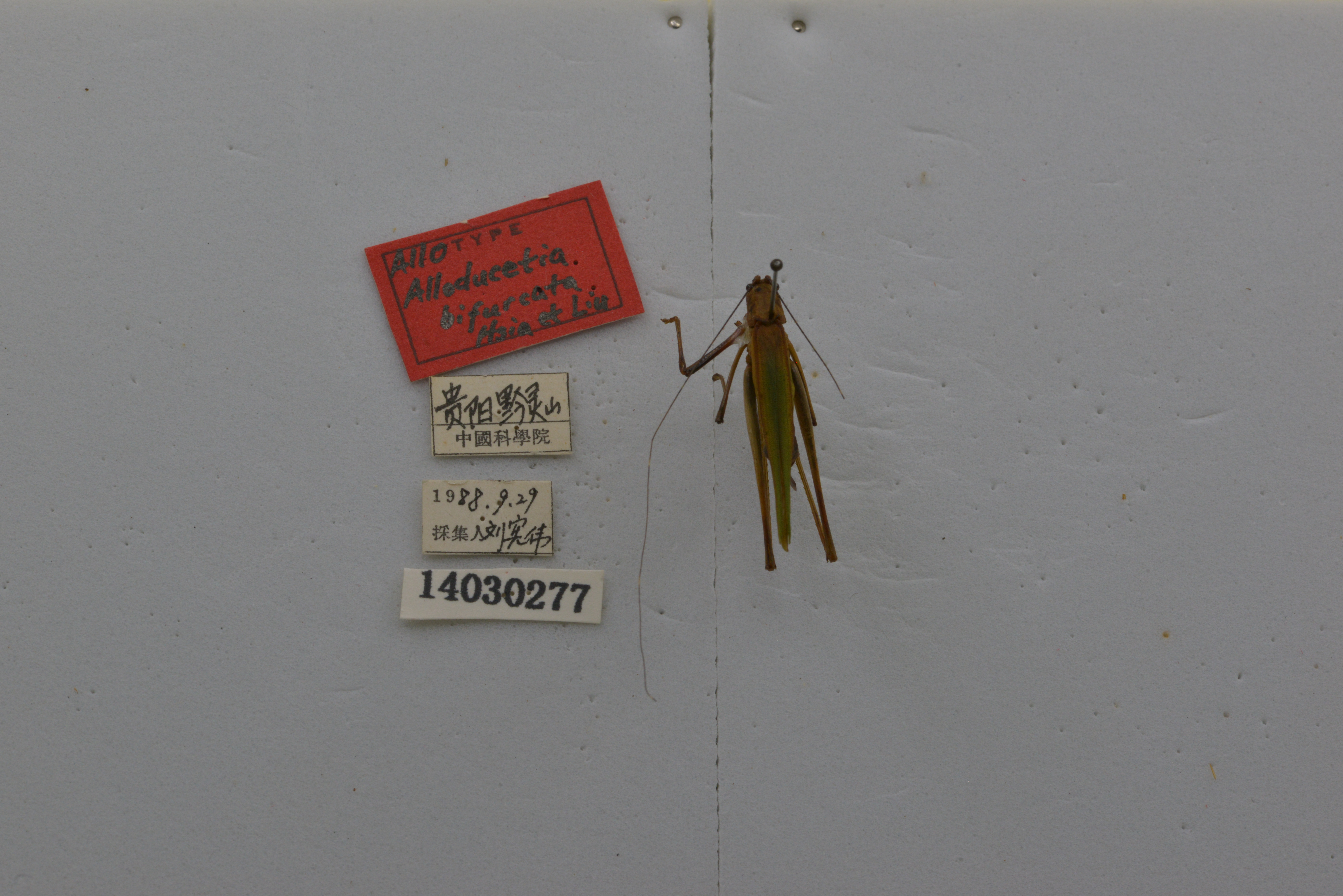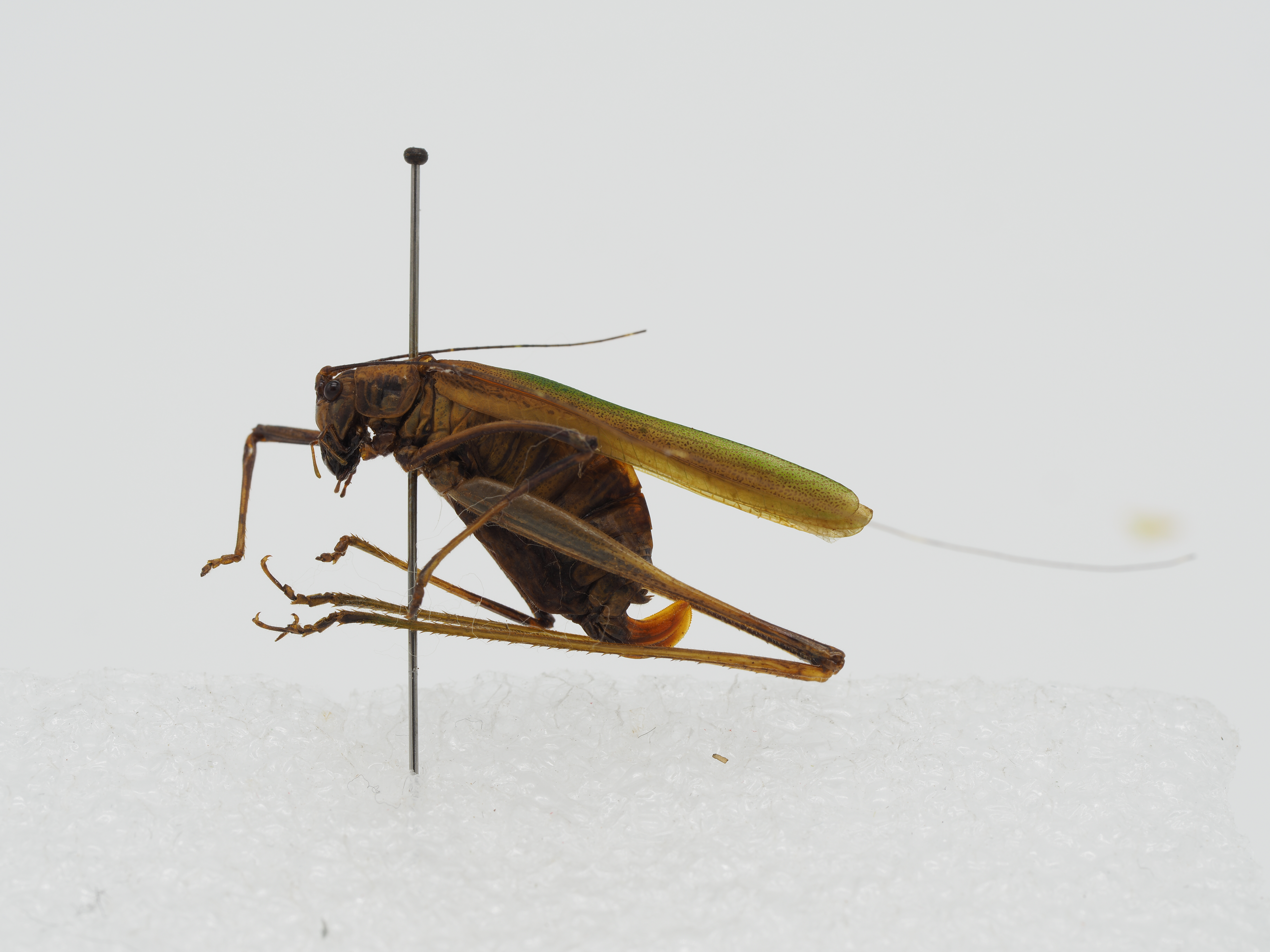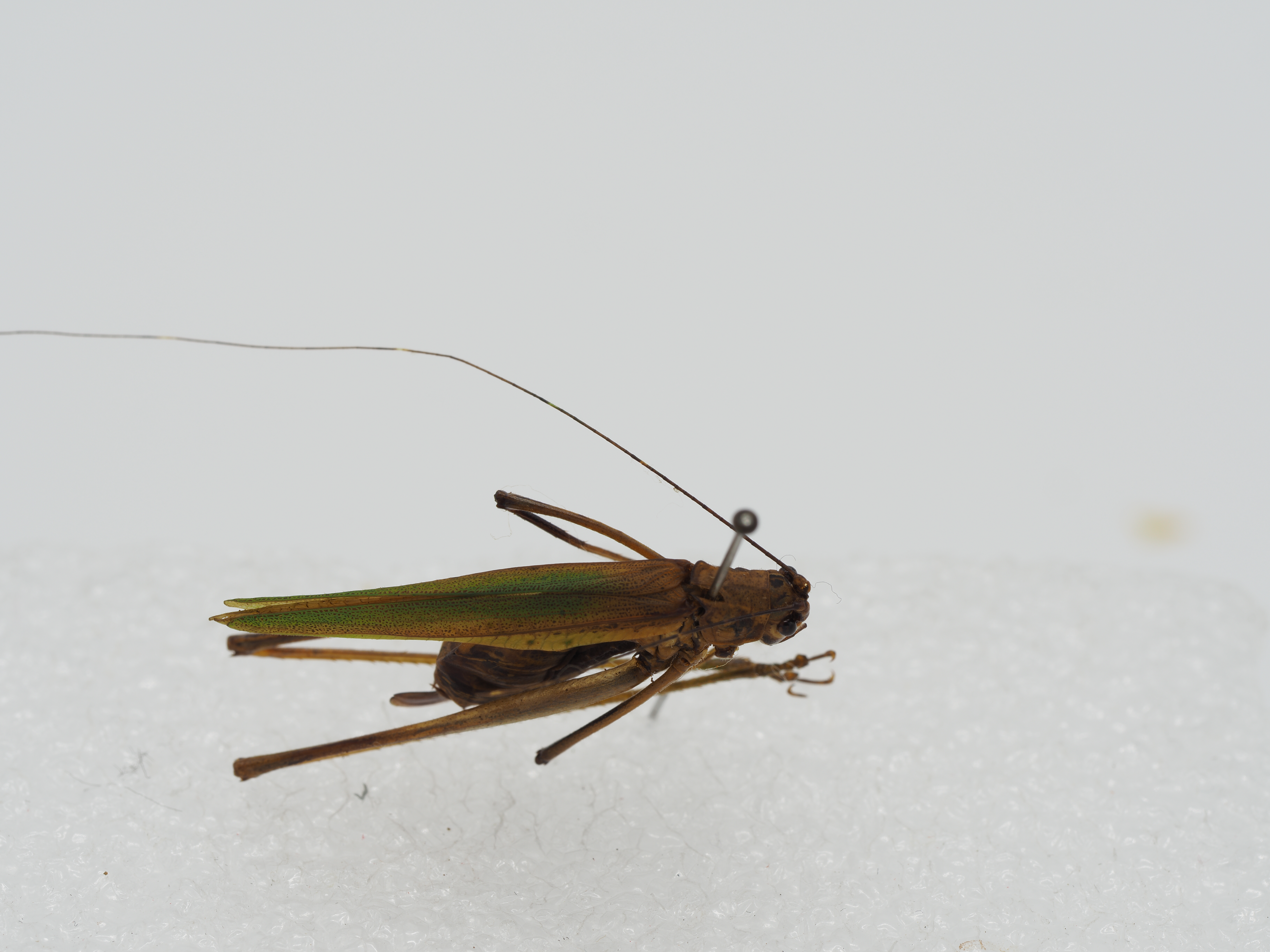 雌性 前翅不到达后足腿节端部,后翅稍长于前翅。产卵器侧扁,强向上弯曲,边