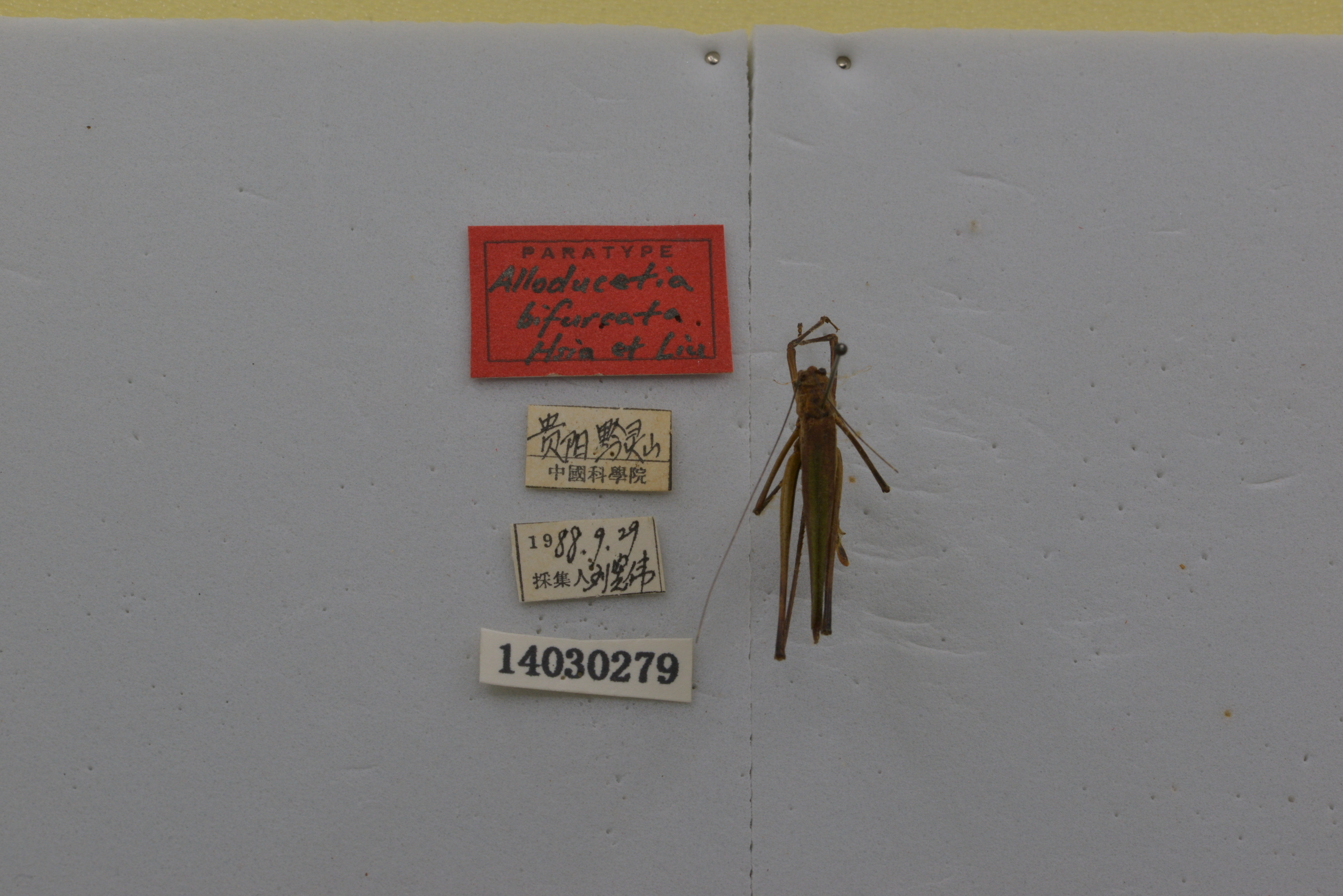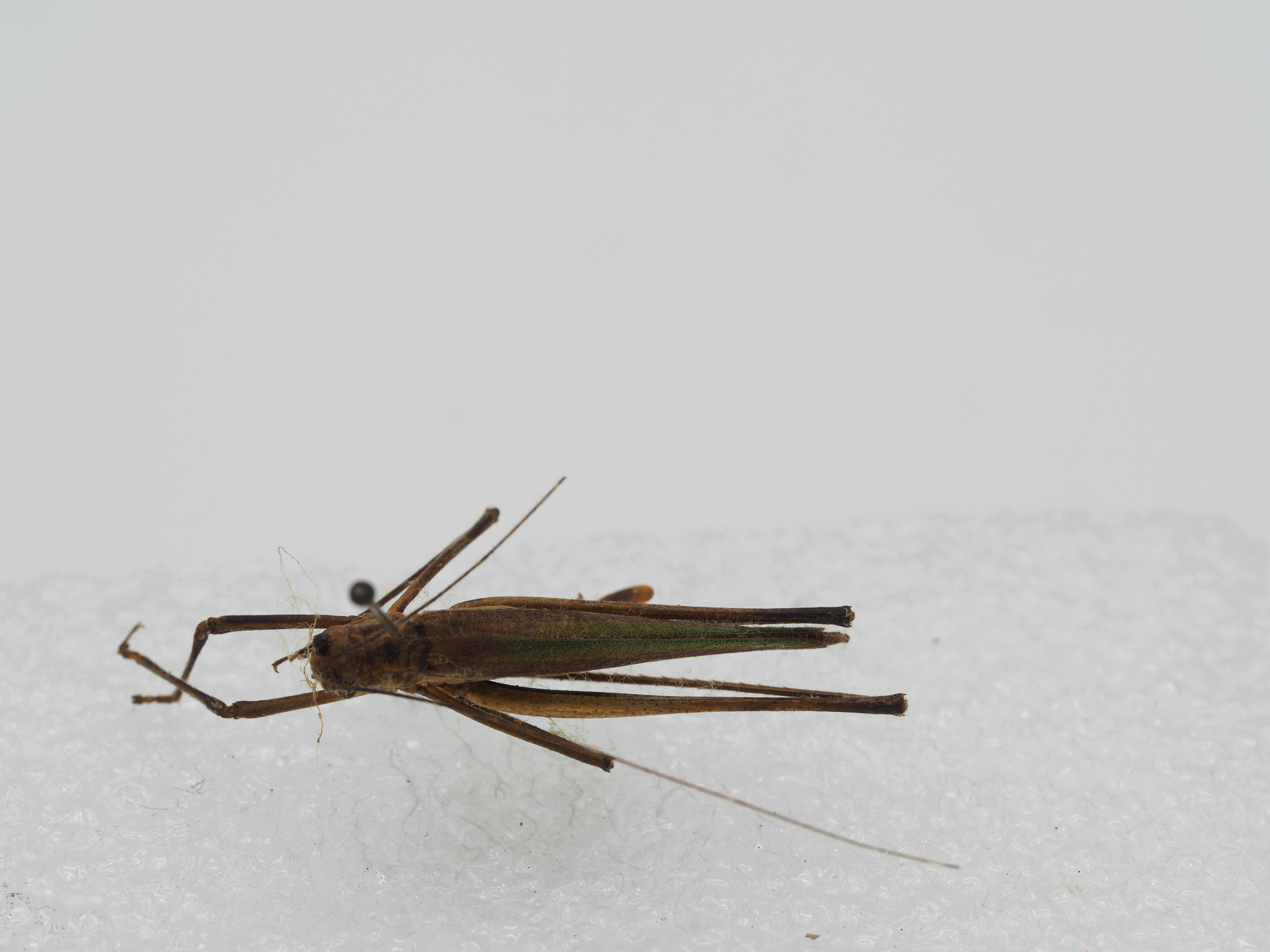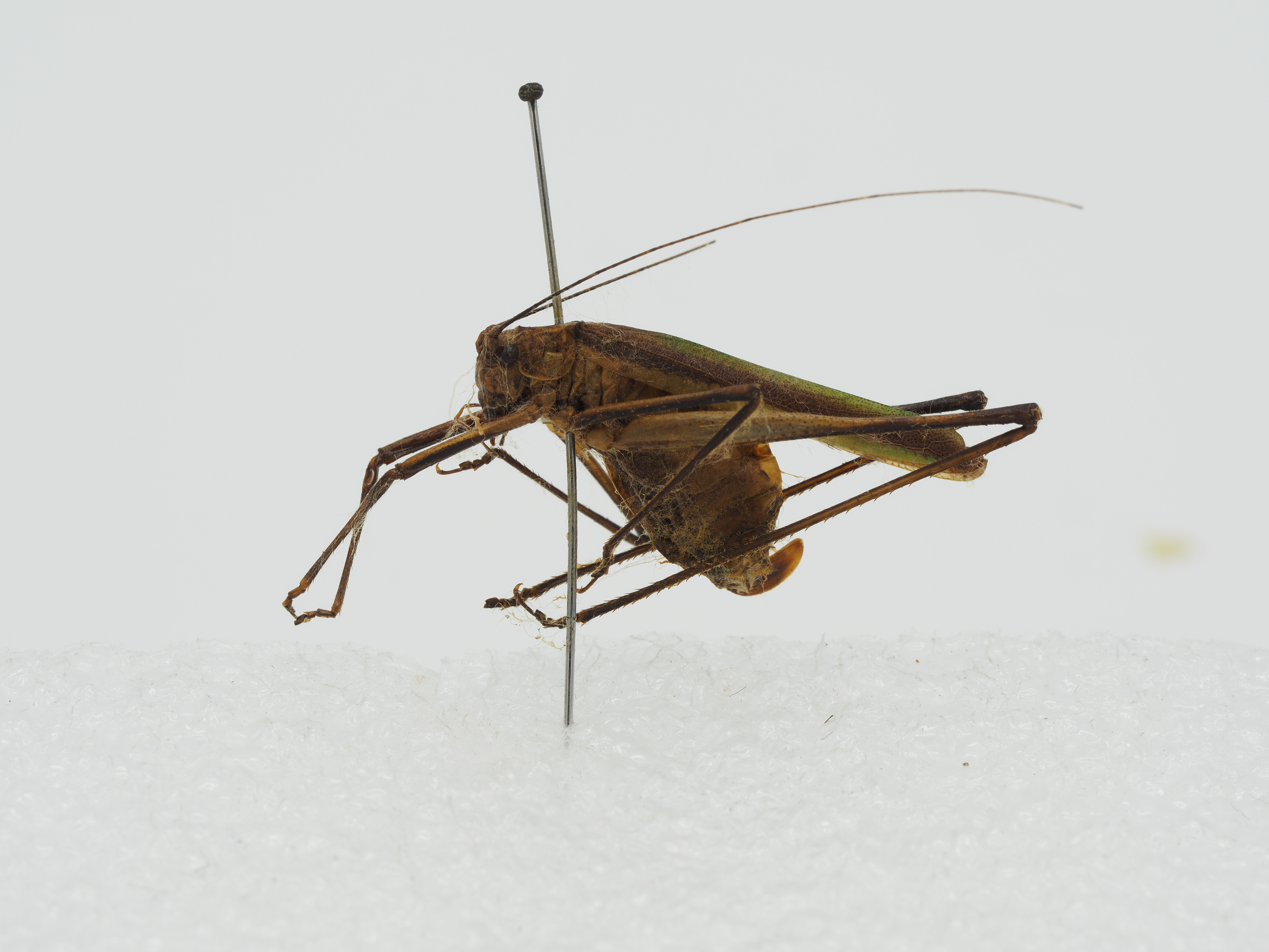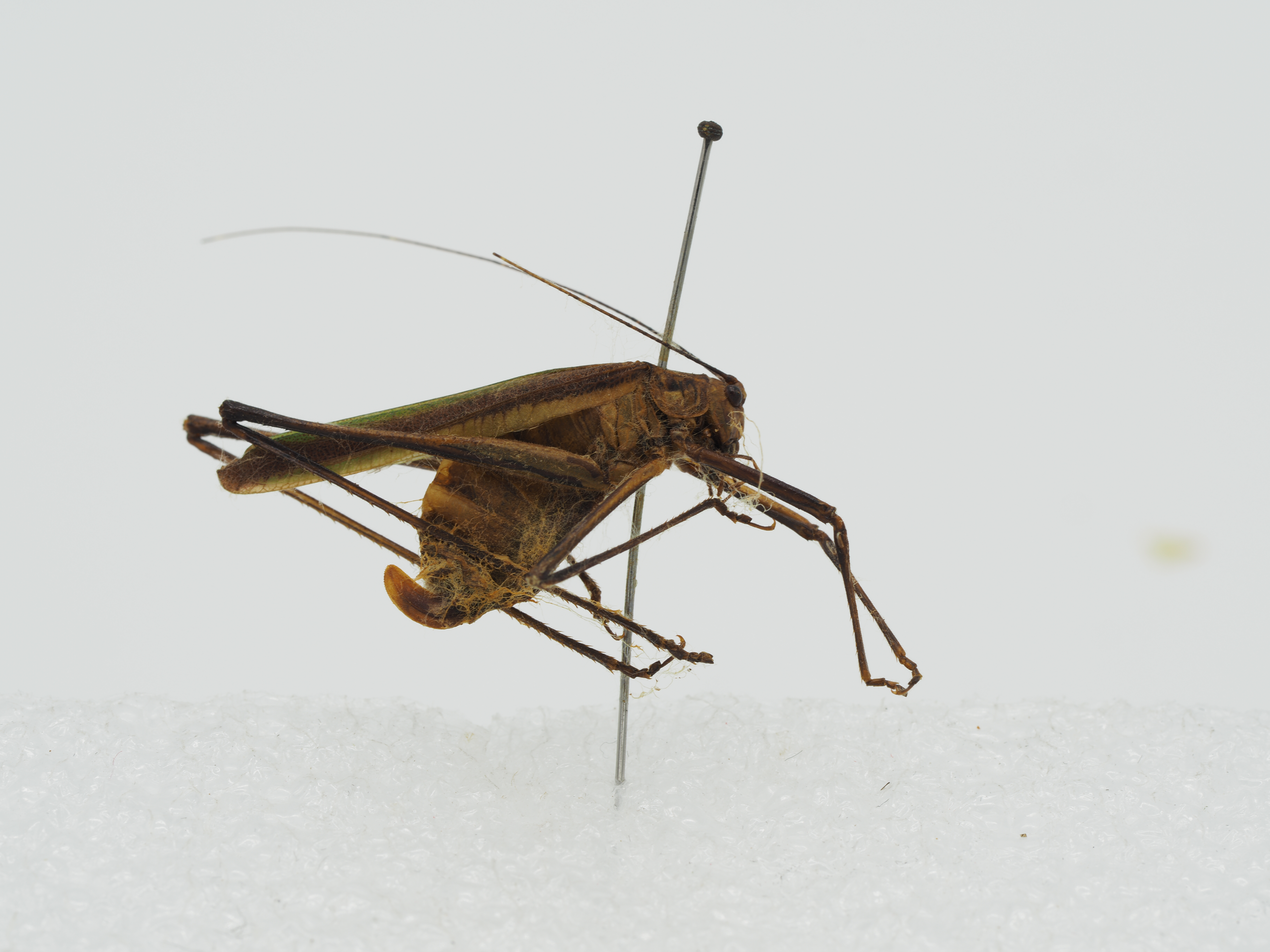雌性 前翅不到达后足腿节端部,后翅稍长于前翅。产卵器侧扁,强向上弯曲,边