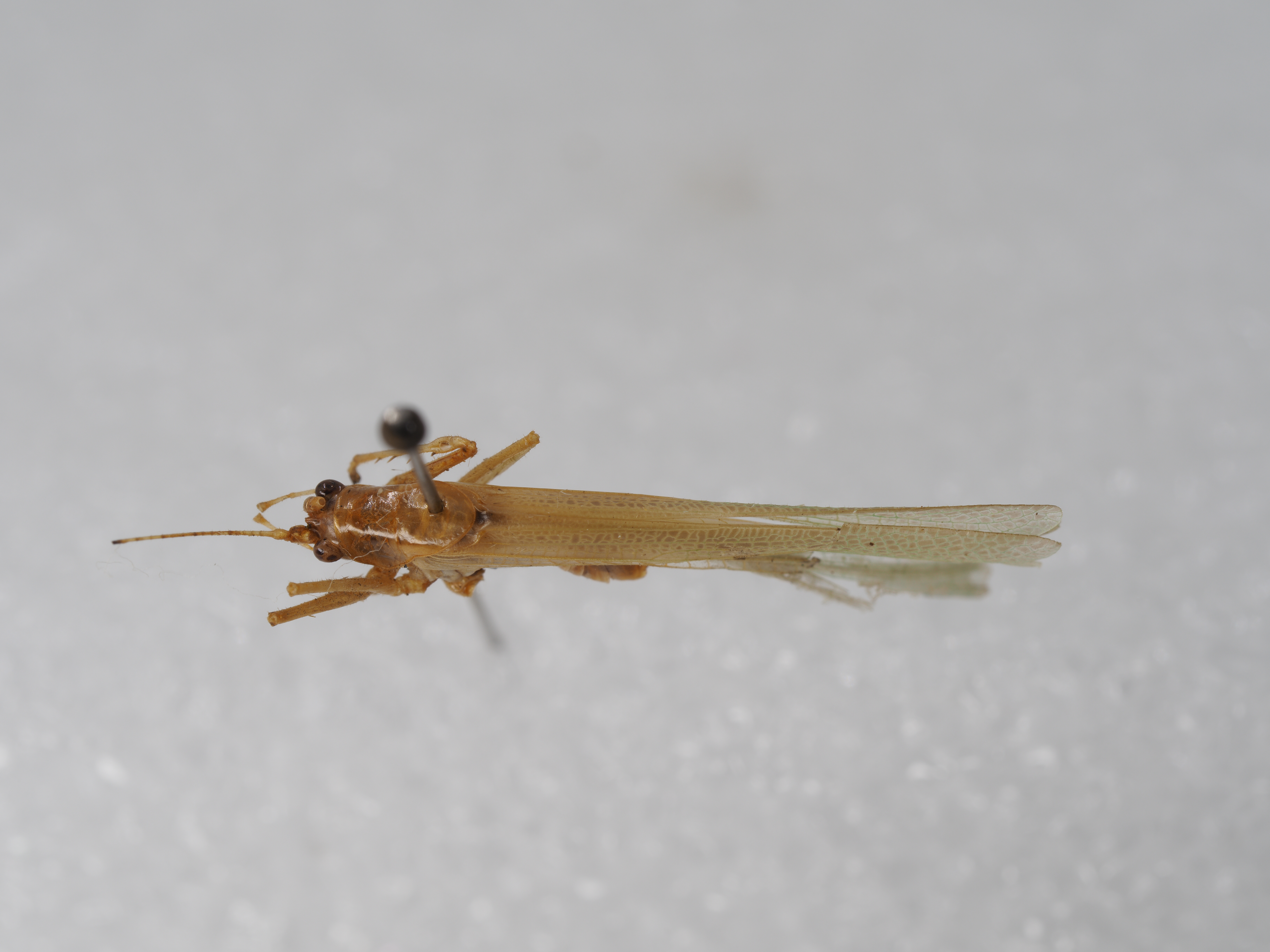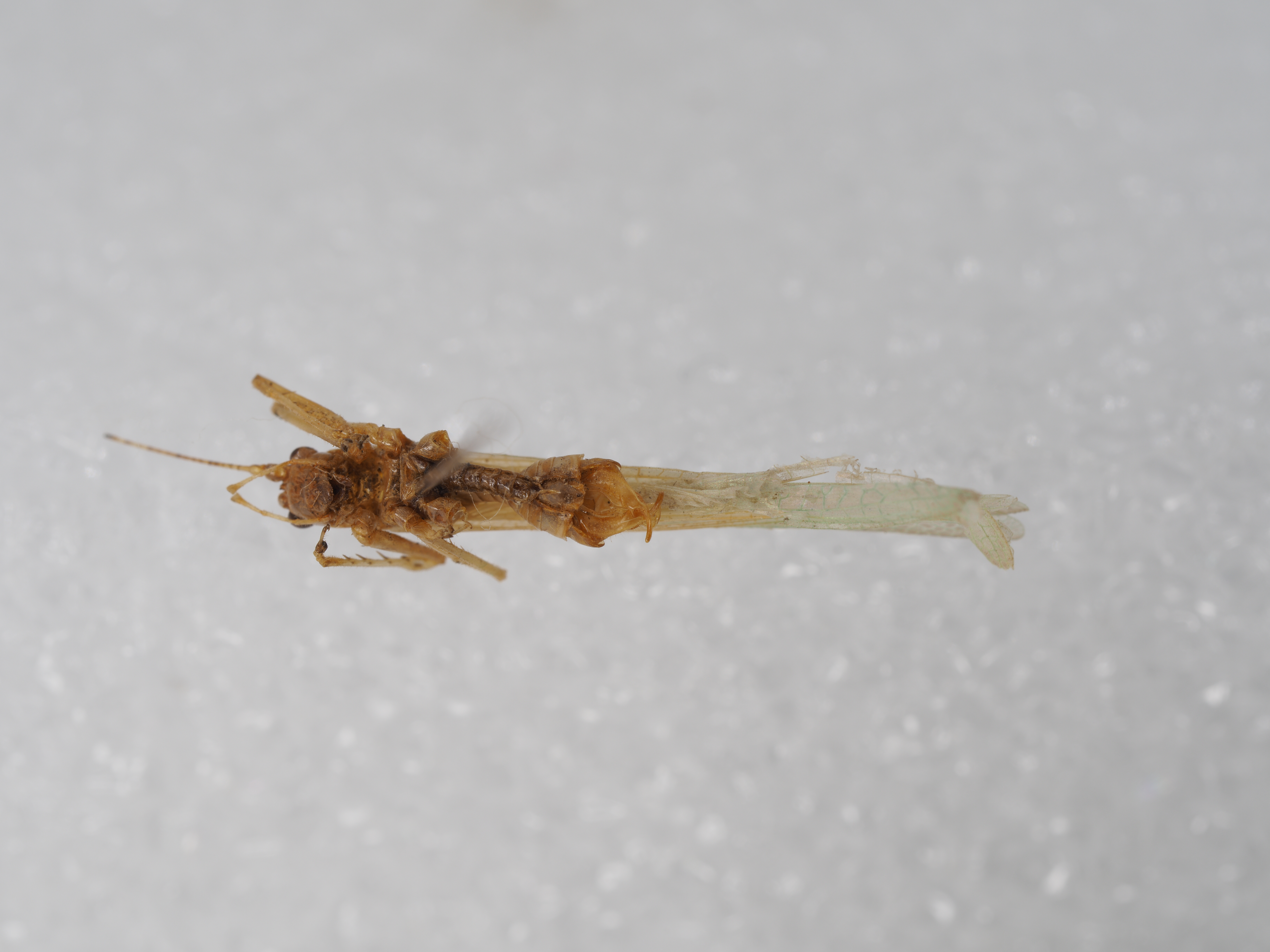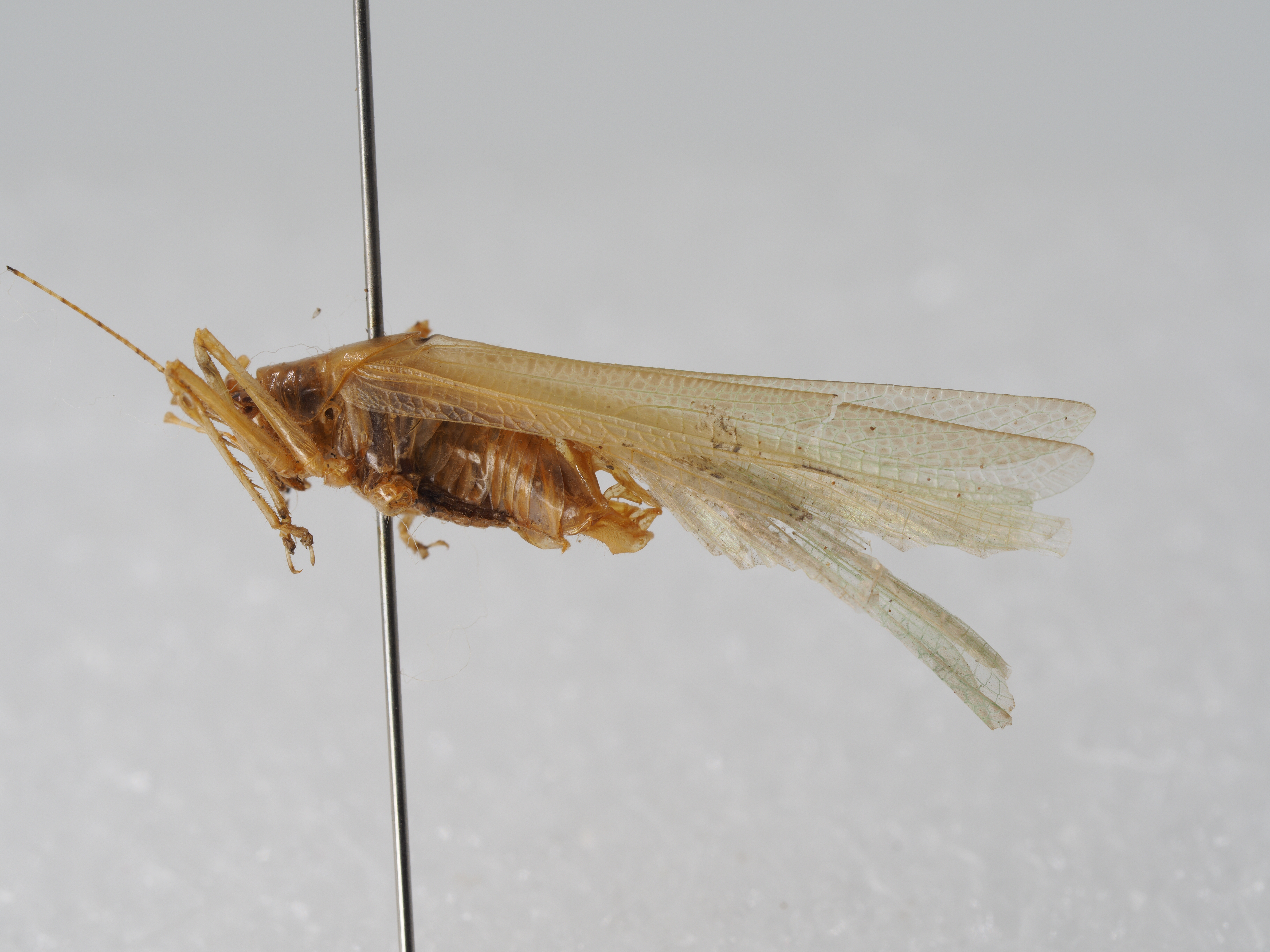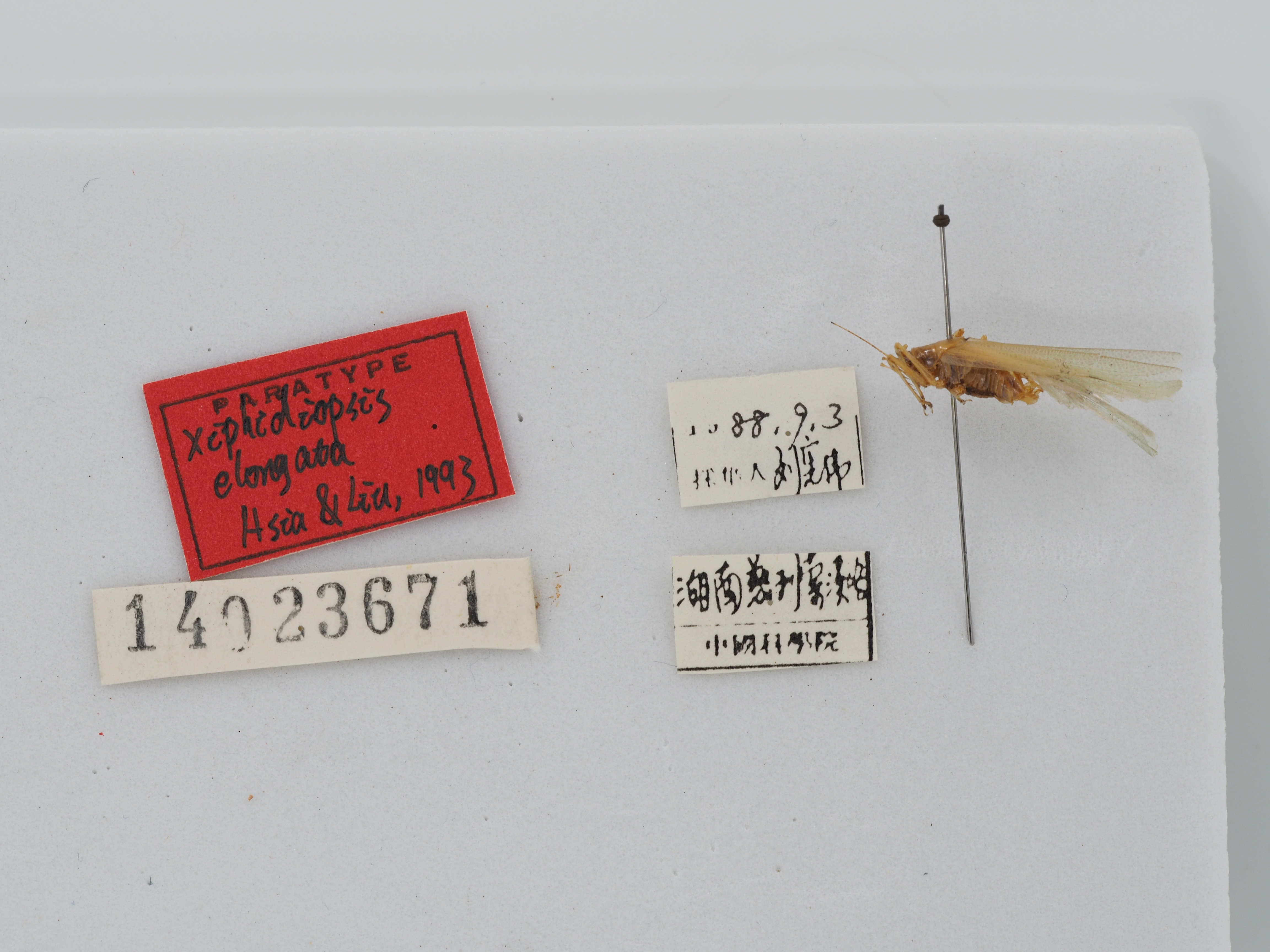 描述:雄性:体小形。头顶圆锥形,端部较钝,背面具沟。复眼圆形,突出。下颚须第5节与第4节约等长;端部稍扩大。前胸背板侧片后缀肩凹明显。前足基节具刺前足胫节腹面内、外刺排列形式为4,5(1,1)型后足胫节背面内援及外缘各具26-30小刺。前翅发达,颇远地超过后足股节端部后翅长于前翅。第10晚节背板后缘中部强向后延长,基部稍侧扁和隆起,其余部分扁平,侧缘下弯,顶端圆截形(图13a)腹面具一较大的突起,前端指向度方(图13b)。尾须基半部朝背应向扩宽,内部稍凹陷、内中部具斜置的附叶三尾须端半部趋细,向内上方弯曲。下生殖板较小,后缘稍凸形腹刺较短粗,位于后缘两侧。